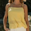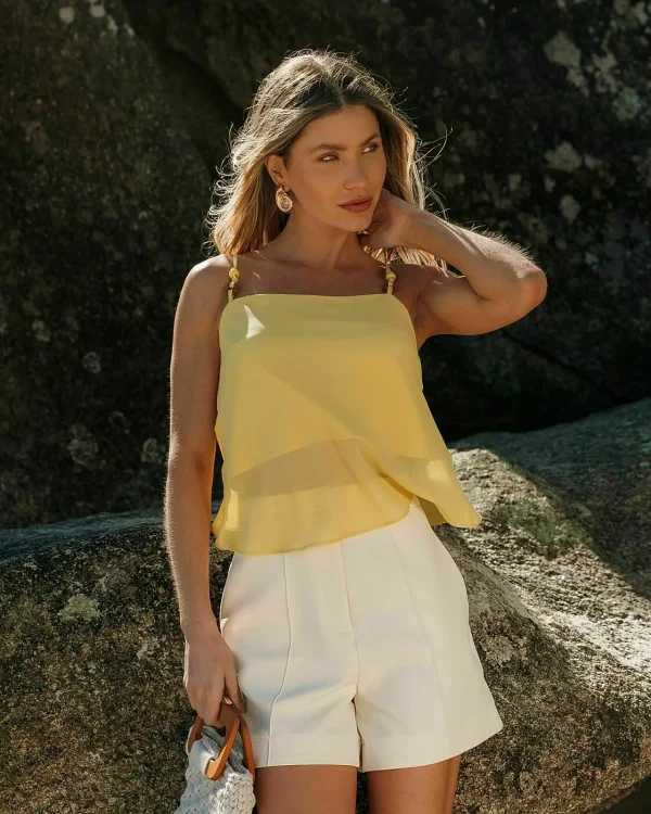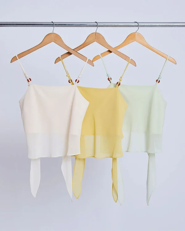 Delicada e cheia de frescor, a regata em chiffon é perfeita para iluminar qualquer produção. As alcinhas finas reguláveis garantem conforto e ajuste, enquanto o detalhe de aviamentos na alça traz charme sutil e moderno. O laço para amarração nas costas adiciona feminilidade e cria um visual leve e elegante. O chiffon, com sua transparência delicada, confere movimento fluido e atemporalidade à peça.
