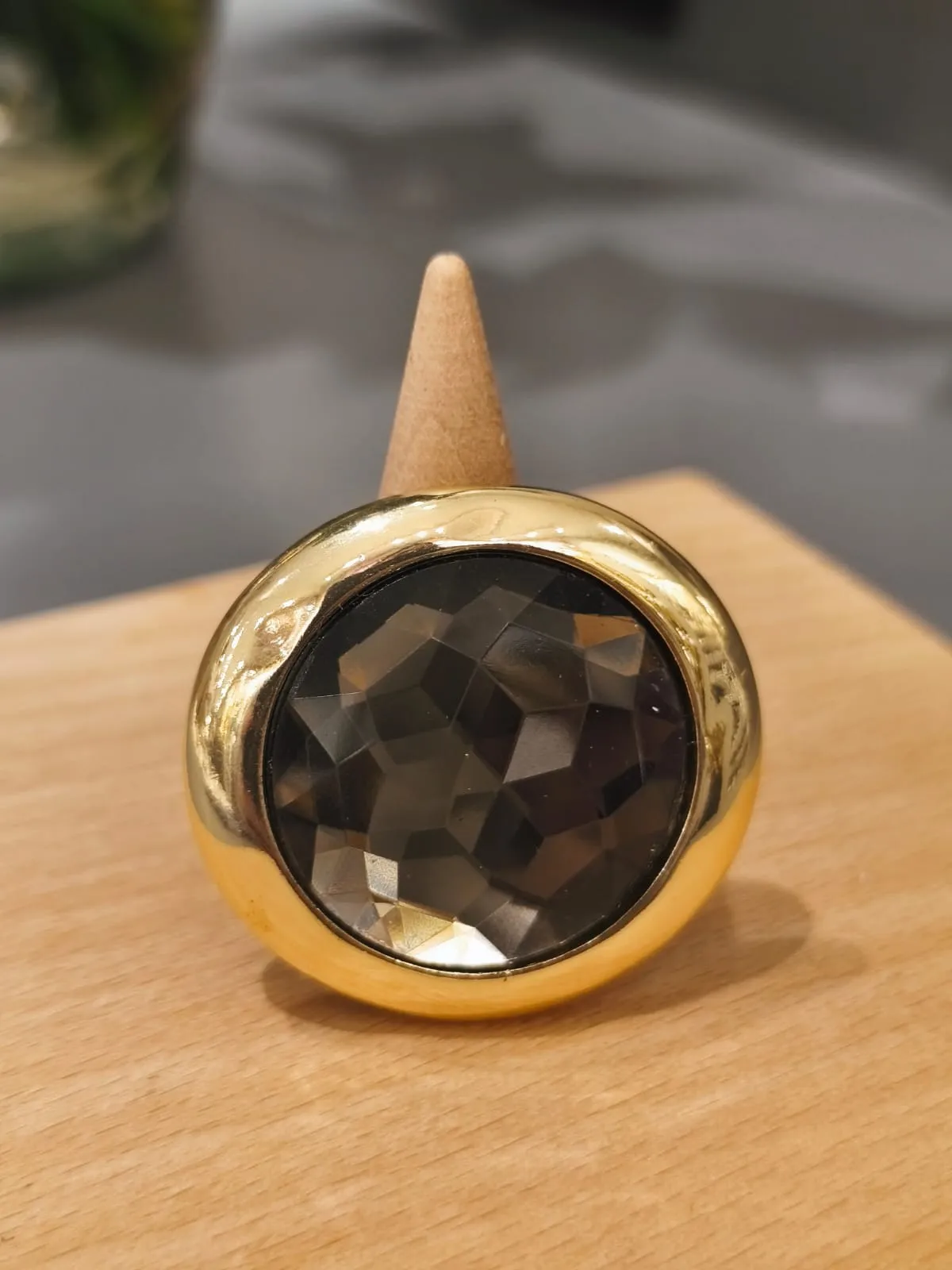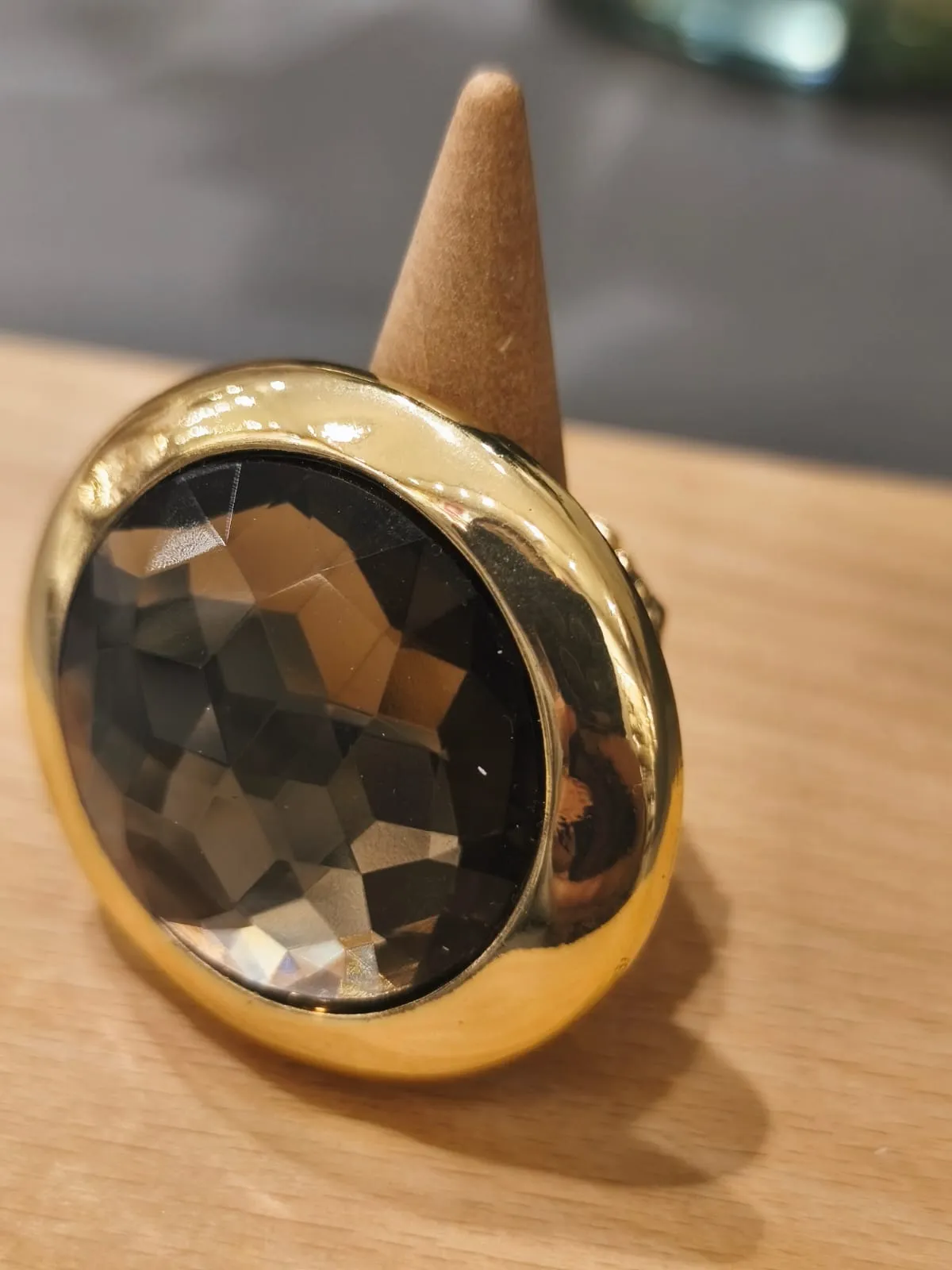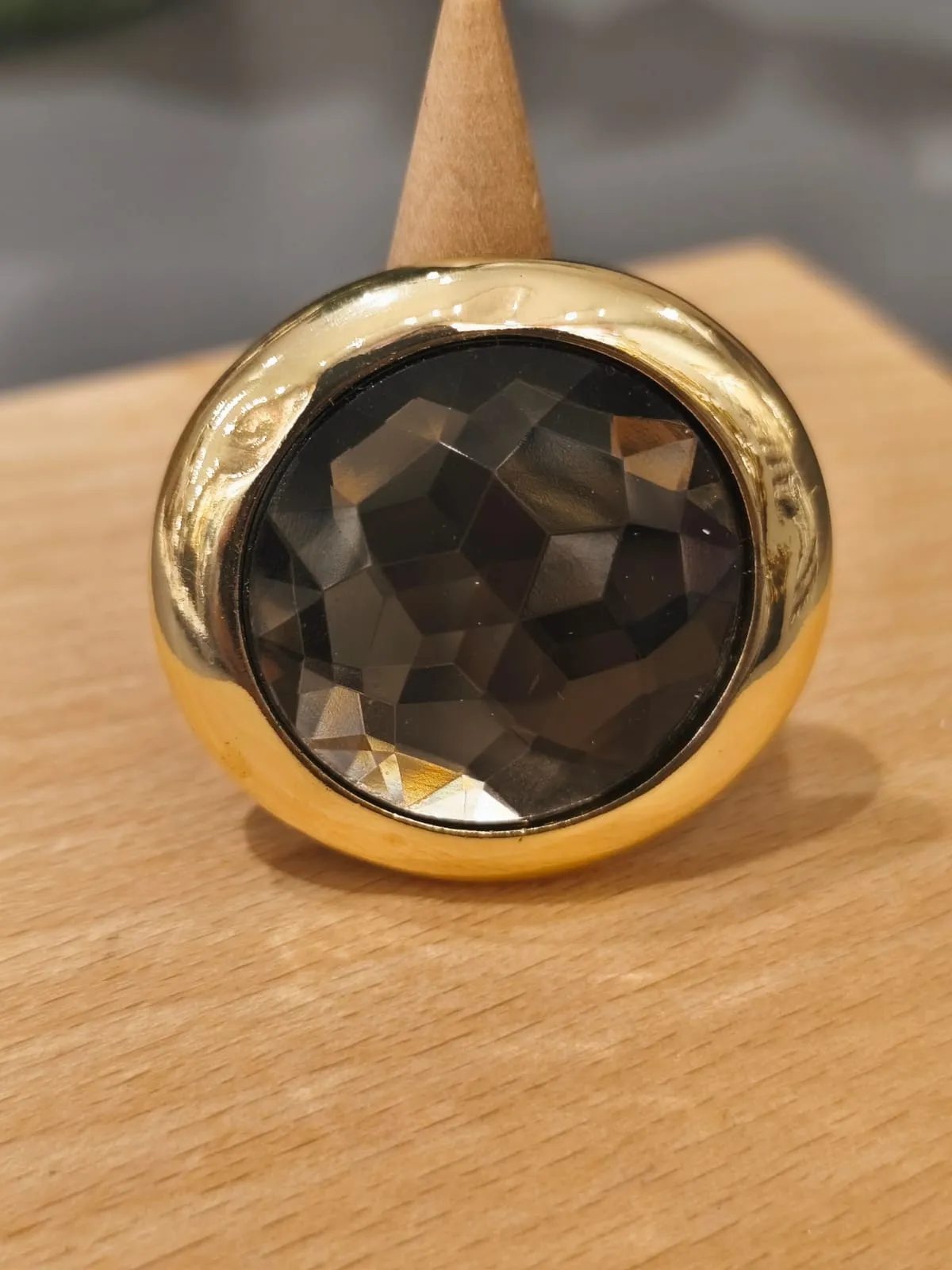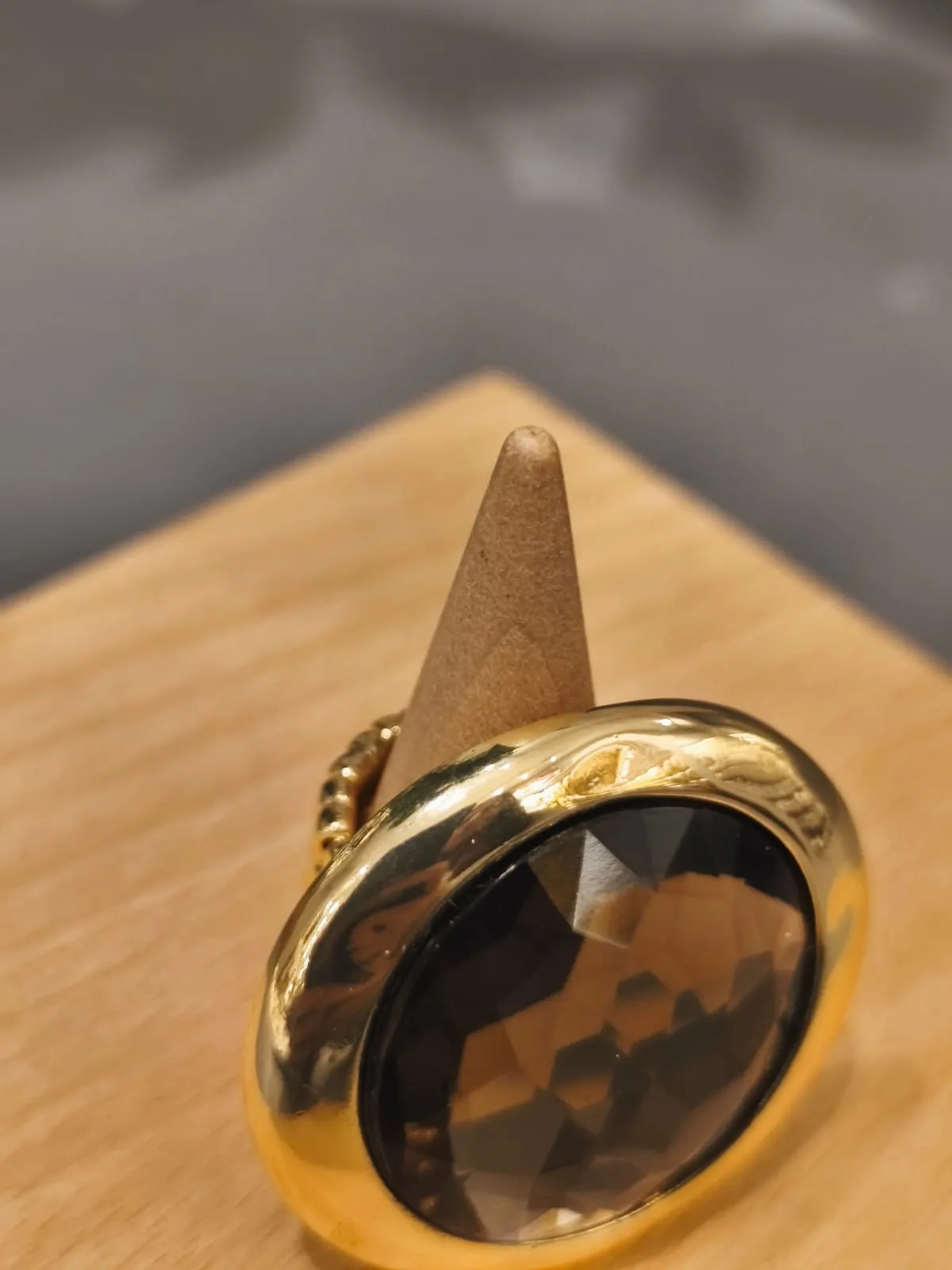 Dica de estilo: combine o anel dourado chaton fumê com outras joias douradas de linhas simples e um look em tons de marrom, preto ou caramelo — o resultado é uma composição sofisticada e atemporal, com um toque de poder.