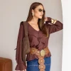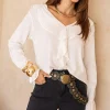 Bata em Tecido Leve com Babados – confeccionada em material macio e confortável (97% viscose, 3% elastano). Possui decote V com babados que trazem delicadeza e elástico nas mangas para ajuste e charme extra.