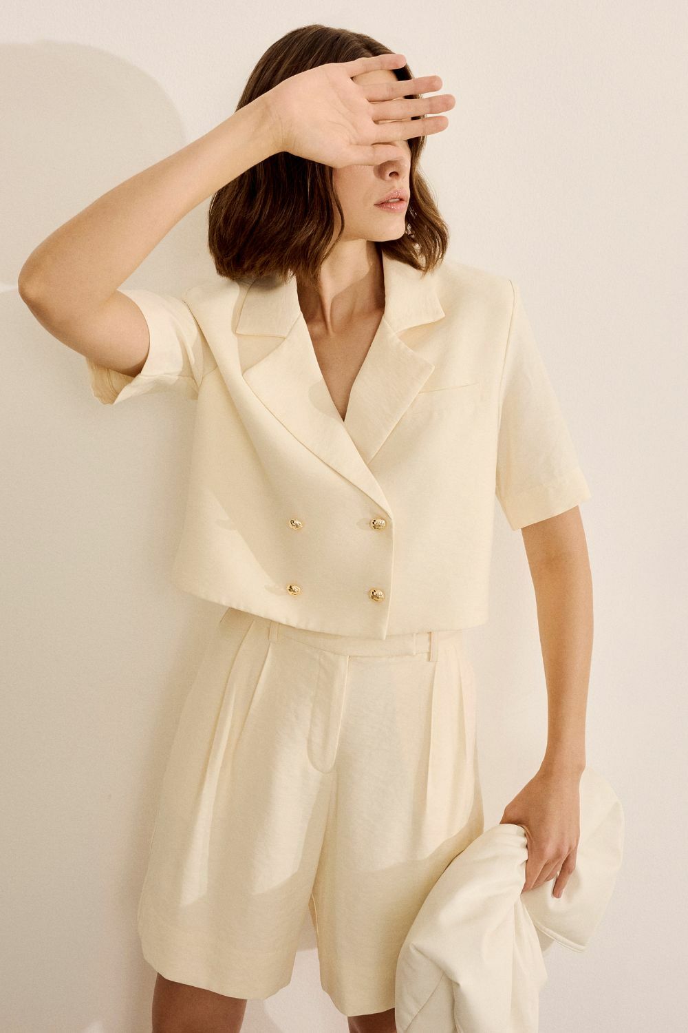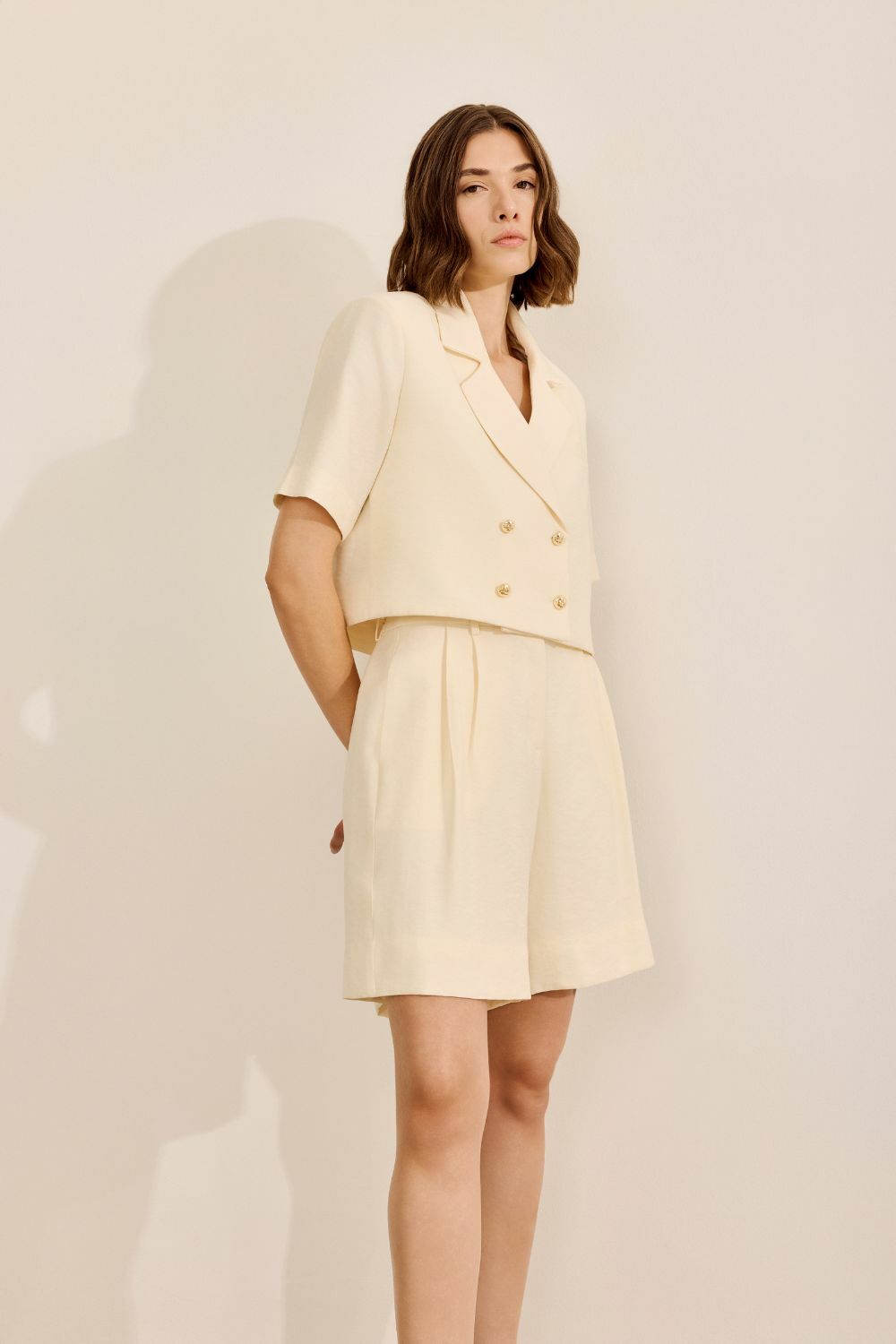 Ficha técnica: bermuda confeccionada em tecido com composição de 92% viscose e 8% poliéster, cós transpassado com abotoamento interno, pregas frontais que garantem elegância ao caimento, comprimento clássico, cor sofisticada, peça de origem nacional, com observação de que apenas a variante creme possui forro 100% viscose, recomendando-se lavagem à mão ou em ciclo delicado, secagem à sombra e passagem em temperatura baixa para preservar o tecido e a modelagem.