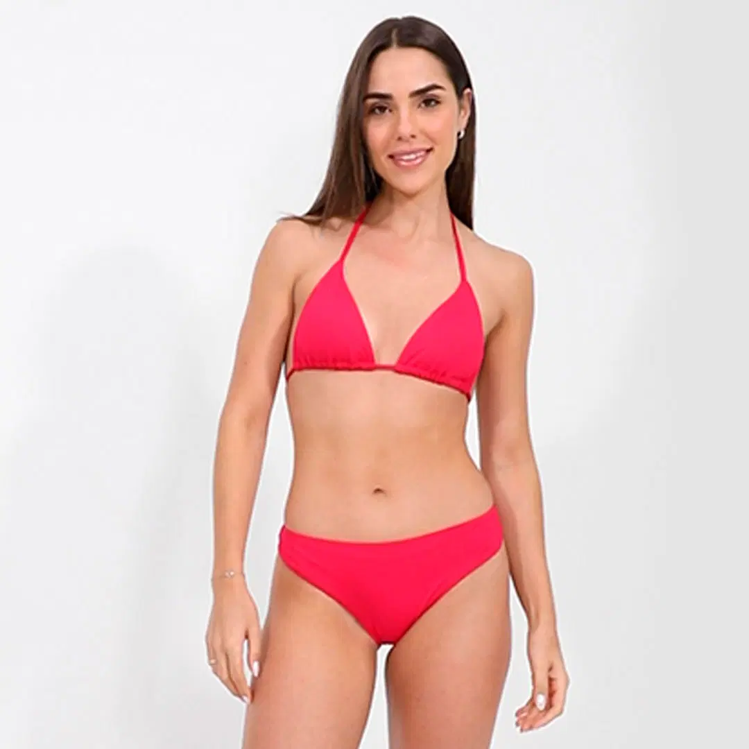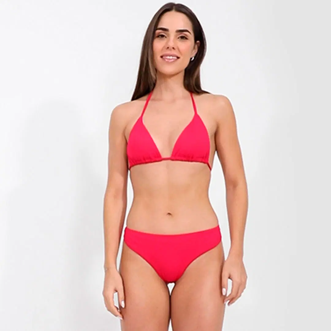 Ficha técnica: confeccionado em tecido de alta elasticidade com toque macio, top triângulo com ajuste, detalhes em termocolante aplicados com tecnologia de alta fixação, calcinha de laterais médias, cor vermelho rosado, produção nacional, lavar à mão com sabão neutro e secar à sombra para preservar os termocolantes e a elasticidade do tecido.