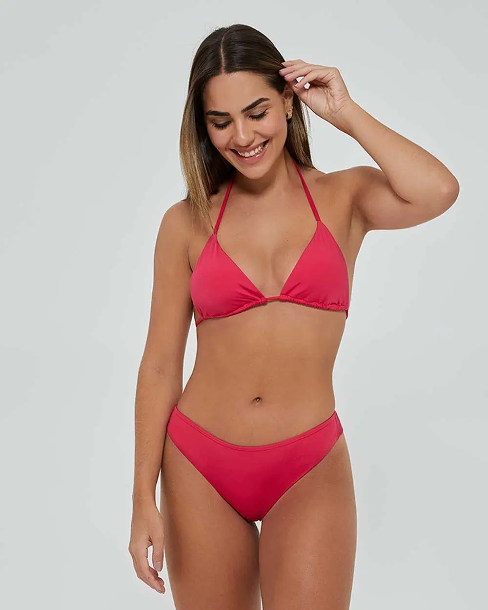 Ficha técnica: confeccionado em tecido de alta elasticidade com toque macio, top cortininha com regulagem na base e nas alças, calcinha tanga fio duplo com acabamento reforçado, cor rosa vibrante, produção nacional, lavar à mão com sabão neutro e secar à sombra para preservar a elasticidade e a cor.