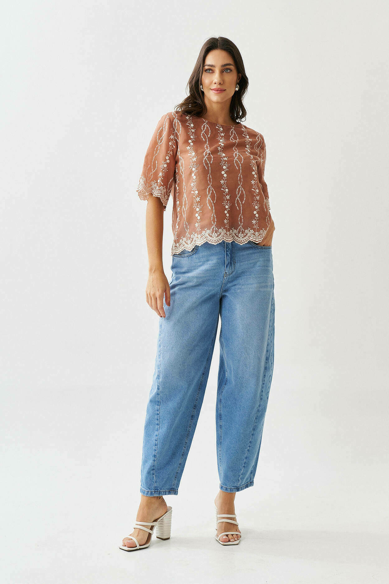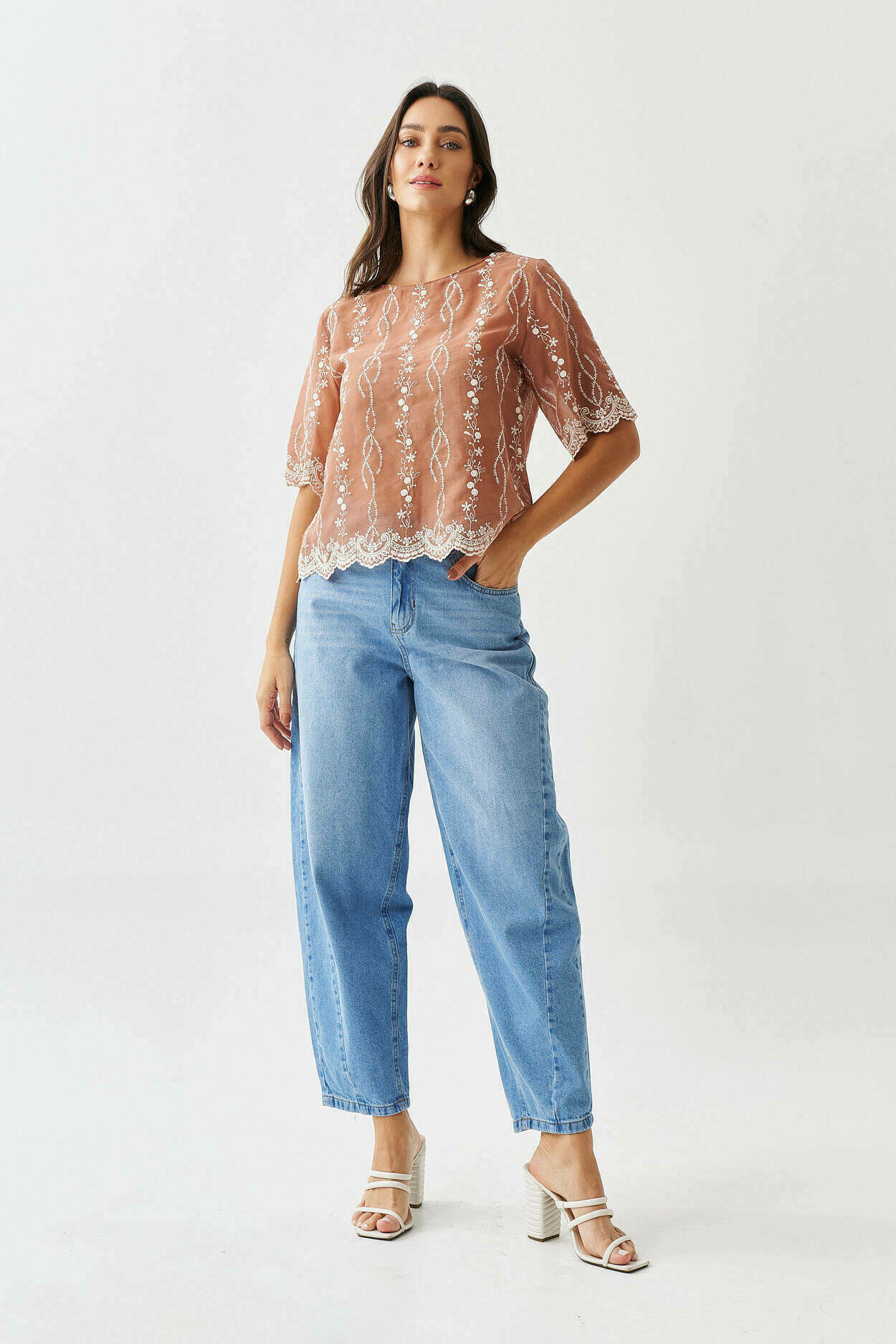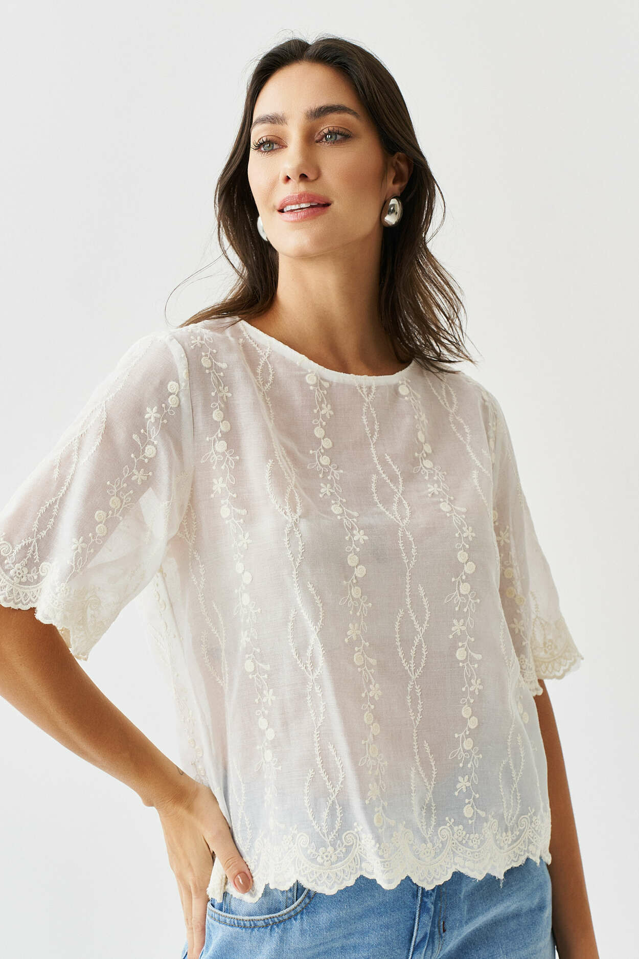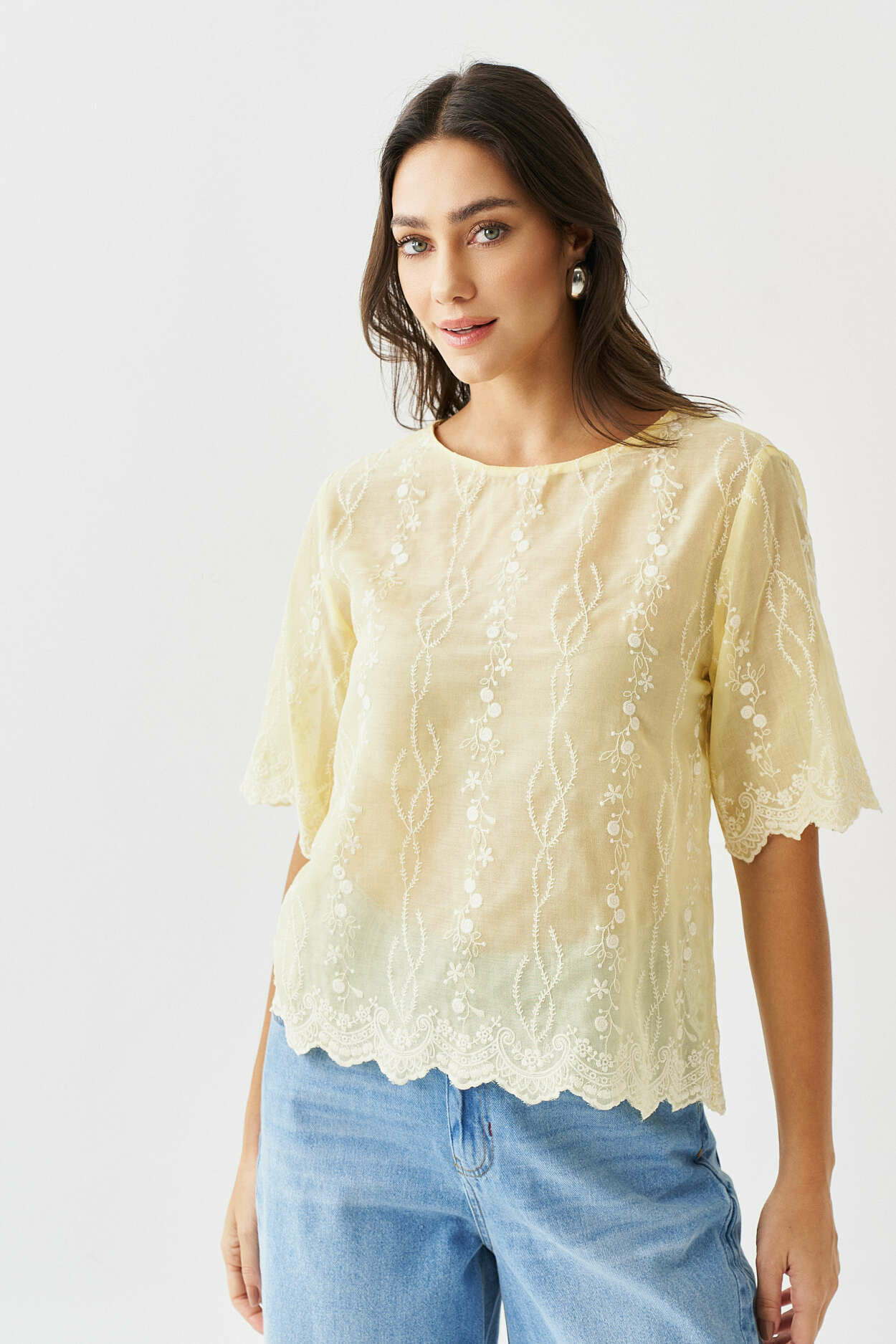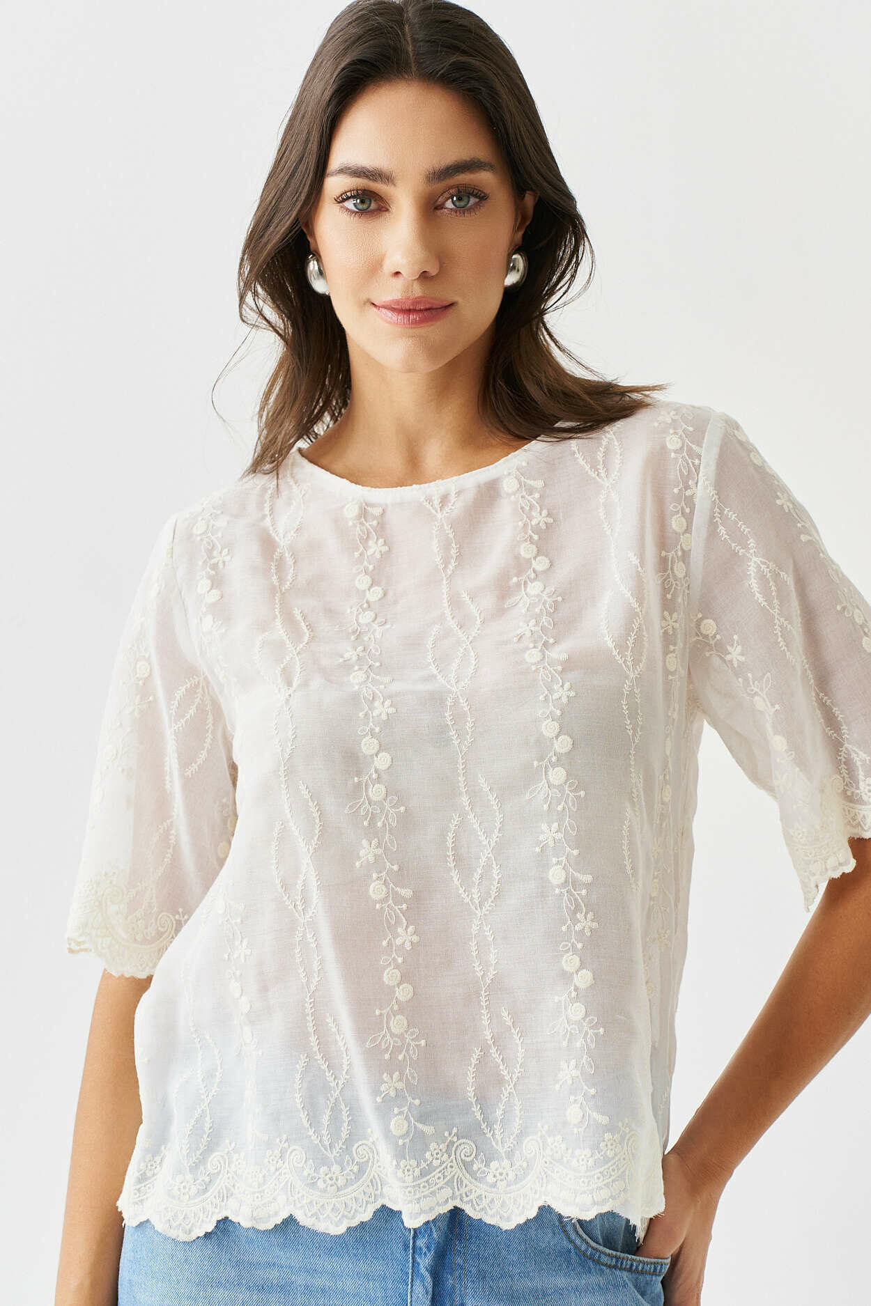Blusa bordado no barrado com manga curta.