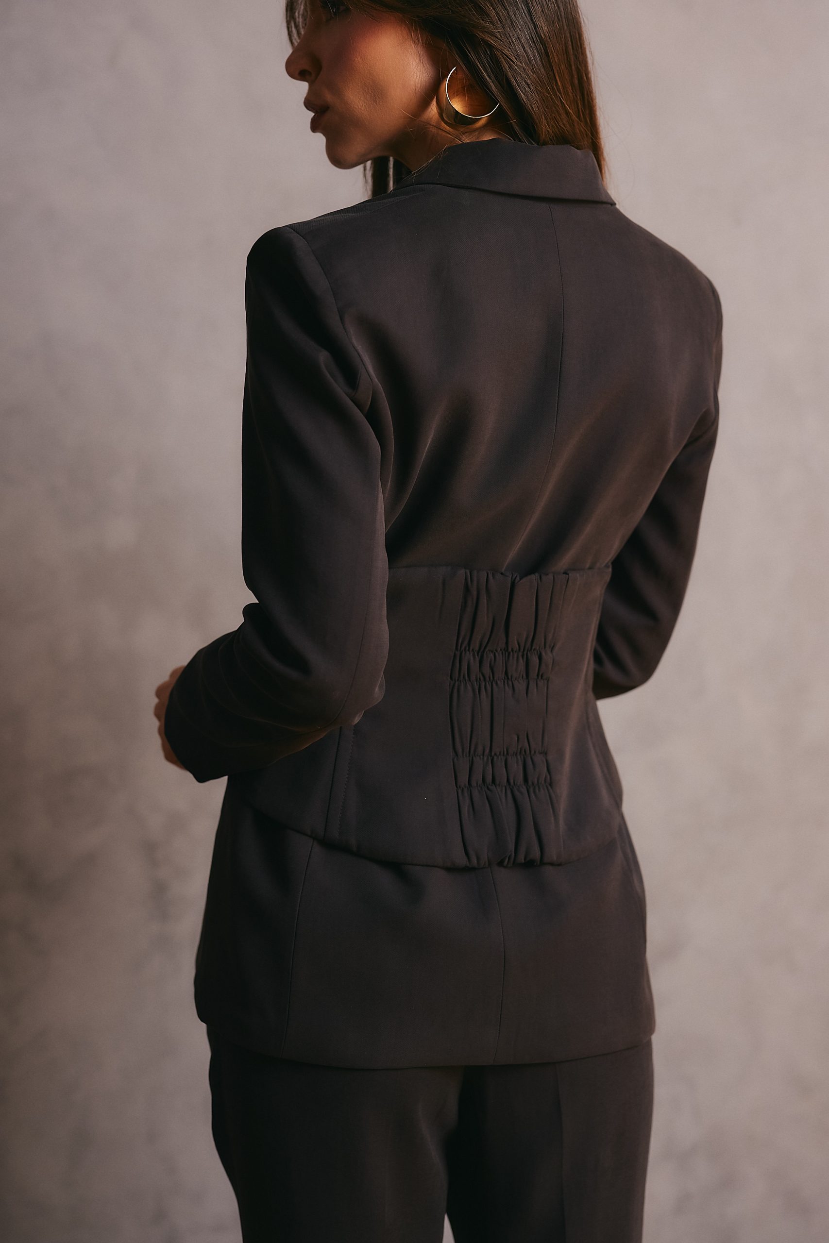 Blazer confeccionado em tecido plano com modelagem de alfaiataria, apresentando caimento encorpado e estruturado que valoriza a silhueta com elegância. Possui gola chanfrada, mangas longas, pences frontais, bolsos com lapela e recorte posterior que garante melhor ajuste ao corpo. Fechamento frontal com botão Acompanha corset para acinturar, acrescentando um toque moderno e sofisticado ao design. É uma peça única e versátil, perfeita para compor looks refinados, ideal para quem busca estilo, presença e contemporaneidade.