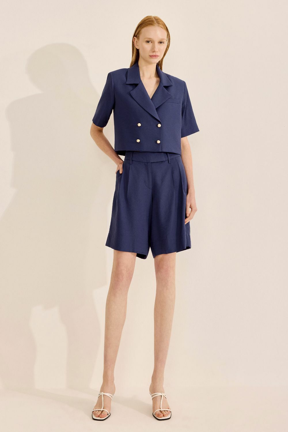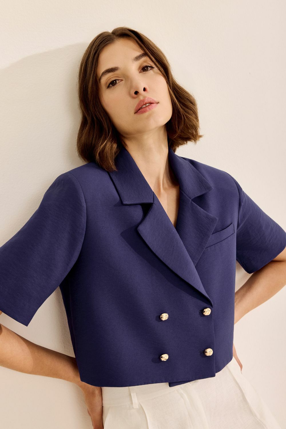 Ficha técnica: blazer curto confeccionado em tecido com composição de 92% viscose e 8% poliéster, modelagem quadrada, fechamento frontal em transpasse com botões metálicos, mangas curtas com barrado alongado, sem forro, cor intensa e sofisticada, peça de origem nacional, com cuidados de lavagem à mão ou em ciclo delicado, secagem à sombra e passagem em temperatura baixa para preservar a estrutura e o acabamento da peça.