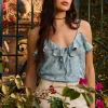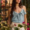 Chiaro – Tecido com padronagens e leve brilho – Blusa de alças finas confeccionada em tecido plano, com babados decorativos no busto que adicionam charme ao design. Possui amarração frontal delicada, revel interno para acabamento e alças com reguladores