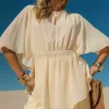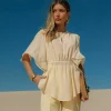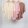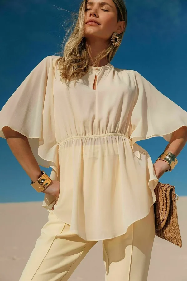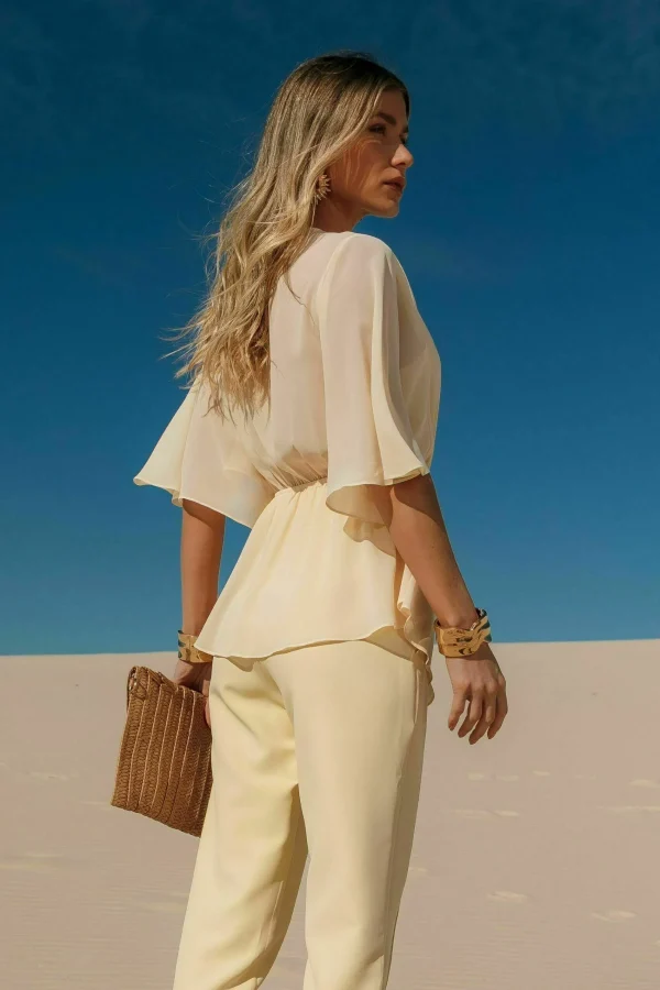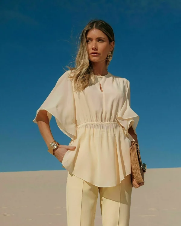 Descrição técnica: Blusa em chiffon, modelagem solta com mangas amplas, ajuste na cintura por elástico e decote com botão delicado.