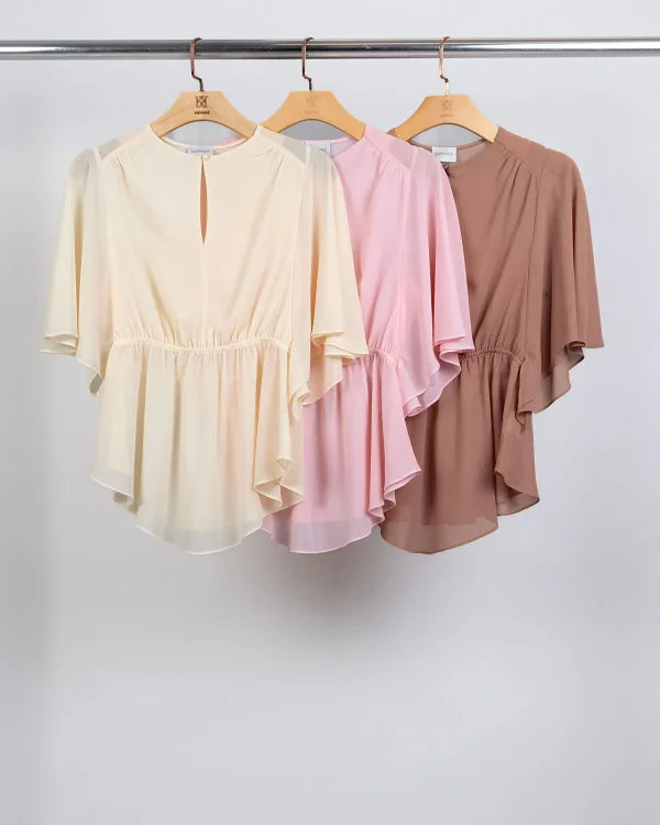 Essa blusa é pura leveza e movimento. O chiffon cria um caimento fluido e sofisticado, enquanto as mangas amplas trazem aquele ar etéreo e elegante. O detalhe do elástico na cintura marca a silhueta de forma sutil e feminina, e o botão no decote adiciona delicadeza na medida certa.