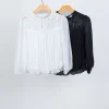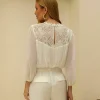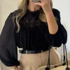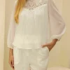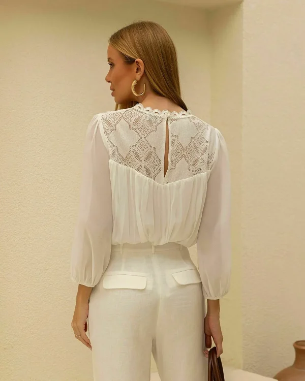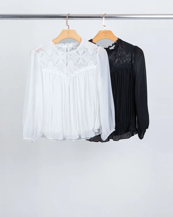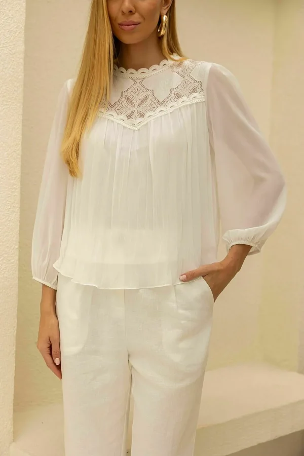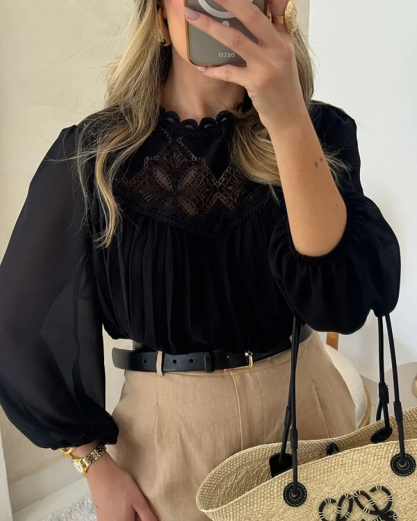 Blusa em chiffon plissado. Modelo com pala em renda no decote e nas costas. Manga 3/4 com elástico no punho. Possui forro no corpo.
