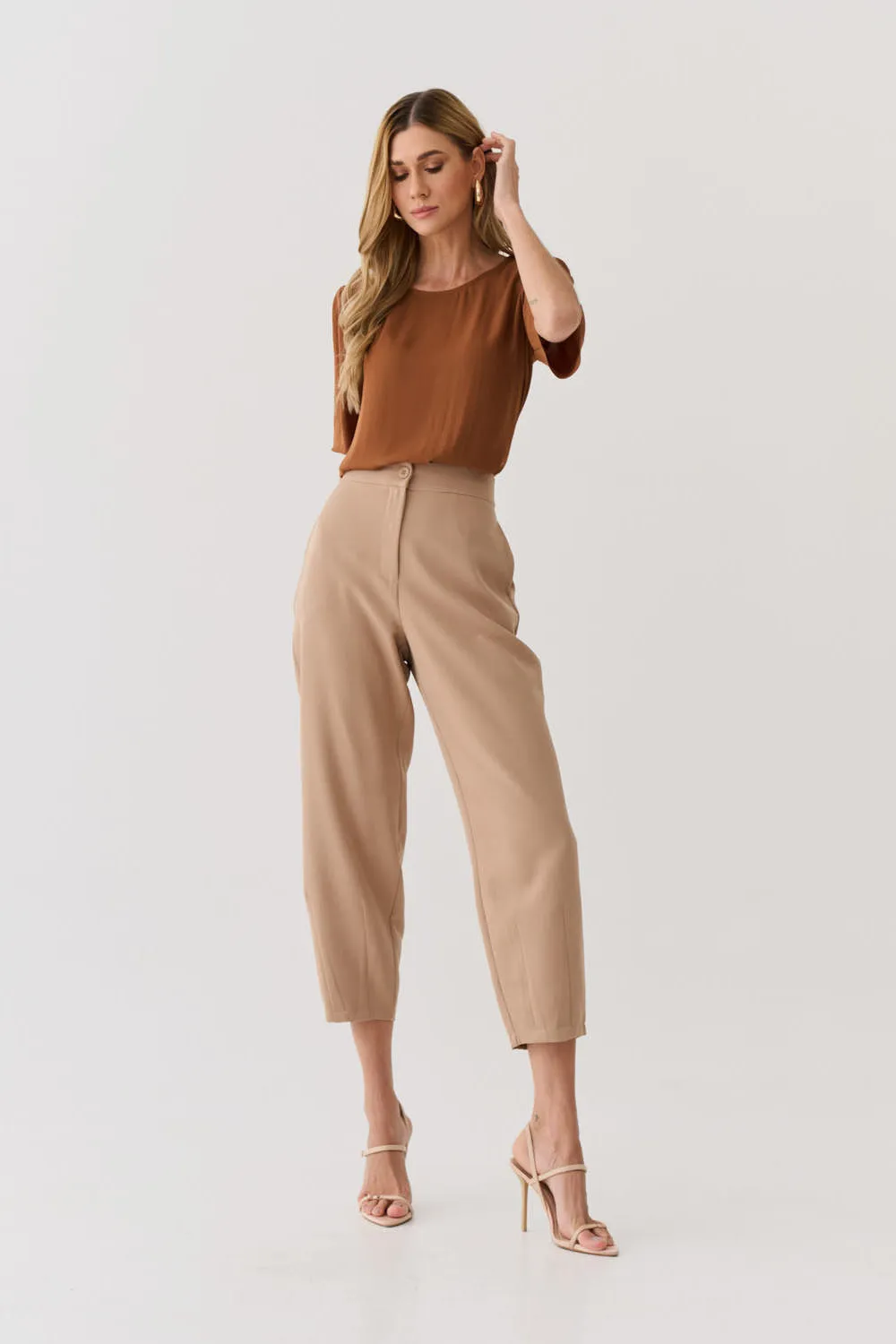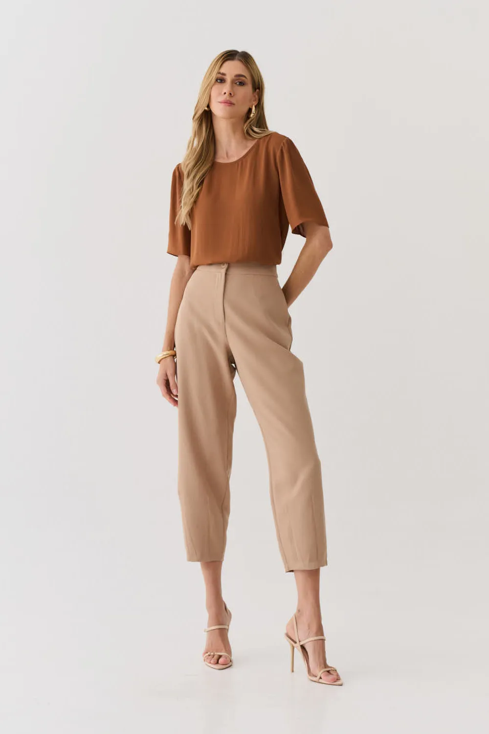 Ficha técnica: confeccionada em tecido crepe de toque macio e caimento estruturado, não possui forro, modelagem reta com mangas curtas e acabamento clean, cor caramelo, peça de origem nacional, recomenda-se lavar à mão ou em ciclo delicado, não usar alvejante, não torcer e secar à sombra para preservar a durabilidade da blusa feminina sofisticada.