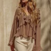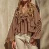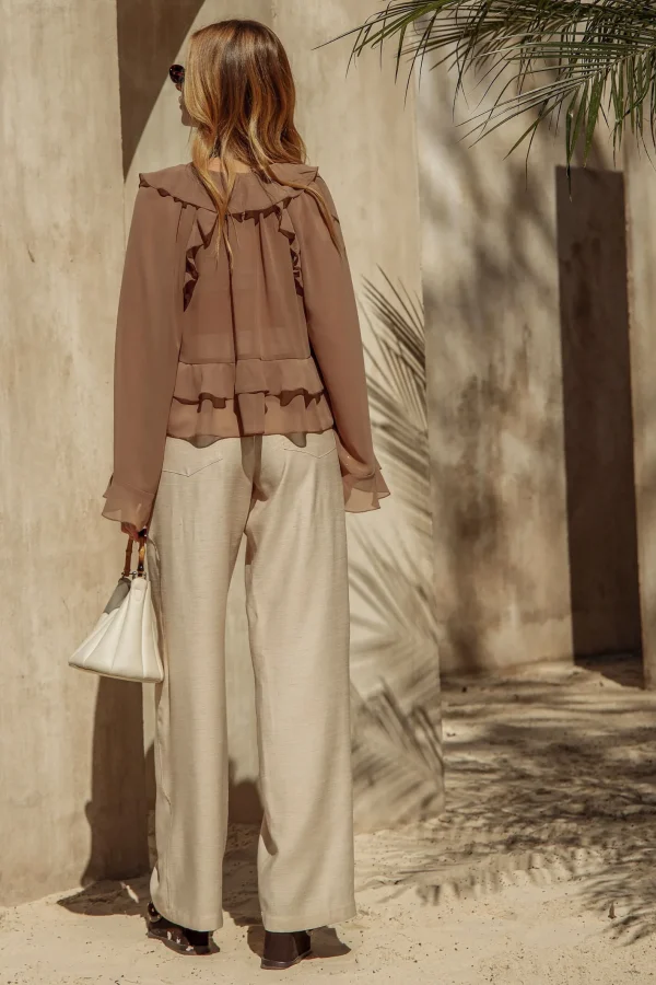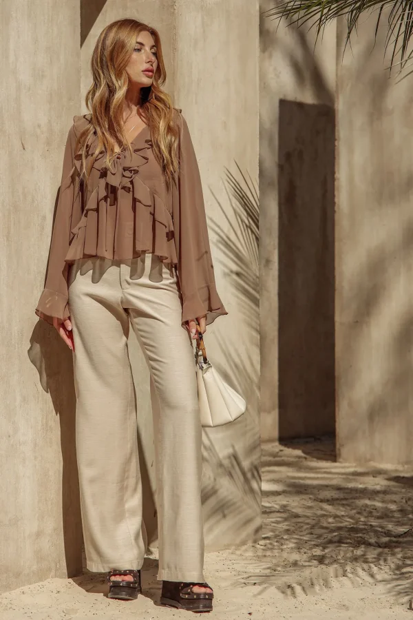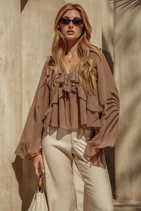 Blusa fluida confeccionada em chiffon leve com transparência sutil, que proporciona um caimento solto e toque suave sobre a pele. O decote em V com amarração delicada valoriza o colo com feminilidade, enquanto os babados aplicados na frente e nas mangas trazem movimento e um ar romântico à peça.