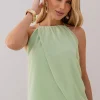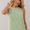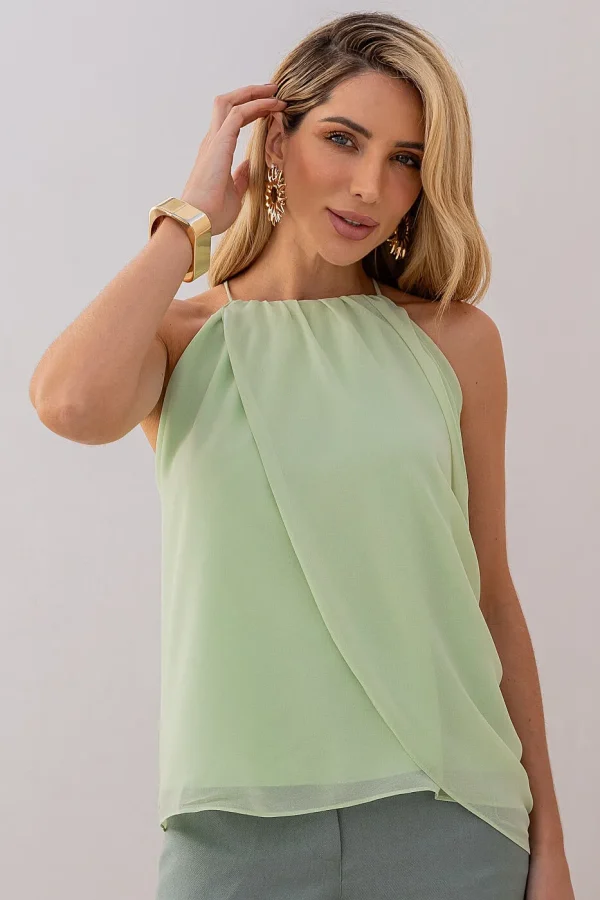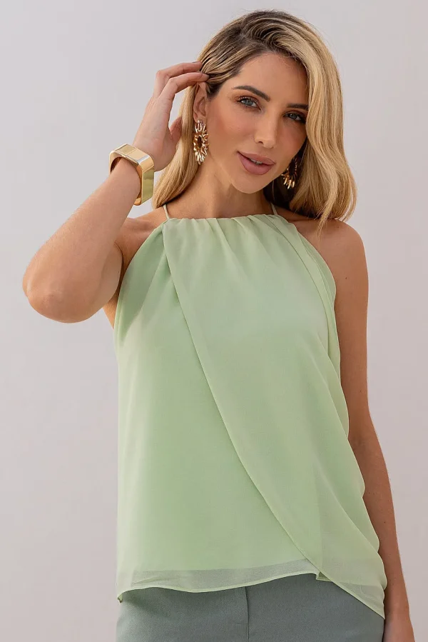 Com modelagem soltinha e decote halter, ela traz o detalhe das camadas sobrepostas que lembram pétalas, criando um caimento delicado e cheio de movimento.