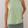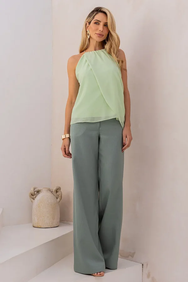 Chiffon Raquel-Tecido fluido com leve transparência-Blusa confeccionada em chiffon duplo, com caimento leve e fluido. Possui detalhe drapeado frontal que cria um efeito sofisticado e moderno. O fechamento por amarração no pescoço garante um toque elegante