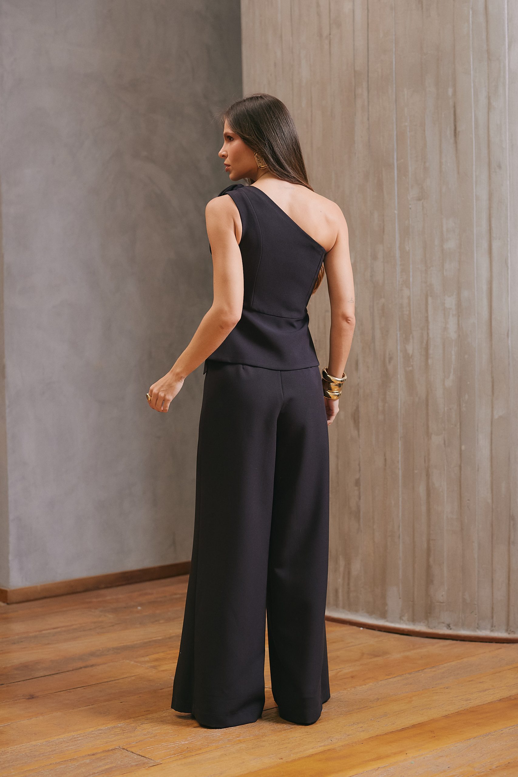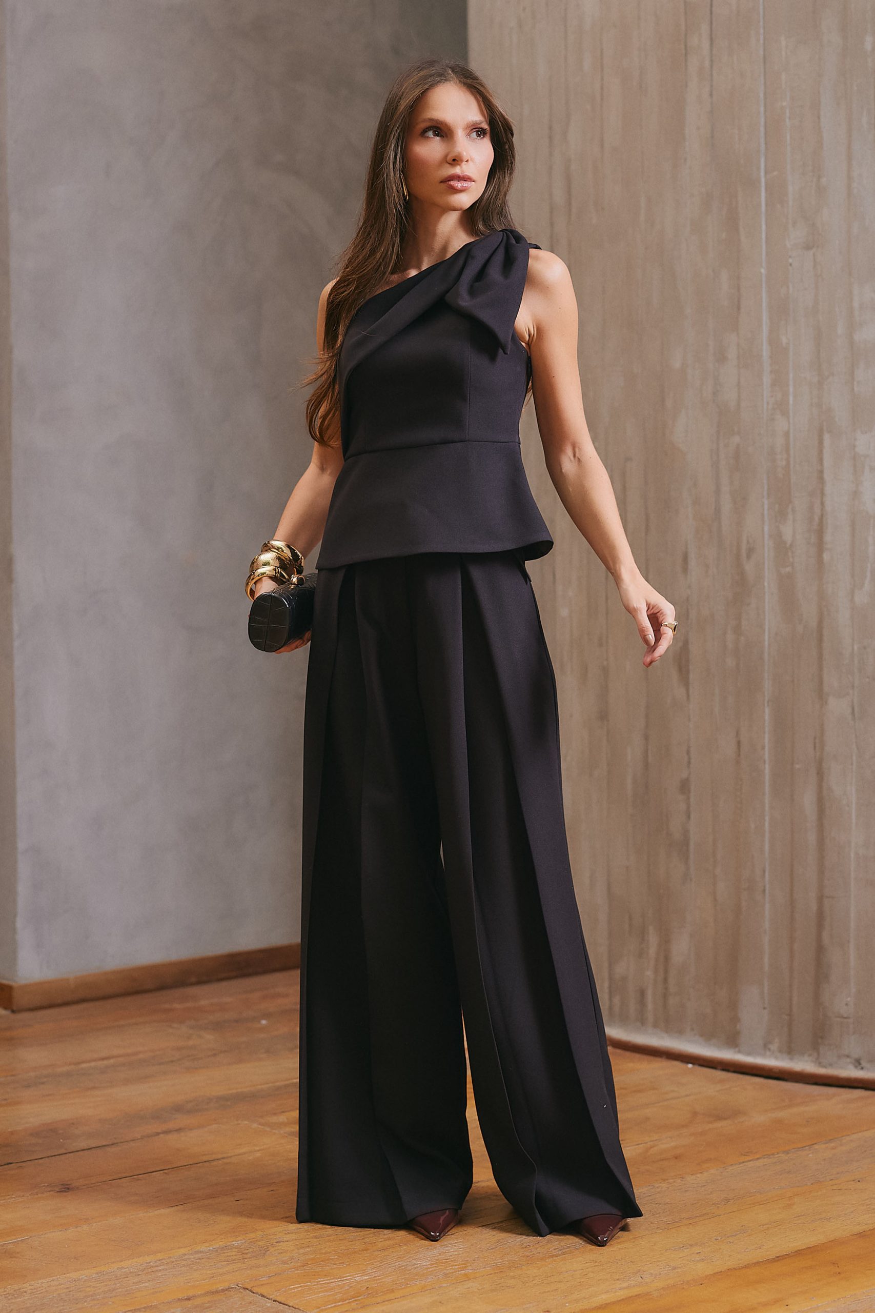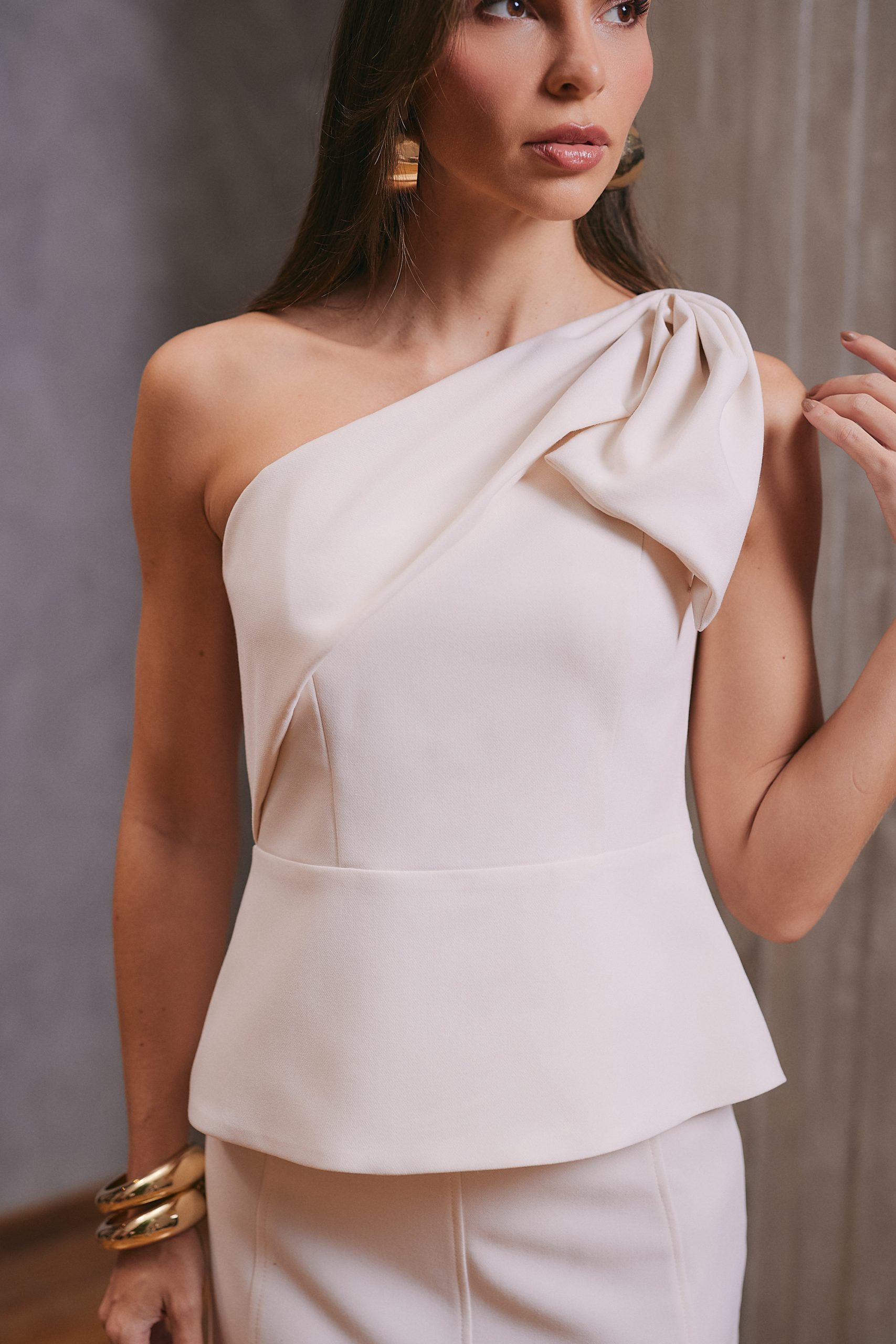 Blusa confeccionada em tecido plano, com modelagem de alfaiataria que proporciona um caimento encorpado e valoriza a silhueta com sofisticação. Possui decote assimétrico, recortes frontais e posteriores que acentuam o ajuste ao corpo, além de pala frontal que recebe um delicado detalhe orgânico, conferindo charme e personalidade ao design. O destaque fica por conta do acabamento em peplum na barra, que acrescenta movimento e feminilidade à peça. O fechamento lateral com zíper invisível garante praticidade e um acabamento discreto. Uma blusa elegante e moderna, perfeita para produções que pedem um toque de originalidade e refinamento.