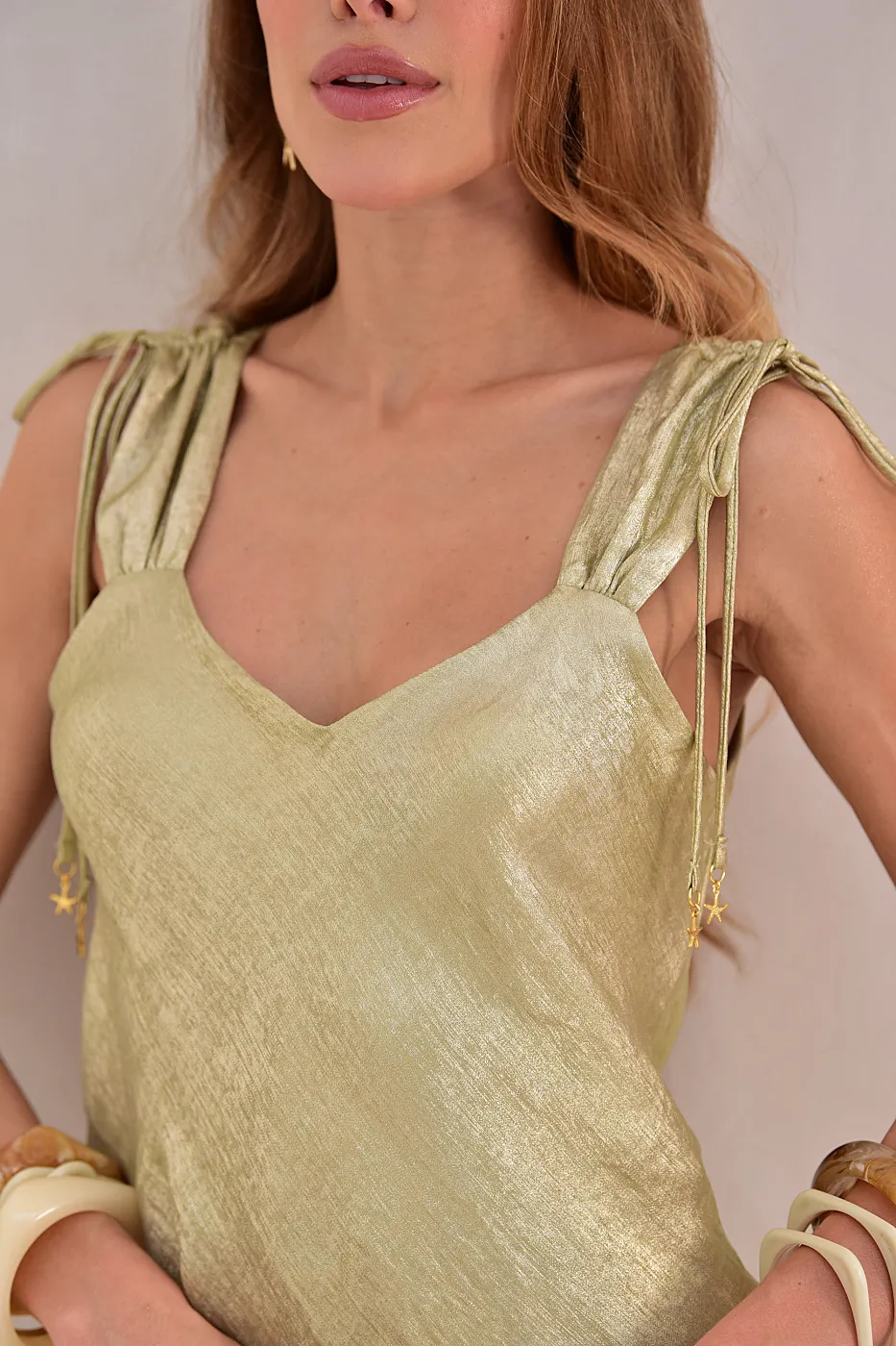 Ficha técnica: confeccionada em tecido leve com acabamento metalizado (100% poliéster), alças largas com canaletas e cordão ajustável, ponteiras metálicas, modelagem solta e caimento fluido. Cor: dourado suave. Origem: nacional. Cuidados: lavar à mão com sabão neutro, secar à sombra e não torcer.