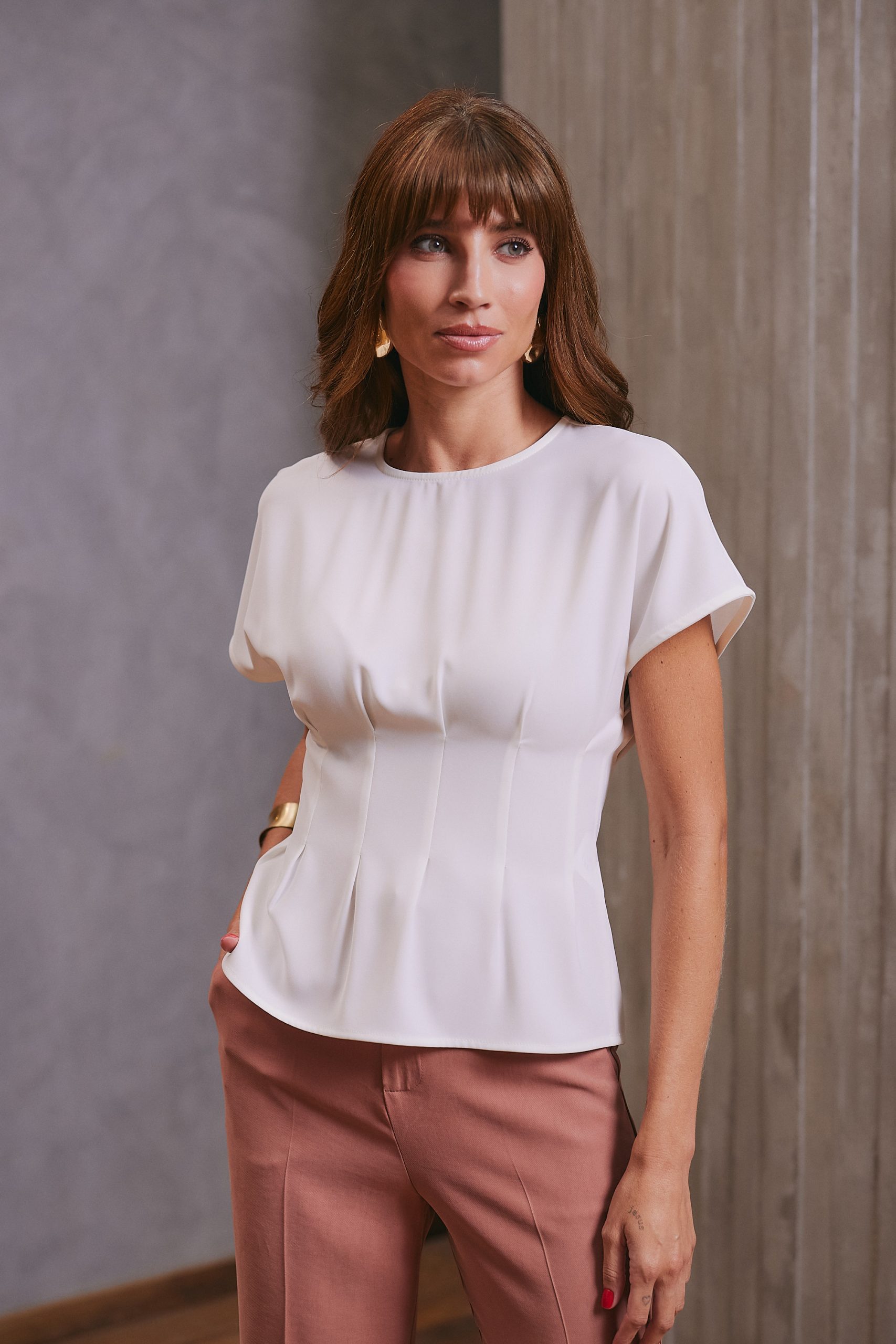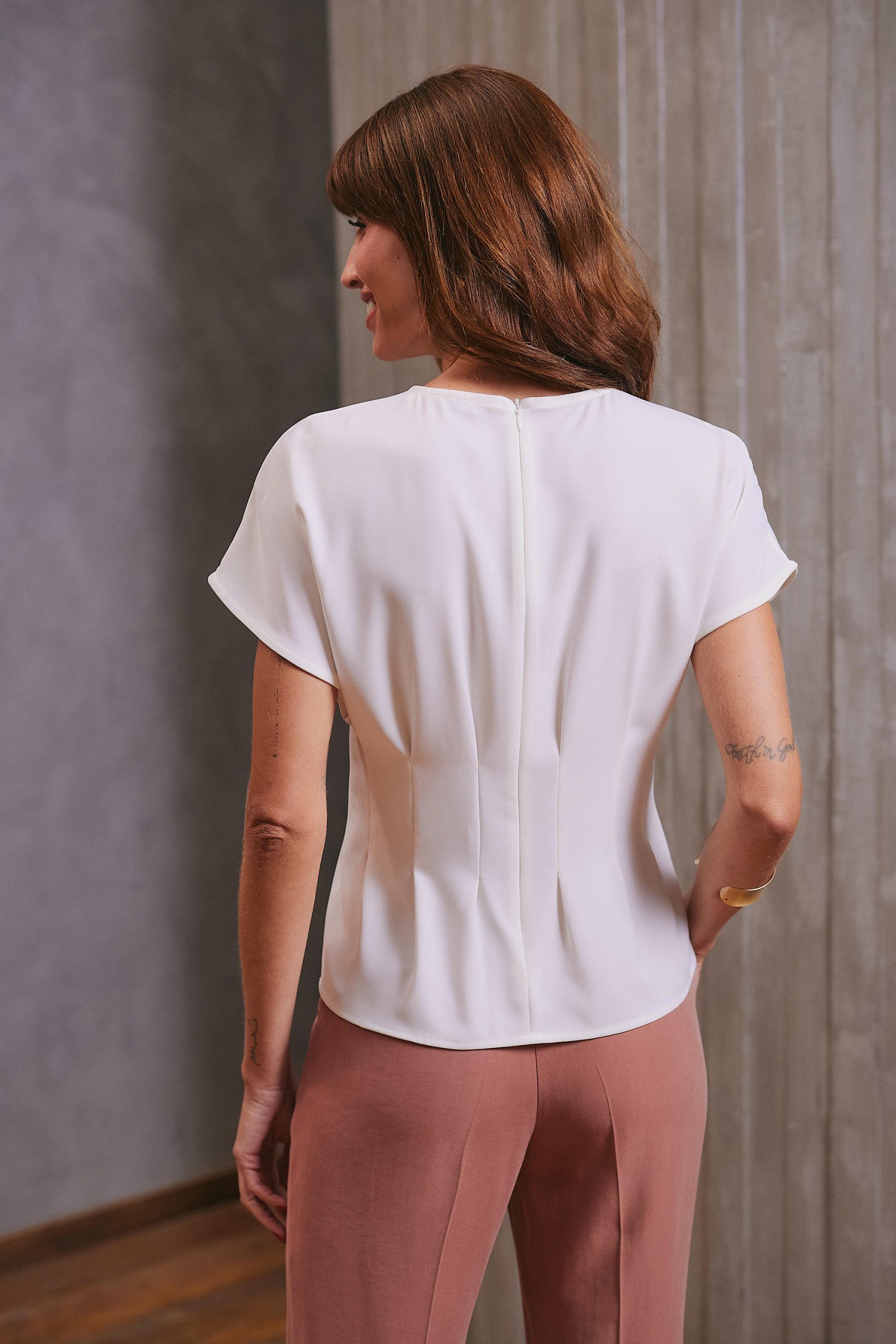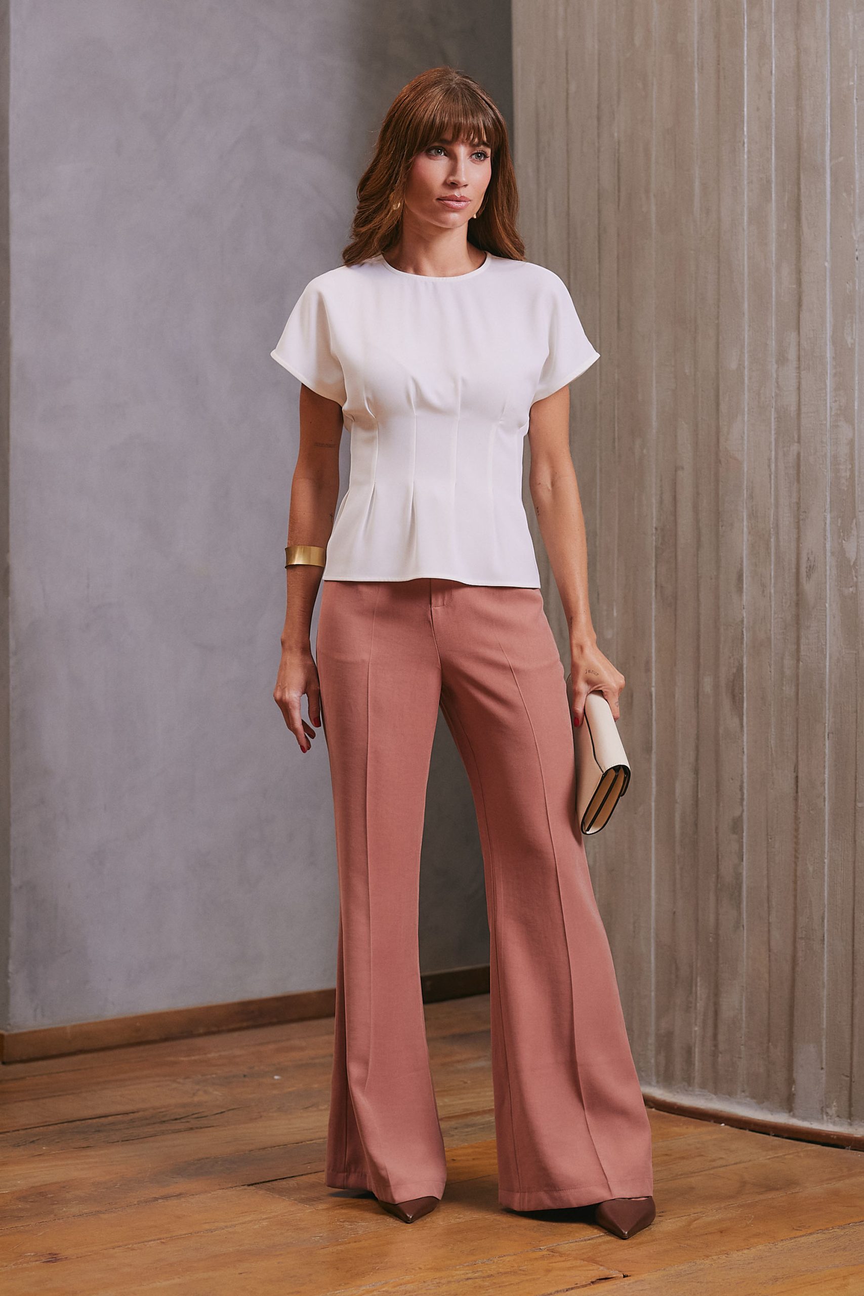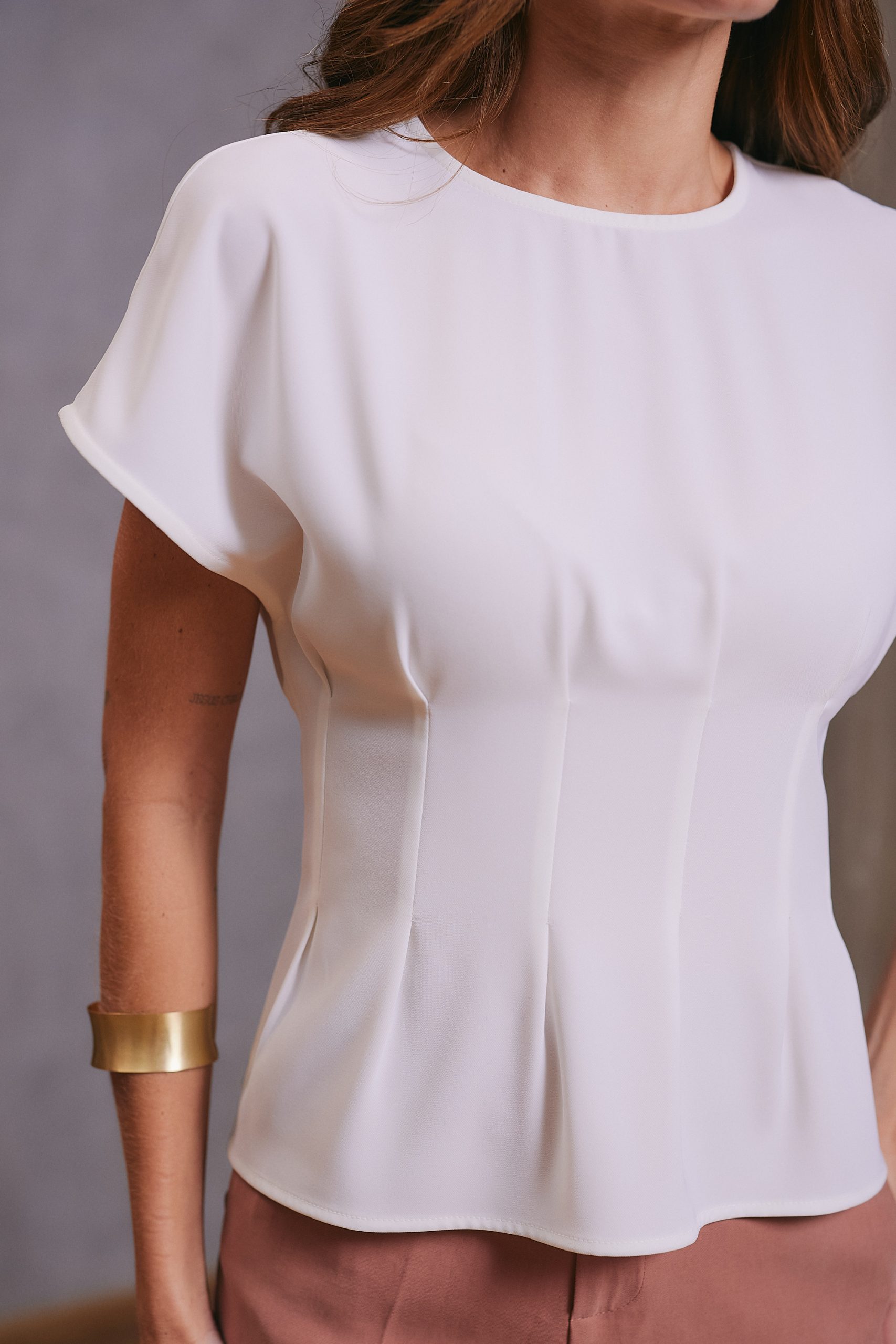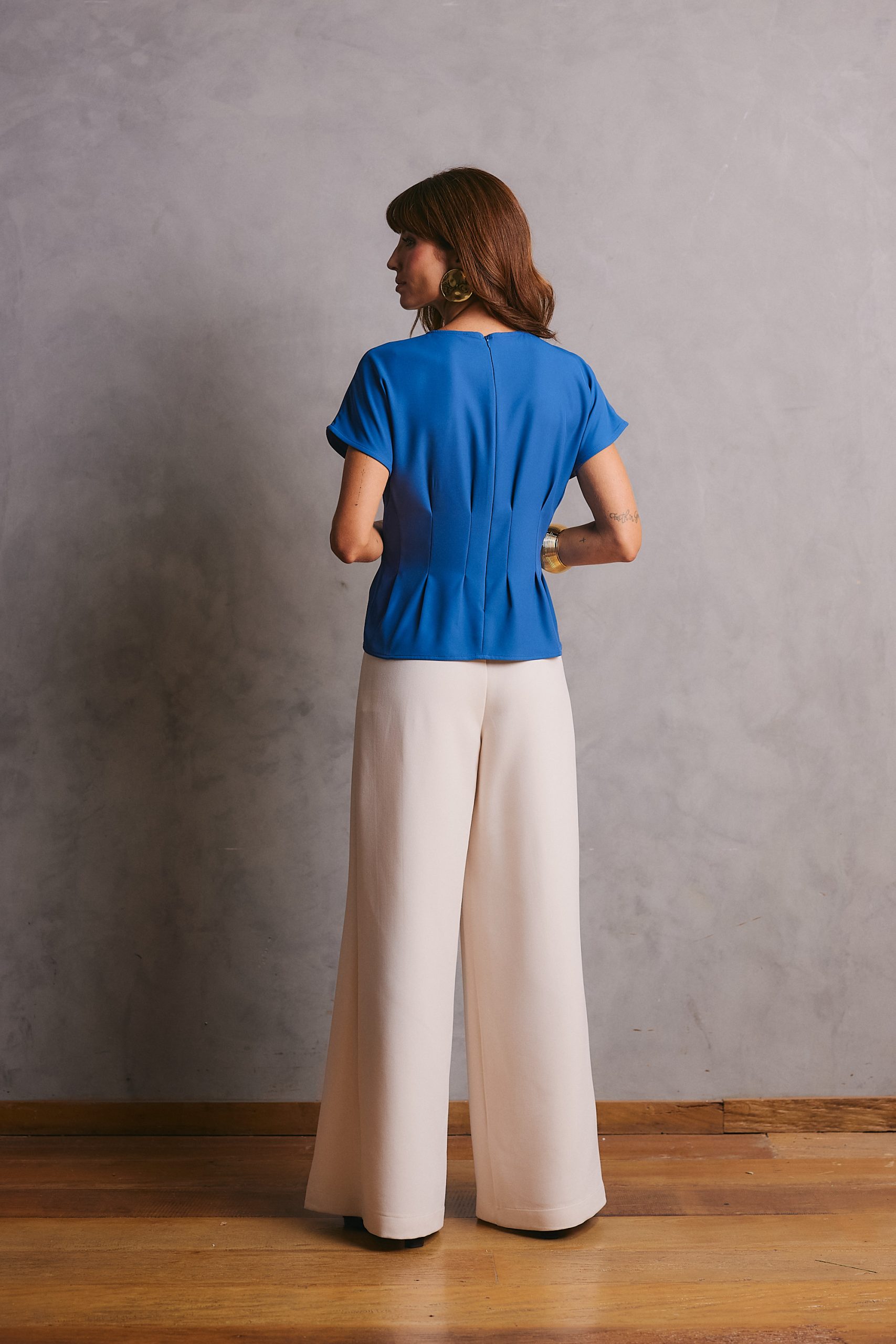 Blusa confeccionada em tecido plano, com modelagem de alfaiataria que proporciona caimento fluido e elegante. Possui decote arredondado e mangas curtas sem cava, garantindo conforto e sofisticação ao vestir. Apresenta pregas frontais e posteriores como destaque, que acrescentam movimento e refinamento à peça. O fechamento posterior é feito por zíper invisível, assegurando um acabamento delicado. É uma peça sofisticada e elegante, perfeita para compor diversos looks.