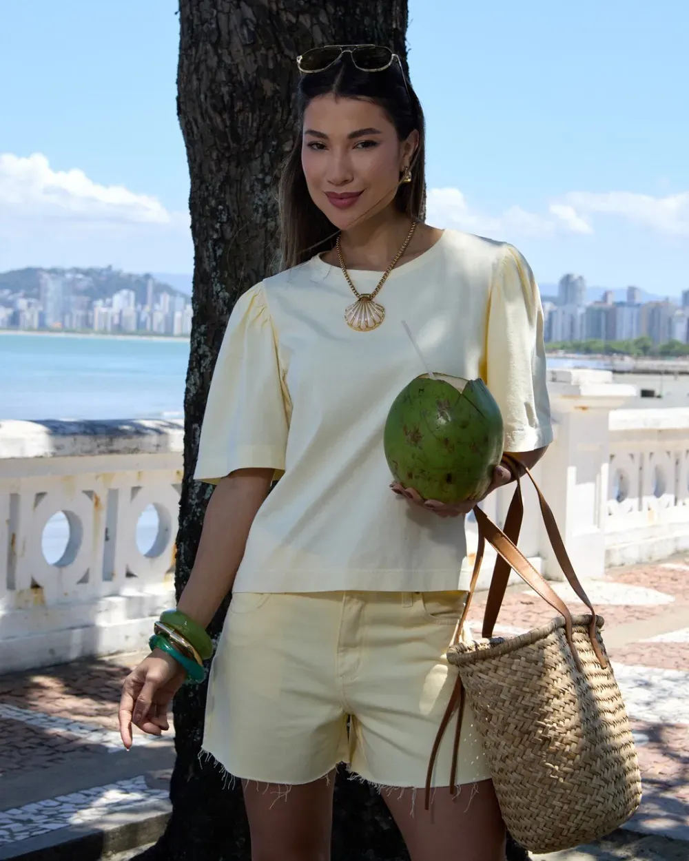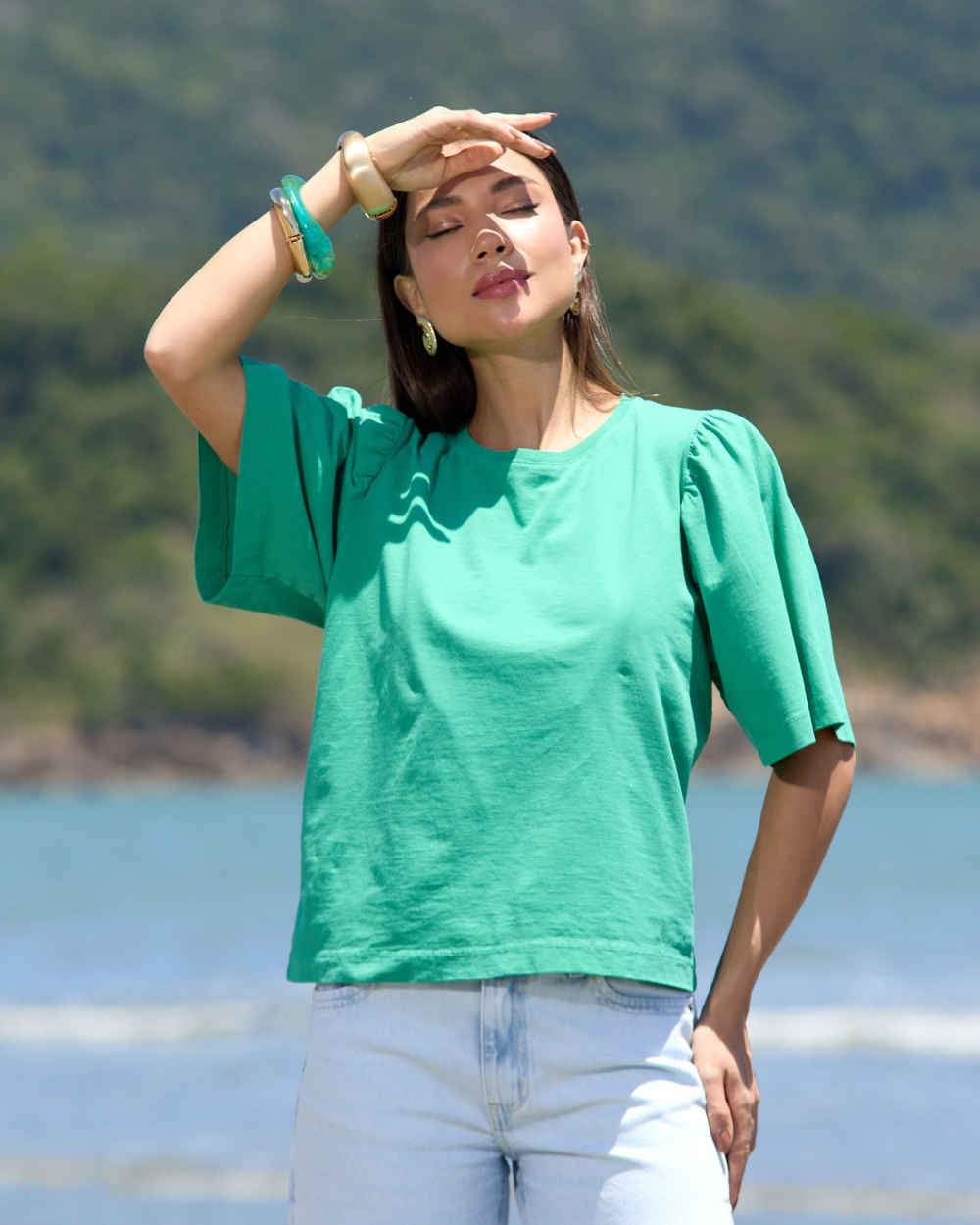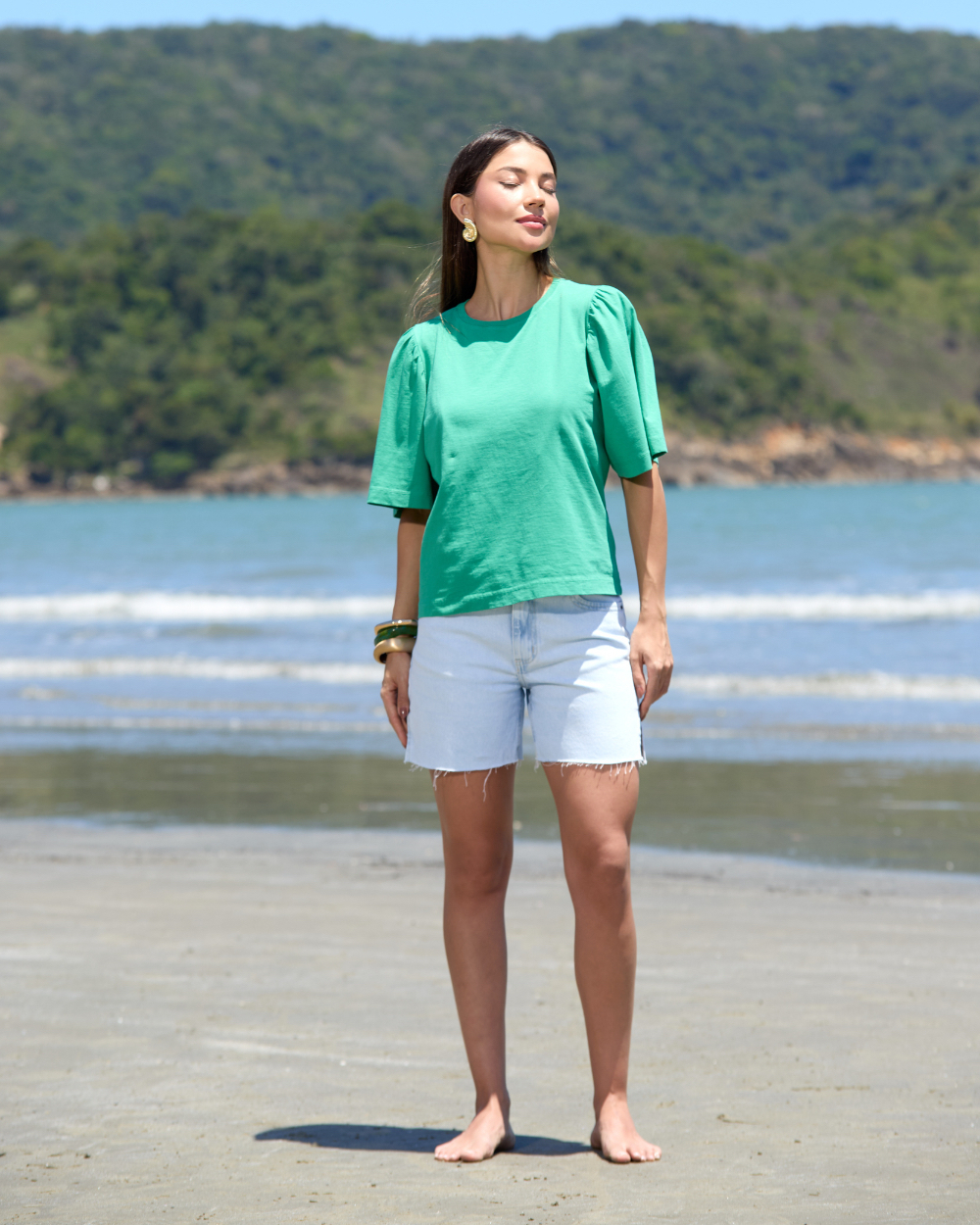 Ficha técnica: Confeccionada em algodão 100%, sem forro, manga curta com franzido, modelagem confortável, cor sólida, origem nacional, com cuidados de lavagem que incluem lavar à mão ou em ciclo delicado, não usar alvejantes e secar à sombra para preservar a maciez e o acabamento do tecido 🧺.