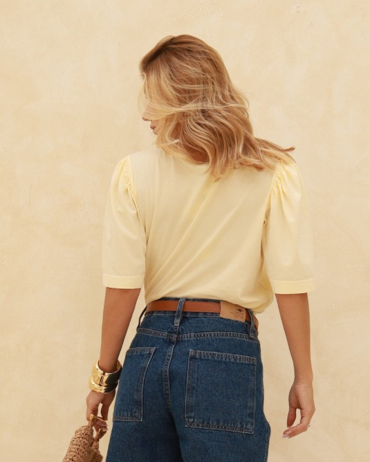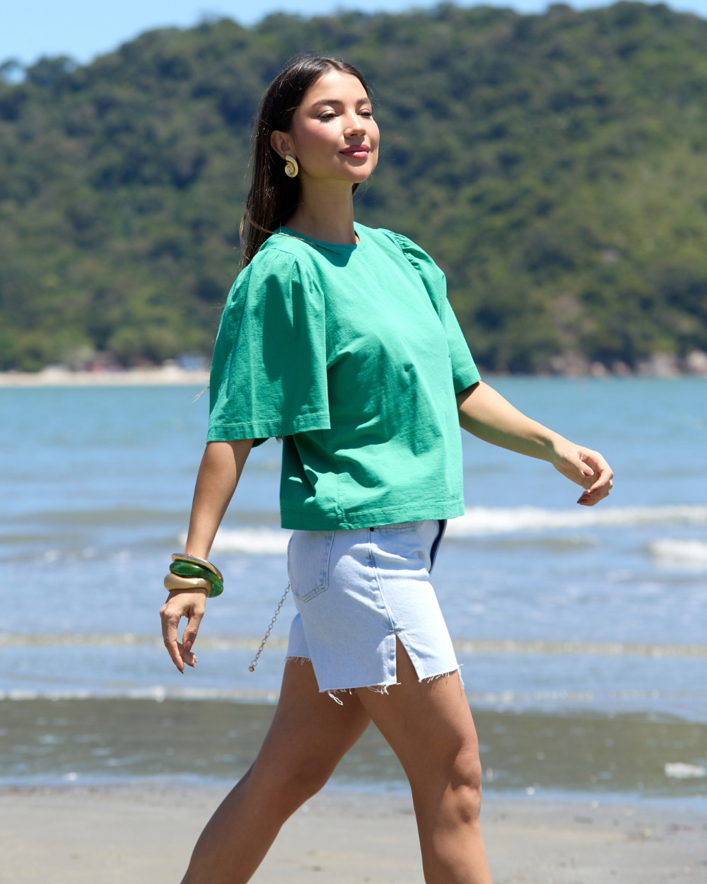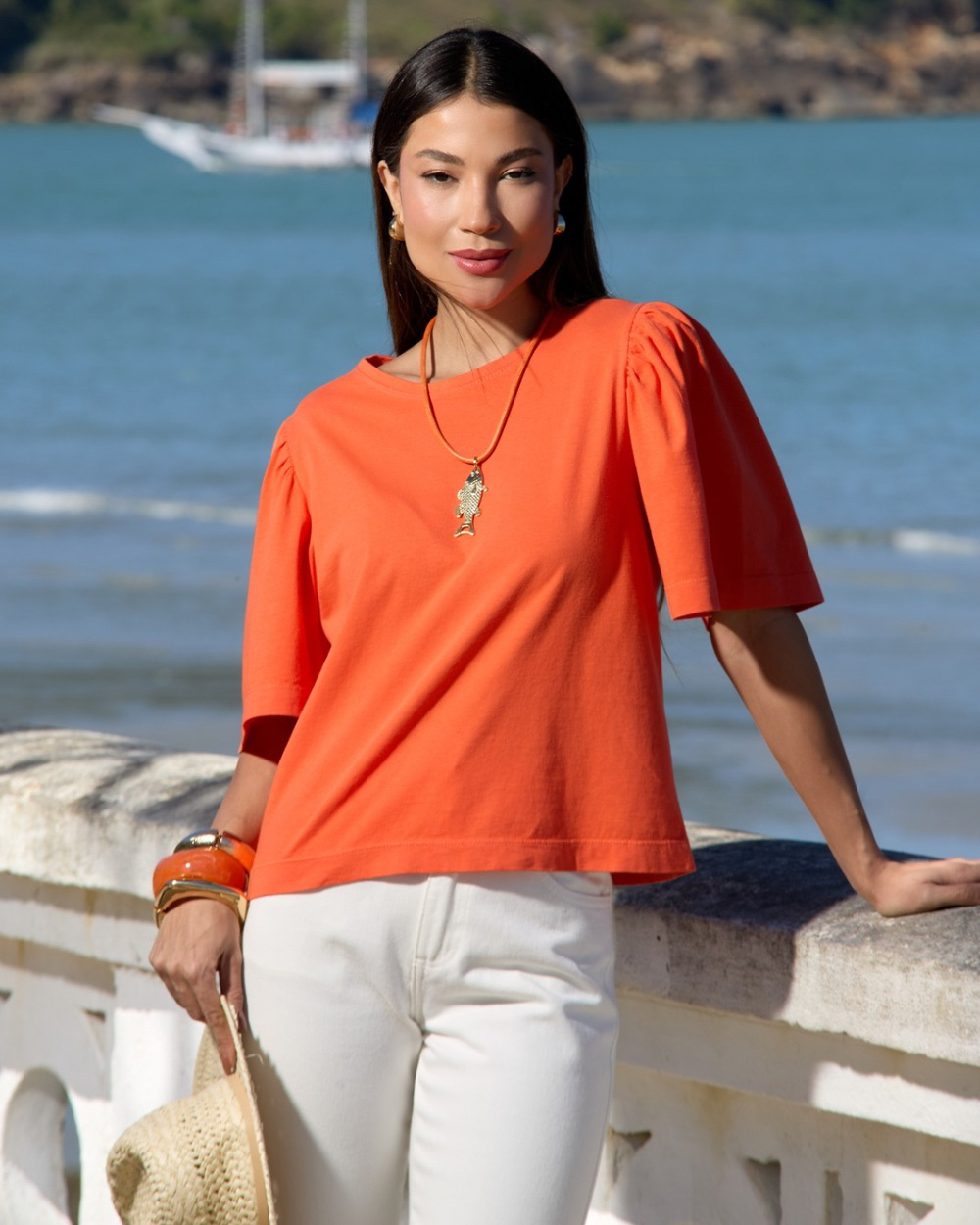 Ficha técnica: Confeccionada em algodão 100%, sem forro, manga curta com franzido, modelagem confortável, cor sólida, origem nacional, com cuidados de lavagem que incluem lavar à mão ou em ciclo delicado, não usar alvejantes e secar à sombra para preservar a maciez e o acabamento do tecido 🧺.