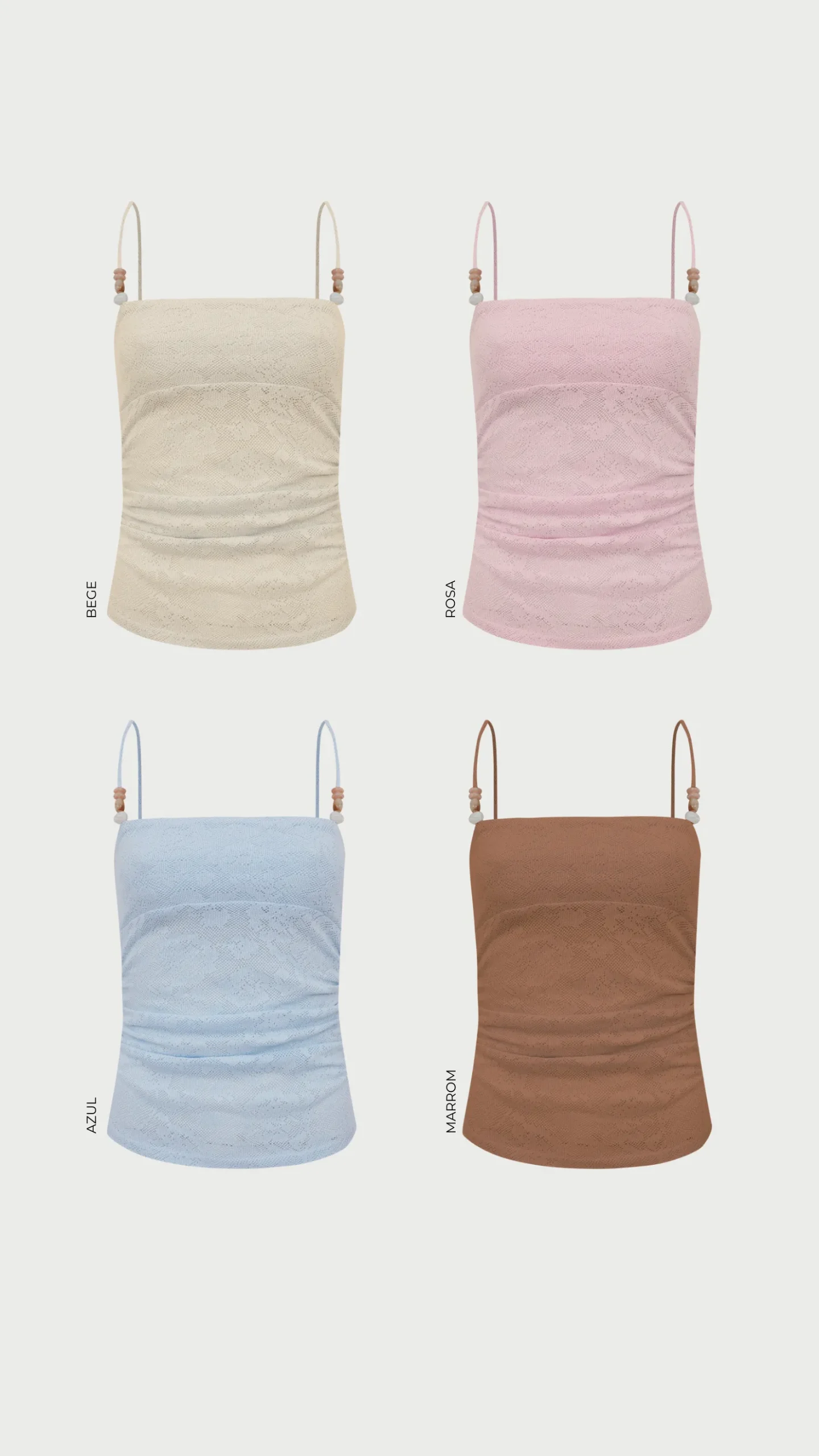 Ficha técnica: composição 90% algodão e 10% poliamida, modelagem ajustada em renda crochet, pedraria aplicada nas alças, tecido leve e texturizado, cores variadas, origem têxtil mista, cuidados de lavagem suaves, preferencialmente à mão para preservar a renda e a pedraria.