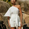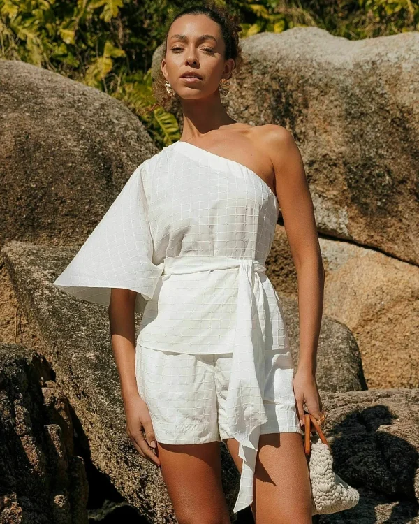 Blusa de um ombro só em voil bordado. Manga curta ampla. Faixa fixa para ajuste na cintura.