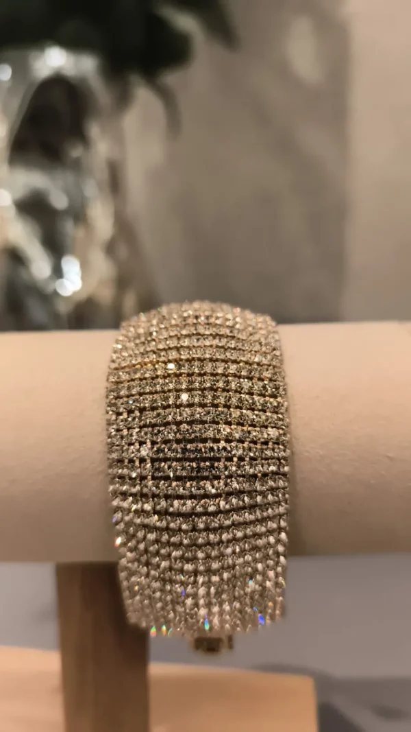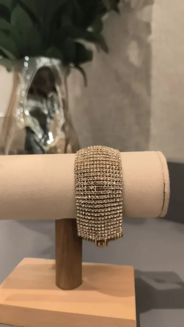Pulseira larga e estruturada com fileiras de strass cravejados que capturam a luz de todos os ângulos 💎🌟. Ideal para compor looks noturnos com elegância e glamour, é o acessório que transforma qualquer produção em um verdadeiro acontecimento 💫👑.