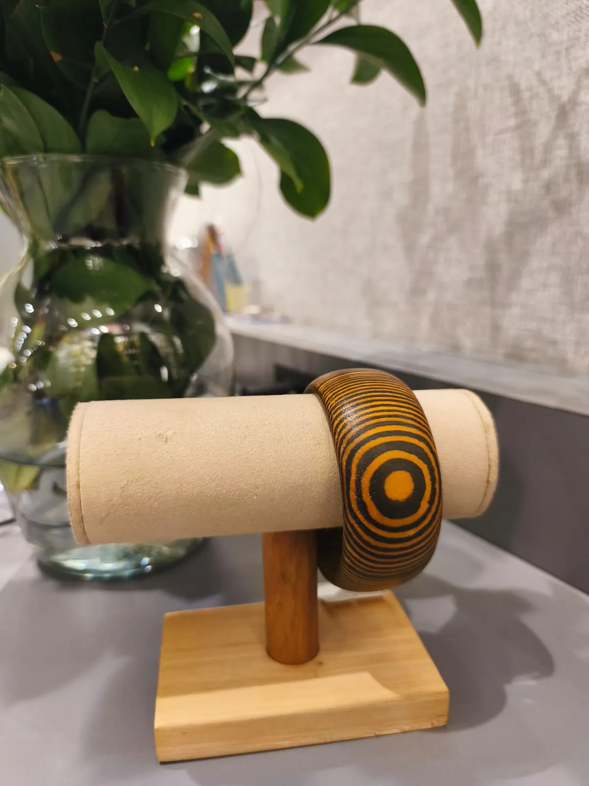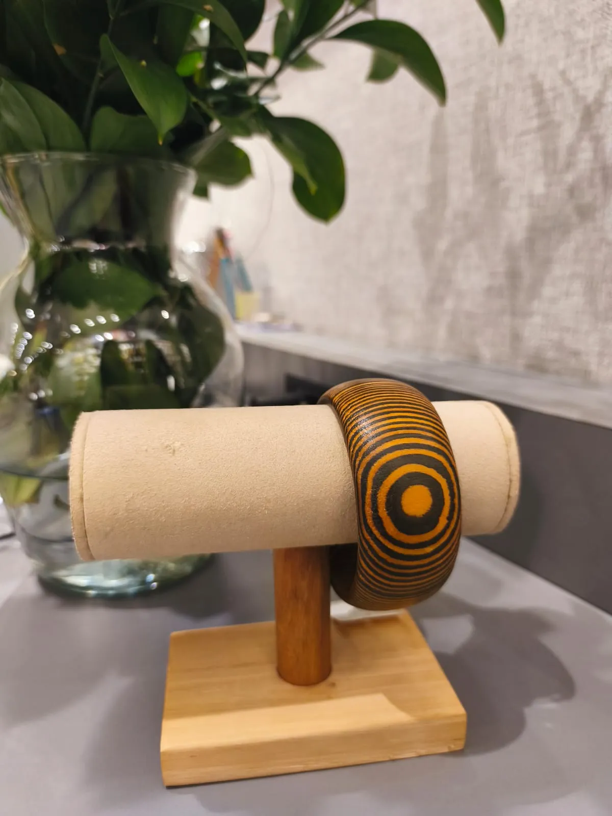 O bracelete largo madeira é uma peça cheia de personalidade e estilo natural, ideal para quem aprecia acessórios com design orgânico e toque artesanal. Feito em madeira polida, ele apresenta um padrão circular geométrico em tons terrosos, que realça sua textura e dá um ar contemporâneo ao visual. O contraste entre o marrom escuro e o alaranjado traz um charme rústico e sofisticado, tornando-o uma peça versátil — perfeita tanto para looks casuais quanto produções mais elaboradas.