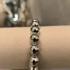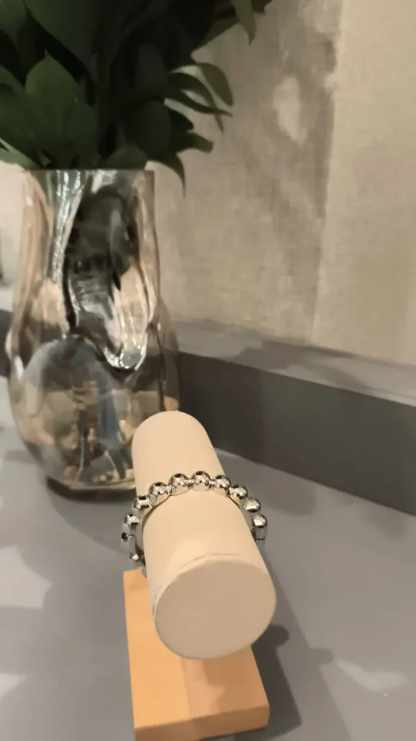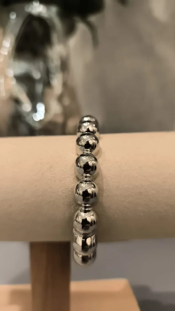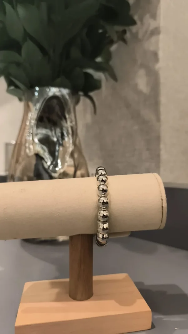 Pulseira tipo bracelete com esferas metálicas prateadas de alto brilho, perfeita para compor produções sofisticadas e atemporais 💫. O design clean e moderno valoriza o pulso com elegância e versatilidade – ideal para usar sozinho ou em mix de acessórios 🤍🖤.