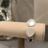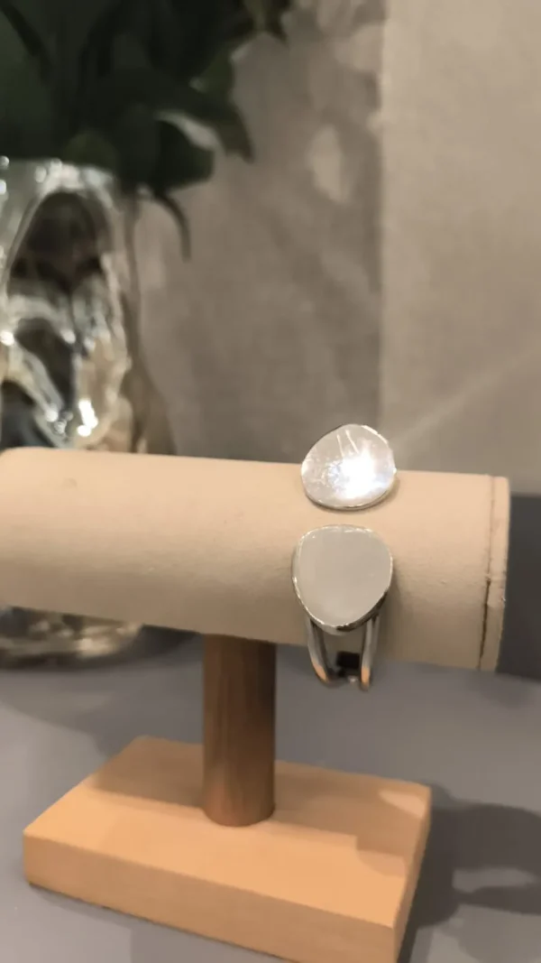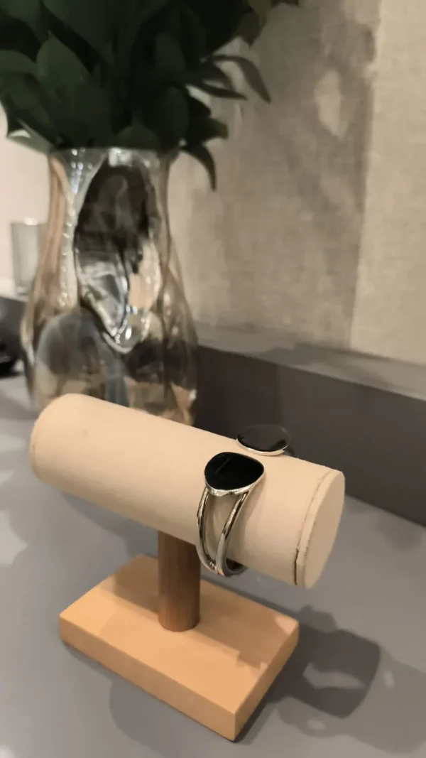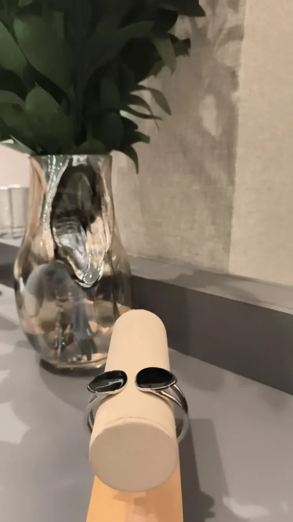 Bracelete rígido prateado com design moderno e elegante, possui aplicação de placas ovais esmaltadas em preto, criando um contraste sofisticado entre brilho e profundidade ⚫✨. Uma peça contemporânea e marcante, perfeita para elevar qualquer look com um toque de personalidade e arte 🖌️👩🎨.