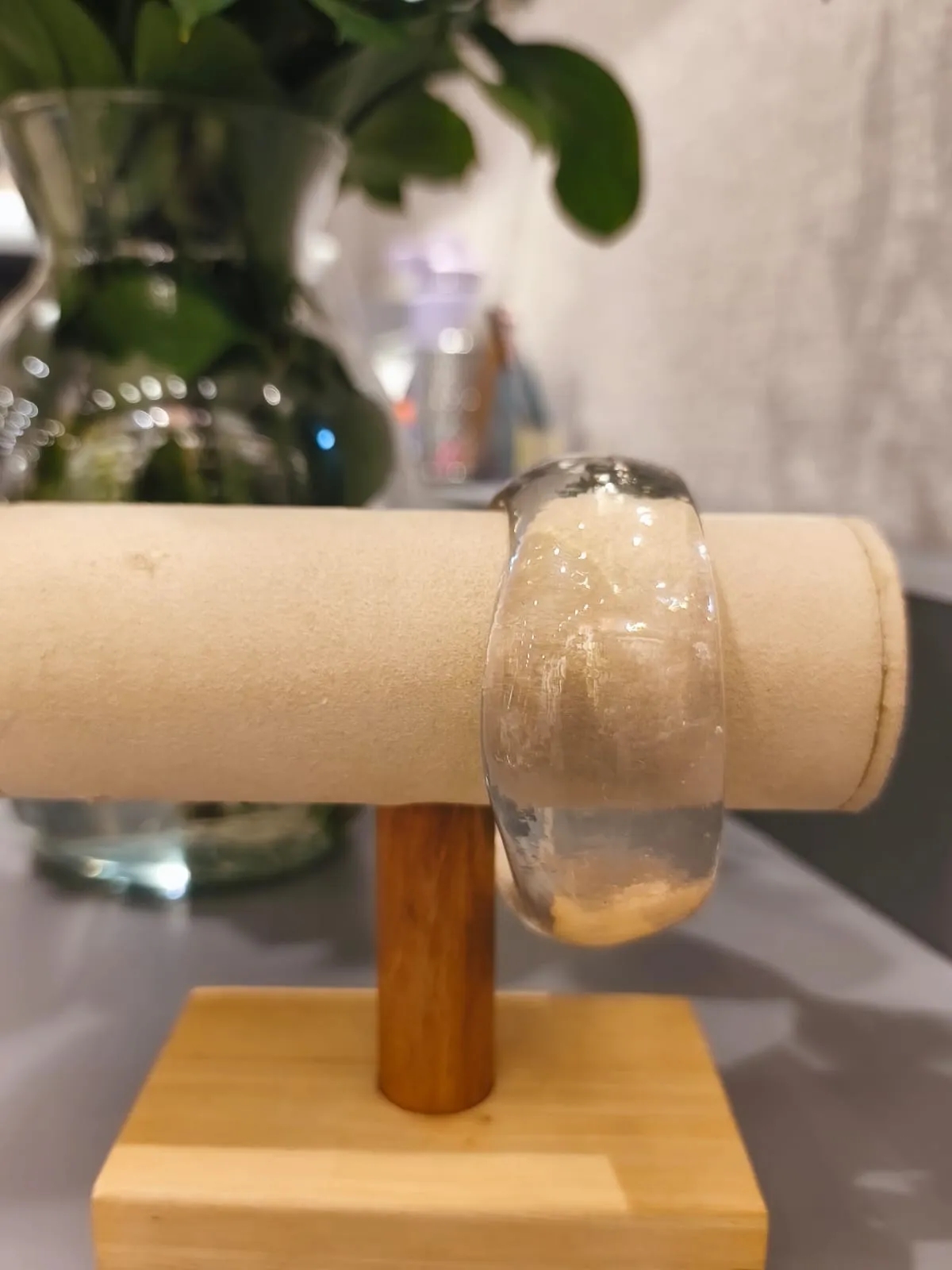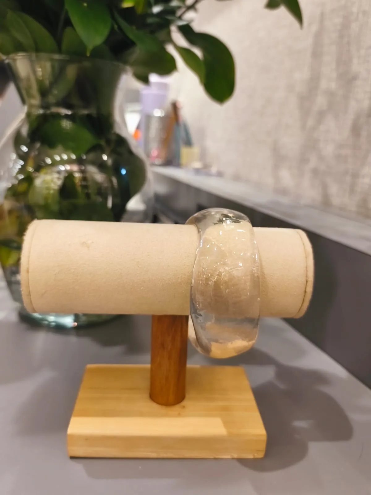 Dica de estilo: combine o bracelete transparente de resina com peças em linho natural ou tecidos acetinados — o contraste entre textura e brilho dá um ar moderno e refinado ao visual. Para um toque fashionista, use-o junto de outros braceletes metálicos finos.