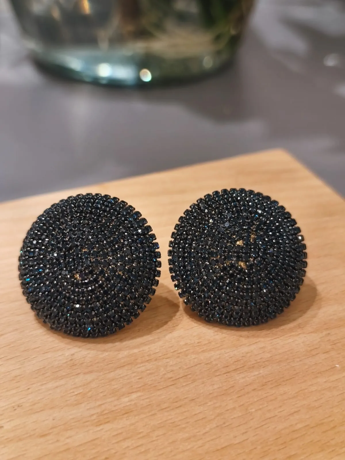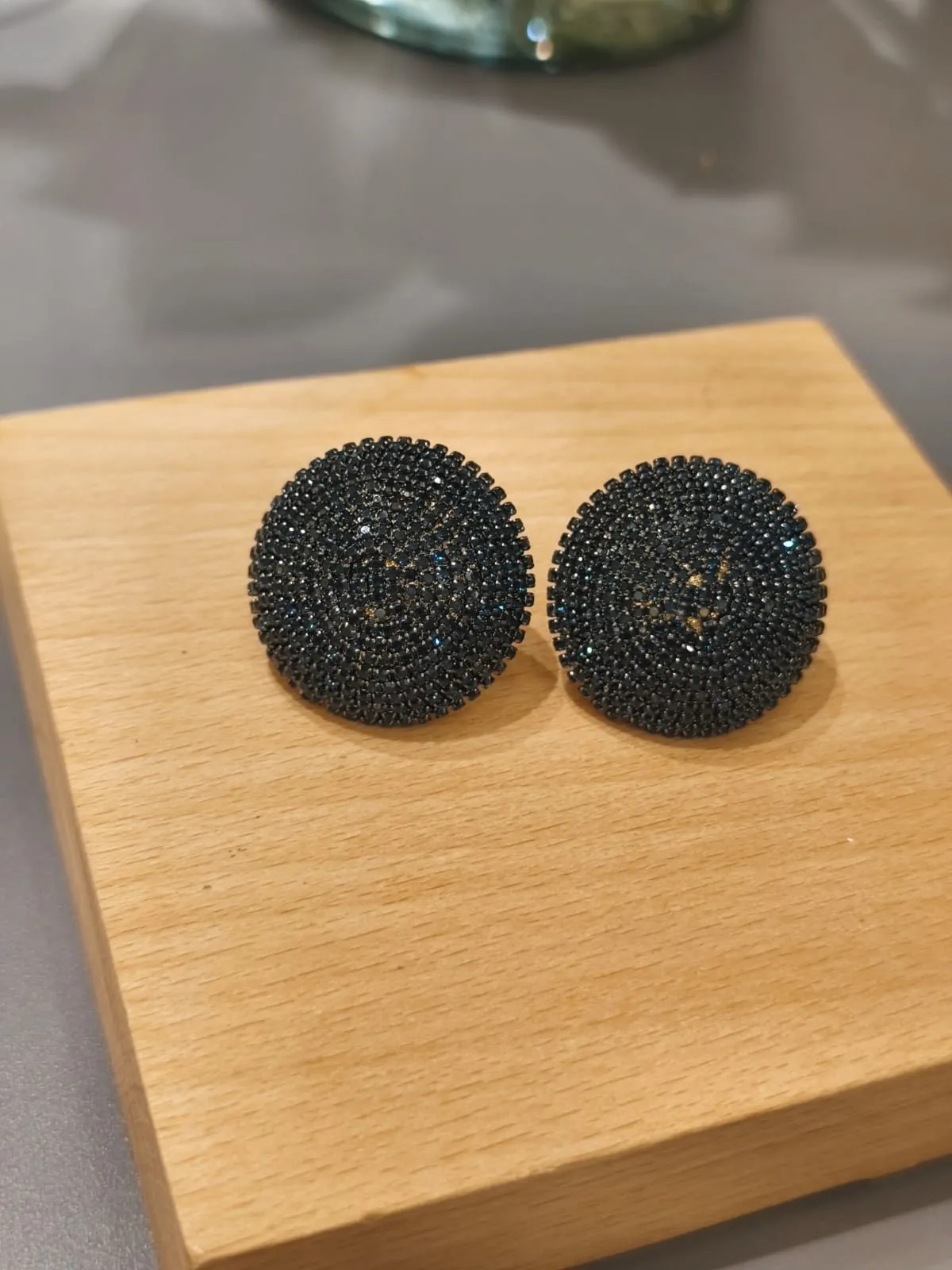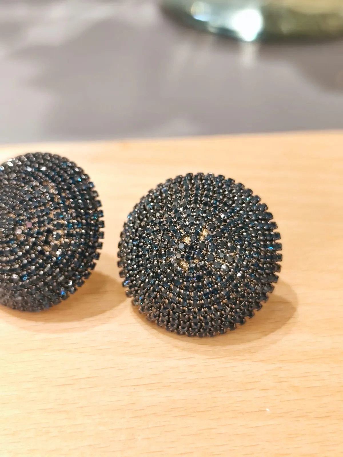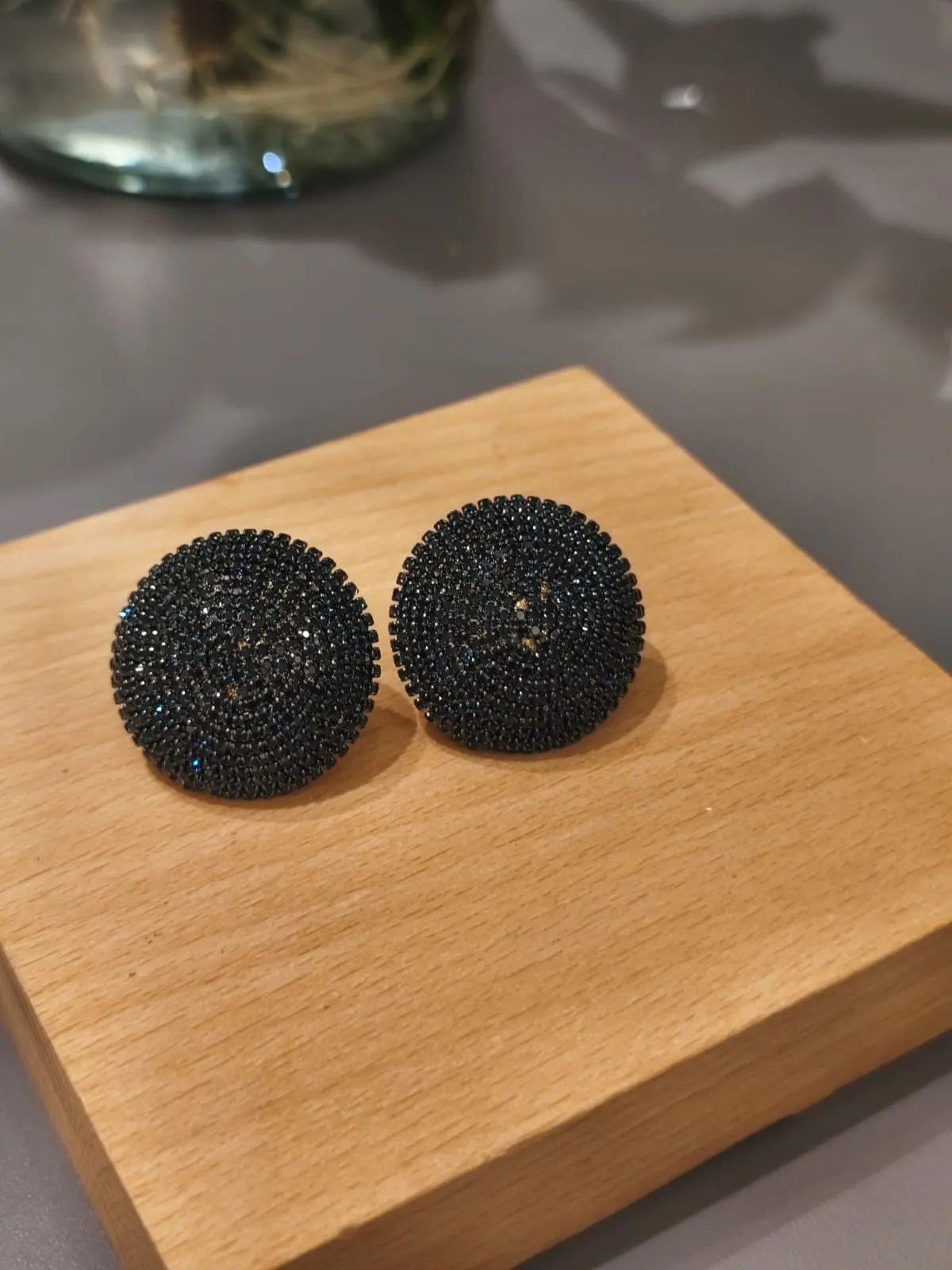 Ficha técnica: metal com banho grafite escuro, aplicação de micro pedrinhas de vidro azul-escuro, formato redondo, acabamento cravejado, fechamento de tarraxa, fabricação nacional, limpeza com flanela seca e armazenamento individual.