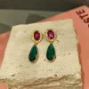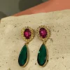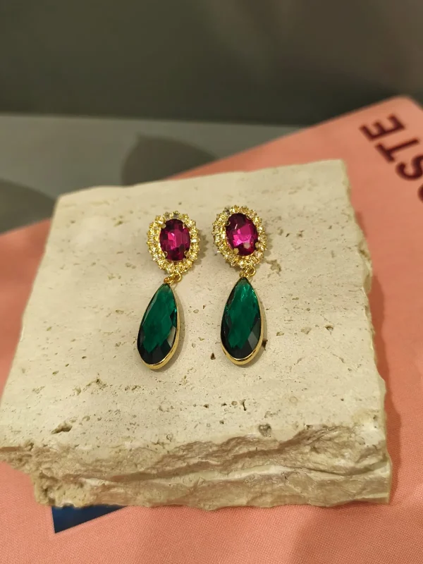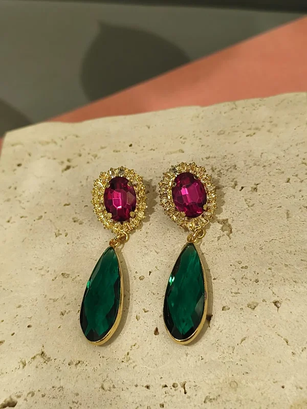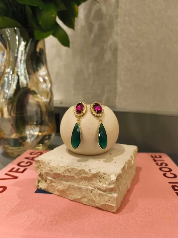 Palavras-chave: brinco dourado, brinco com pedra colorida, brinco elegante, brinco sofisticado, brinco verde e rosa, brinco de festa, acessório feminino.