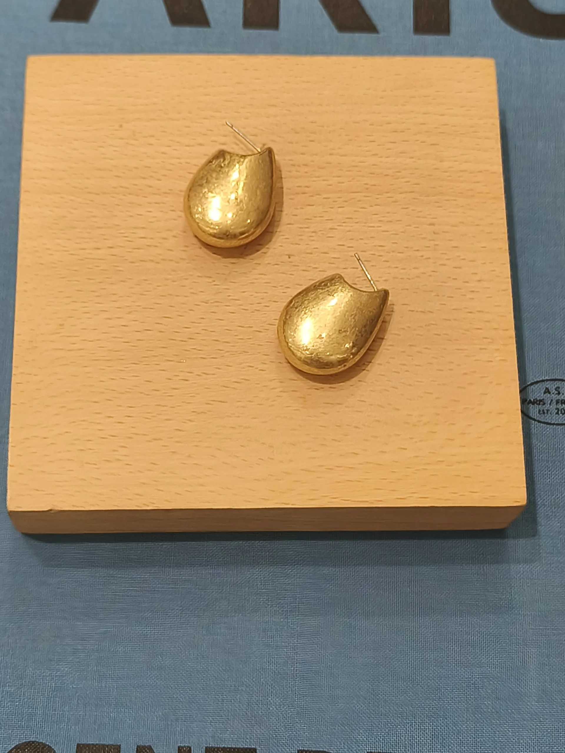 Ficha técnica: composição em metal dourado com acabamento fosco, modelagem compacta em formato de gota orgânica, cor dourado fosco, origem nacional e cuidados que incluem evitar contato com água, perfumes e cremes, além de guardar em local seco e protegido da luz.