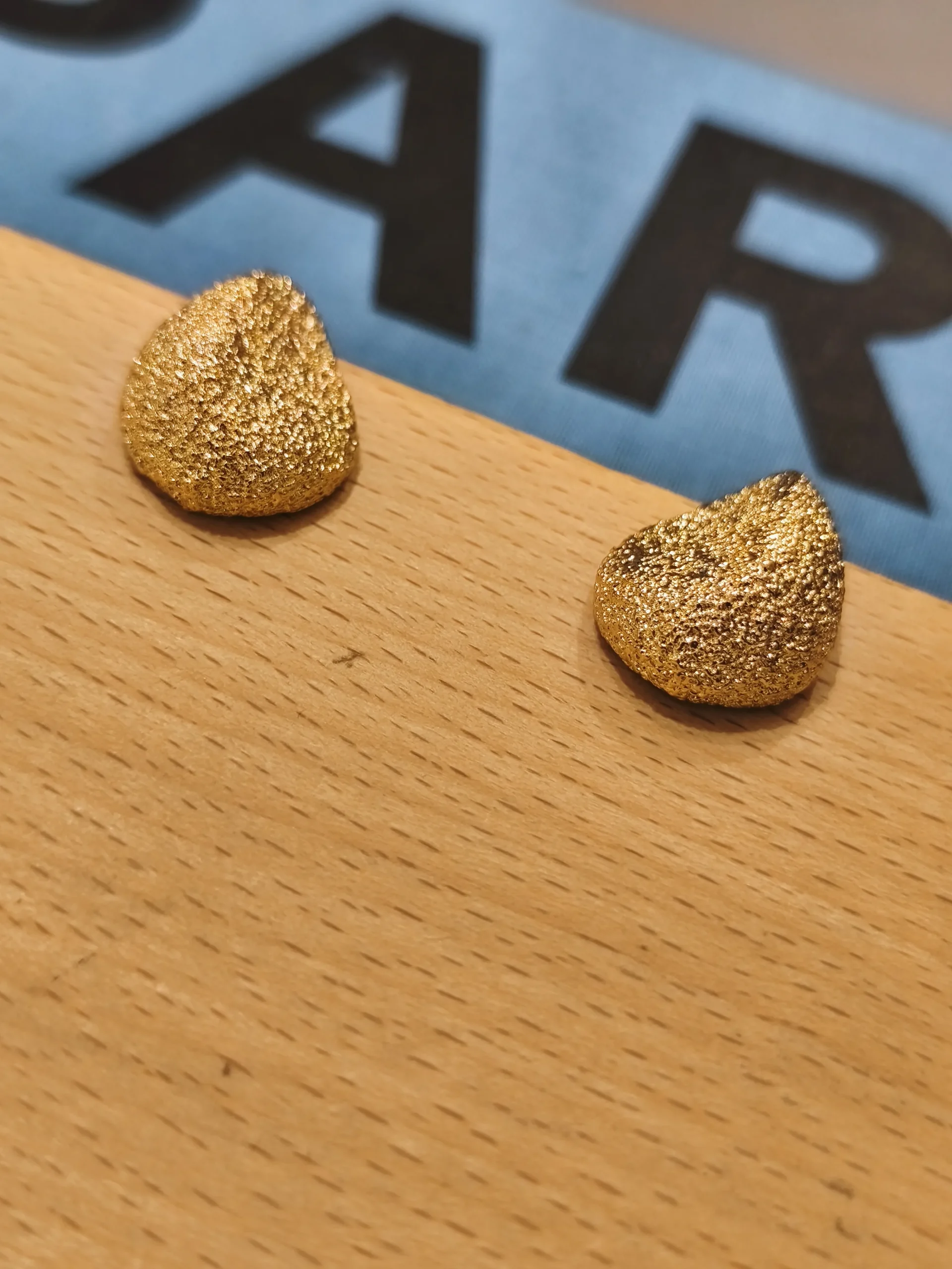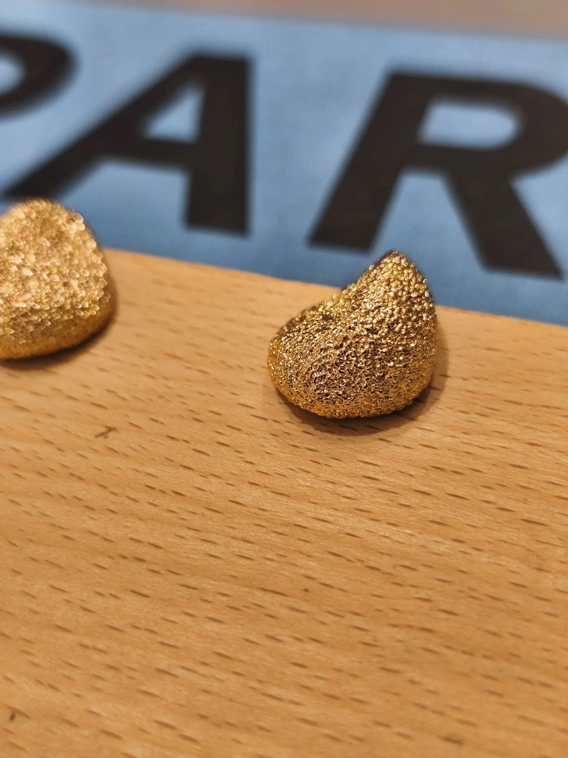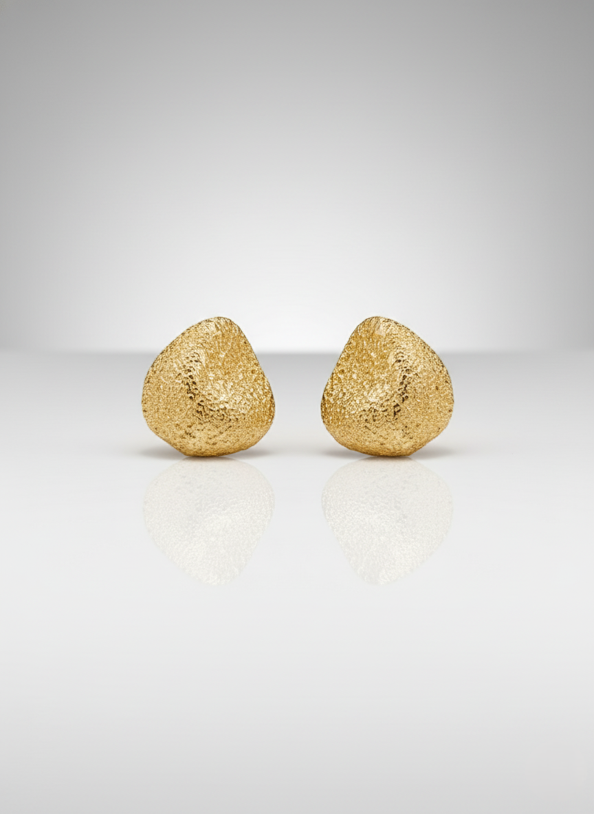 Ficha técnica: peça em metal dourado com textura orgânica, modelagem em gota levemente assimétrica, cor dourado polido texturizado, origem nacional e indicada limpeza com pano macio e seco, evitando contato com água, perfumes ou produtos químicos.