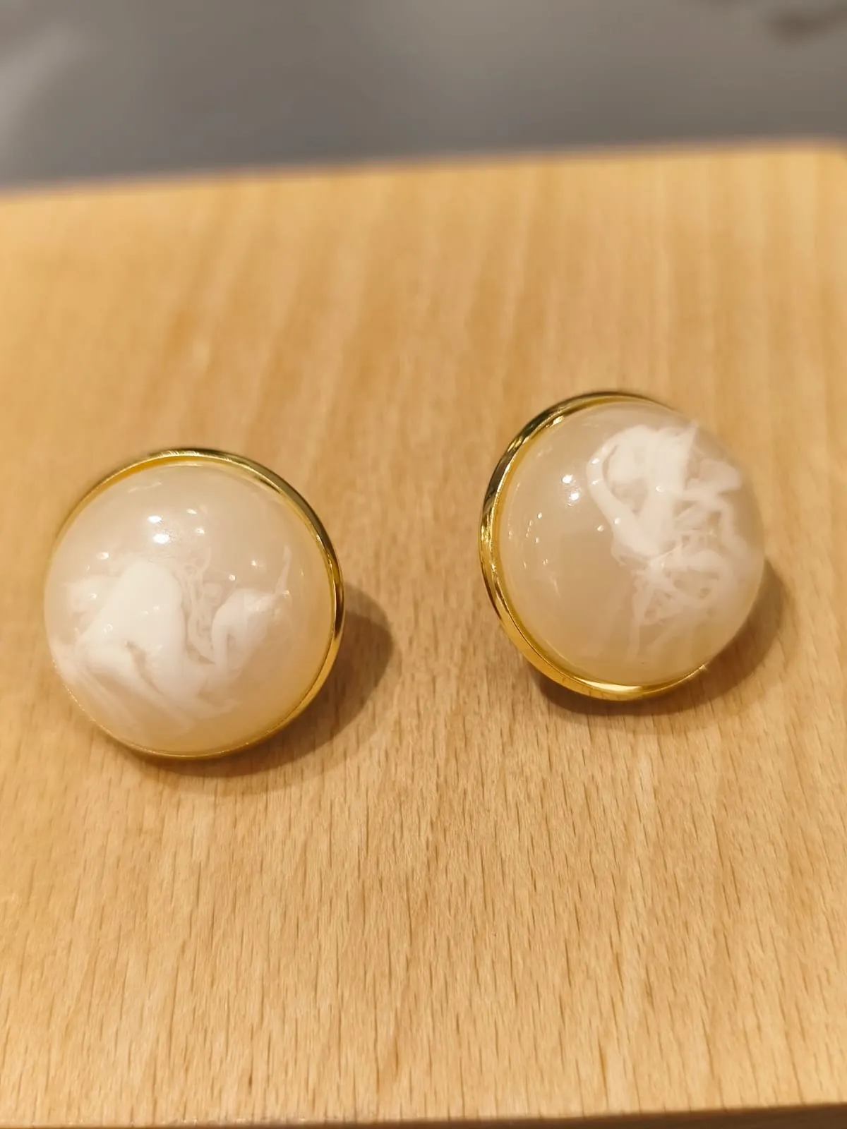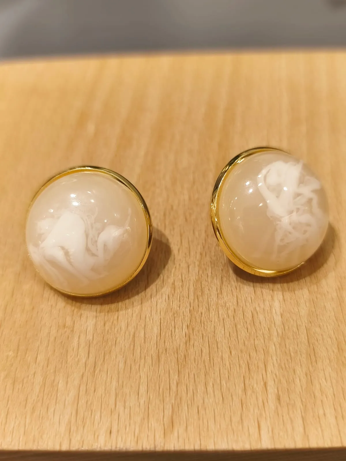 Ficha técnica: metal com banho dourado de alta resistência, aplicação central em resina perolada marmorizada, formato meia esfera, fechamento de pino e tarraxa, acabamento polido, fabricação nacional, limpeza com flanela seca e armazenamento individual.