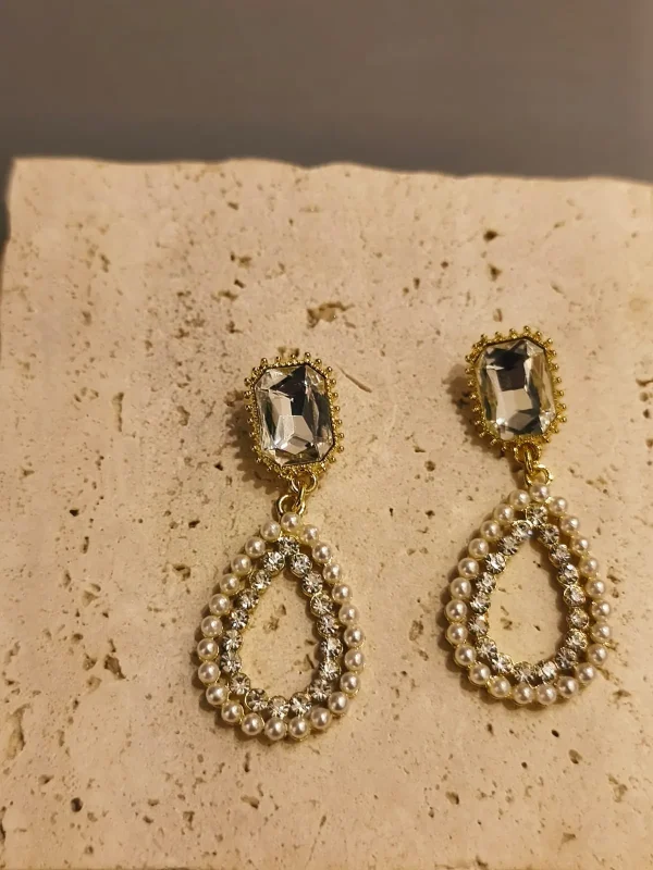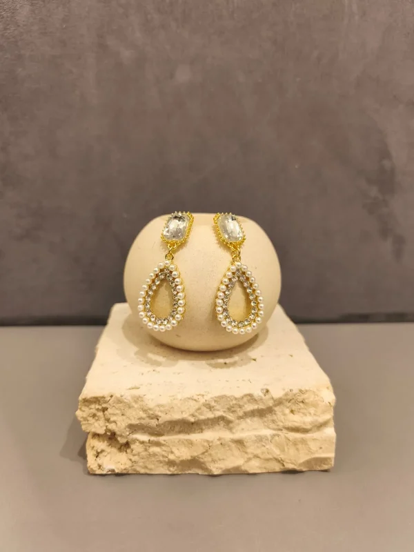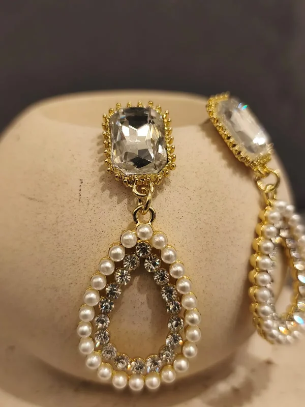 Ficha técnica: confeccionado em metal com banho dourado, base em cristal retangular transparente e pêndulo em formato de gota contornado por pérolas artificiais. Cor dourada com detalhes perolados e cristalinos. Origem nacional. Para conservar, evite contato com água, perfumes ou produtos químicos e guarde em caixa ou saquinho de tecido.