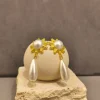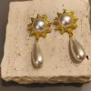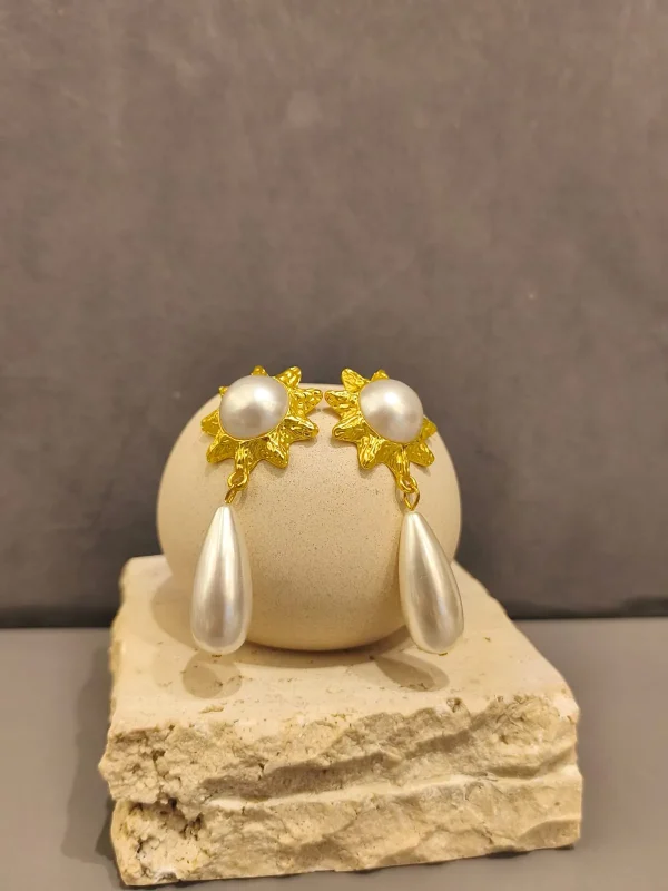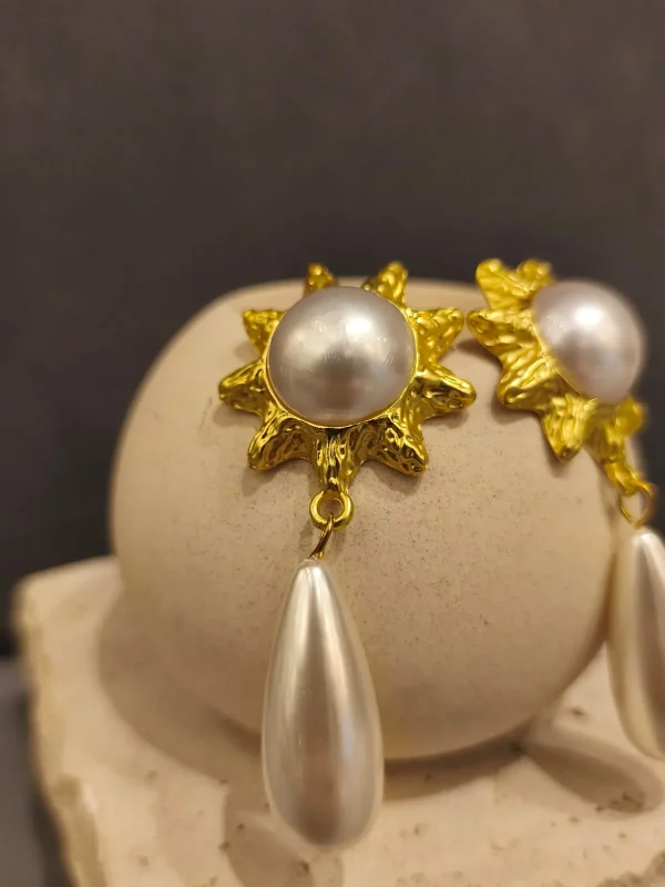 O brinco dourado com pêndulo em pérola é uma peça que une sofisticação clássica e charme marcante. Sua base em formato de flor dourada, com detalhe central em pérola, transmite delicadeza e feminilidade, enquanto o pêndulo alongado em madrepérola confere movimento e elegância ao acessório. É um brinco que ilumina o rosto e transforma qualquer produção, perfeito para quem busca presença e refinamento em ocasiões especiais.