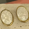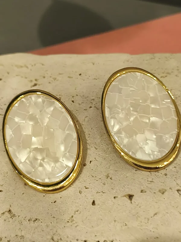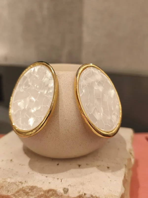 Ficha técnica: confeccionado em metal com banho dourado, formato oval com aplicação central em superfície perolada facetada. Cor dourada com detalhe perolado branco. Origem nacional. Para conservar, evite contato com água, perfumes ou produtos químicos e guarde em caixa ou saquinho de tecido.