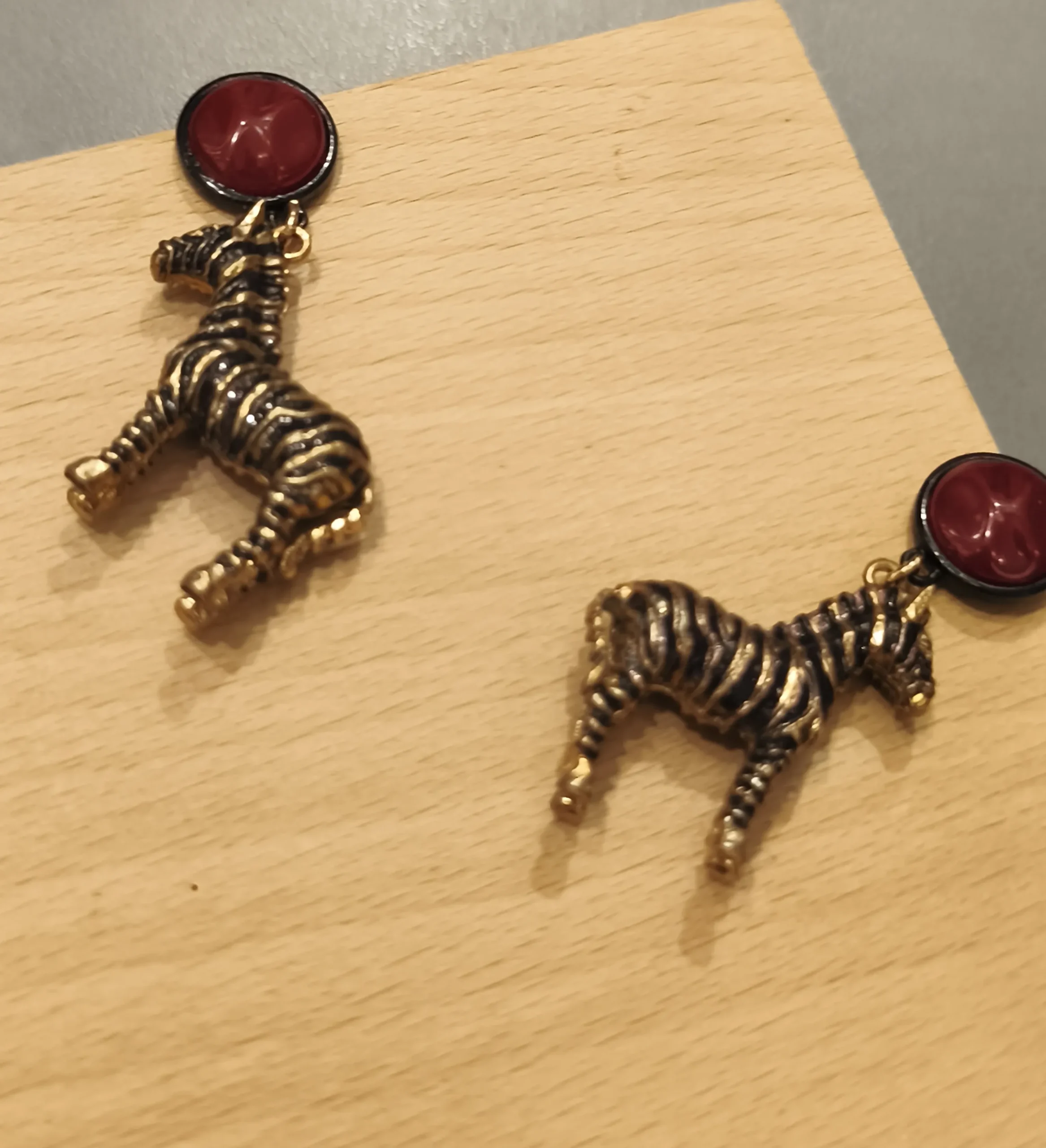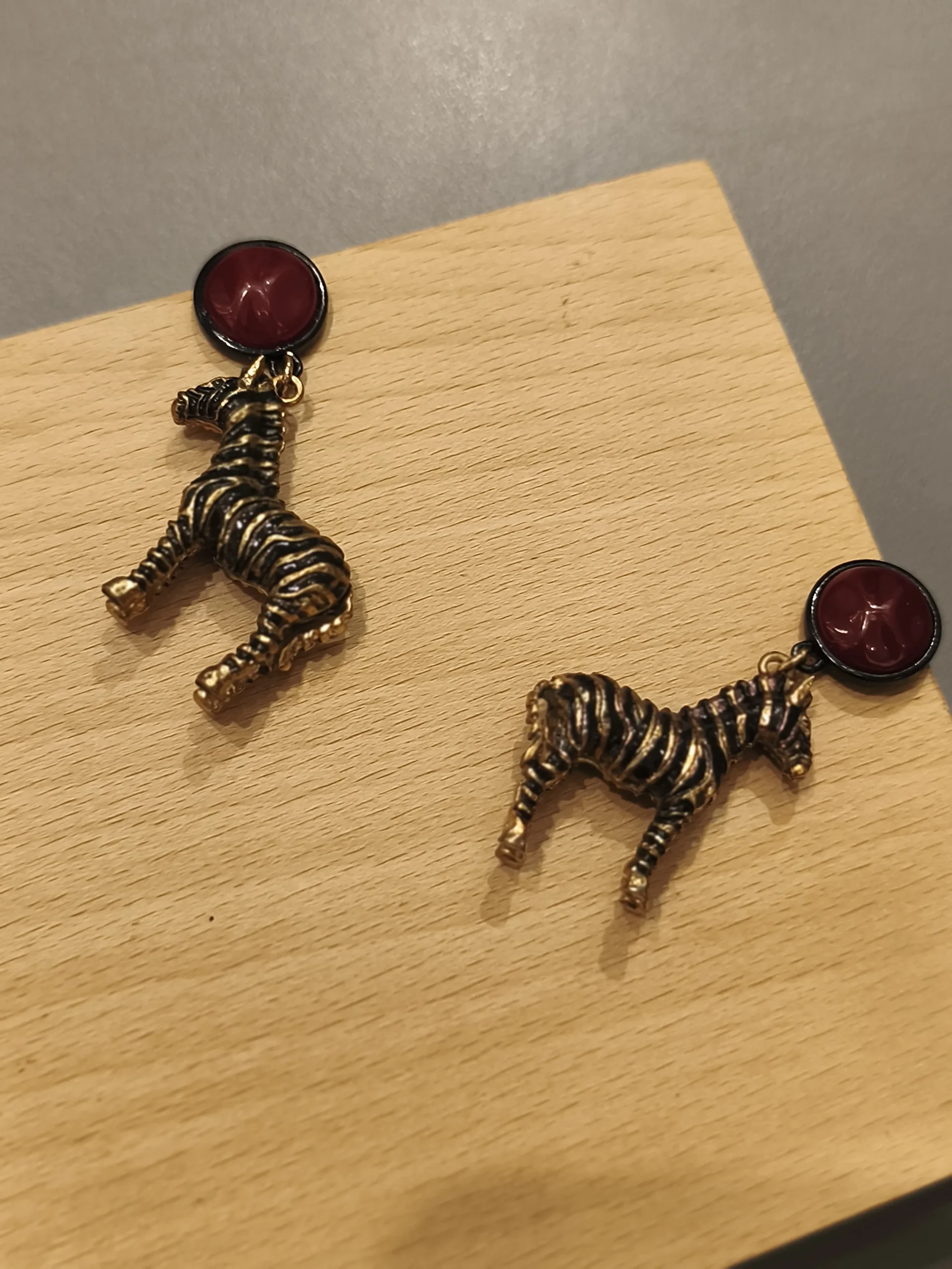 Estes brincos dourados com pingente de zebra 🦓✨ são um charme divertido e sofisticado na medida certa. O topo em resina vinho 🍷 adiciona profundidade e elegância, enquanto o pingente dourado em formato de zebra traz um toque criativo e lúdico, transformando o acessório em uma peça cheia de personalidade. O contraste entre o dourado envelhecido e o vermelho intenso cria uma combinação rica e moderna, perfeita para quem gosta de ousar com estilo. Leves e cheios de movimento, eles são ideais para iluminar o rosto e dar um toque fashionista ao visual.