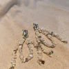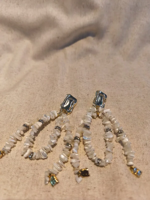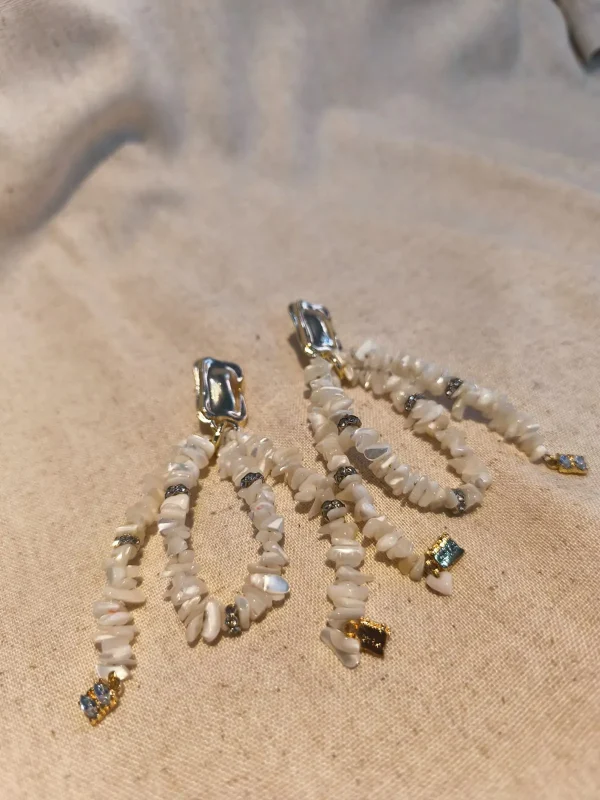 Com fios longos de pedrinhas claras intercaladas por detalhes metálicos e toques de brilho, ele cria um efeito leve e sofisticado, perfeito para quem ama acessórios marcantes.