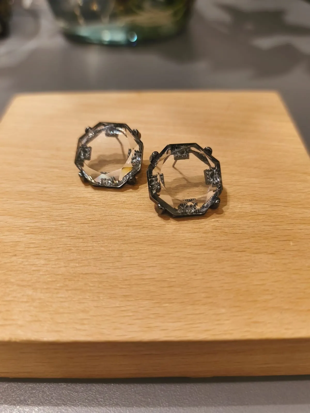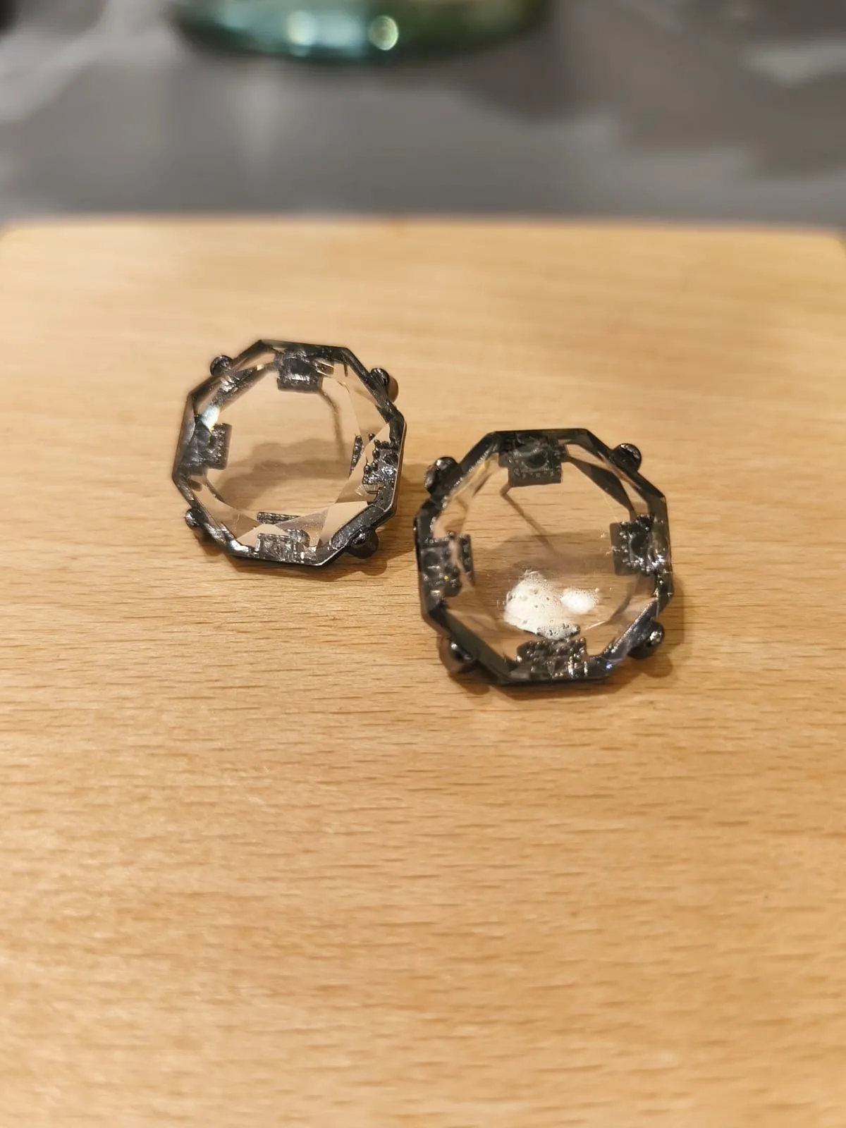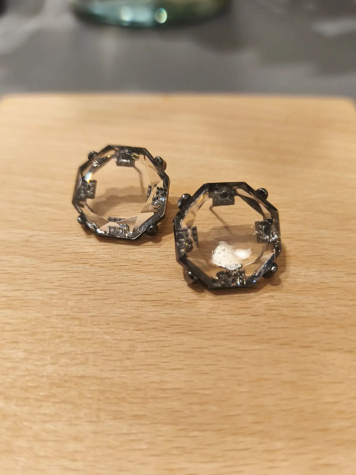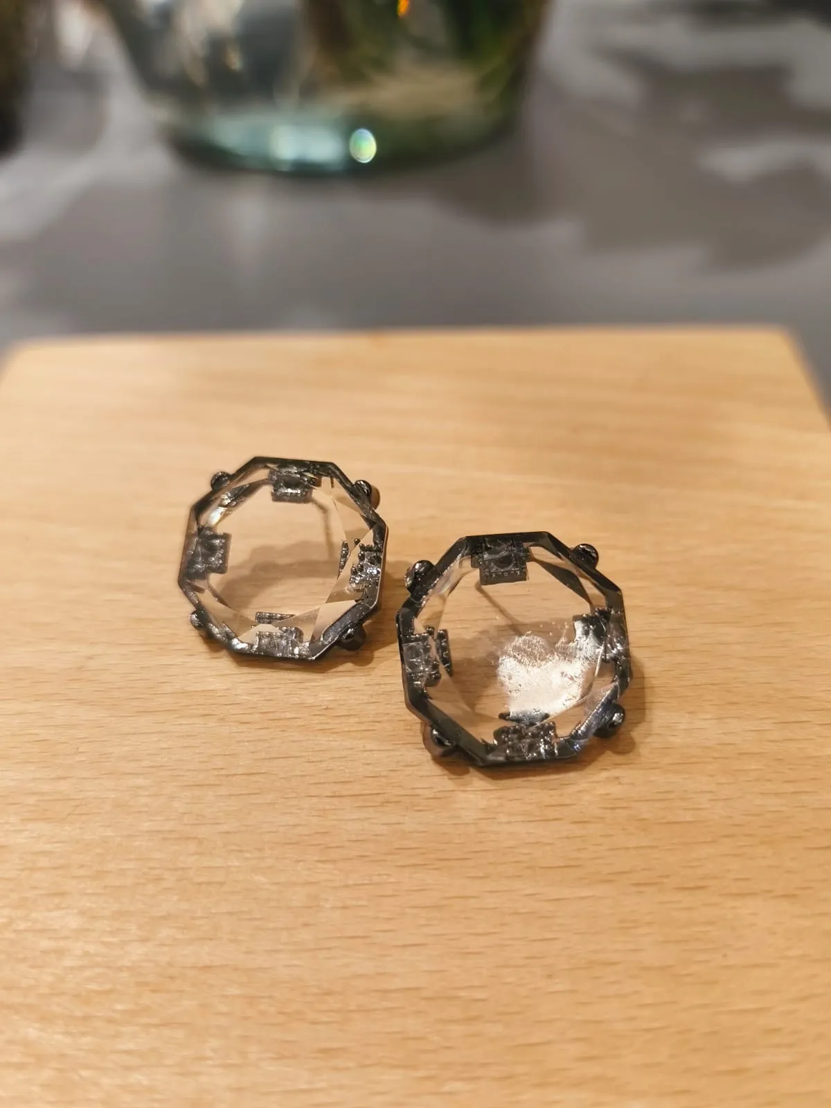 Ficha técnica: metal com banho ônix escuro, pedra de vidro facetada em formato geométrico octogonal, fechamento de tarraxa, cor ônix e cristal transparente, fabricação nacional, limpeza com flanela seca e armazenamento individual.