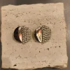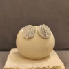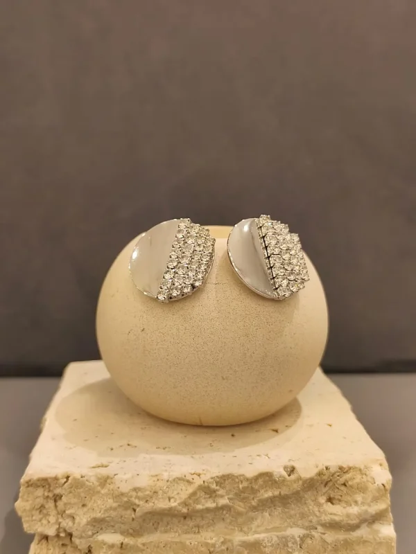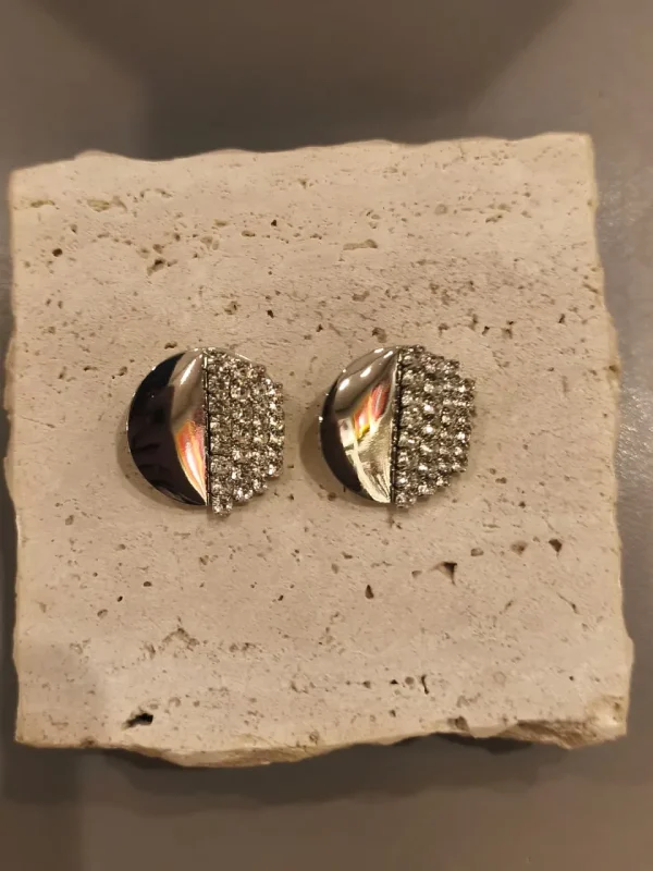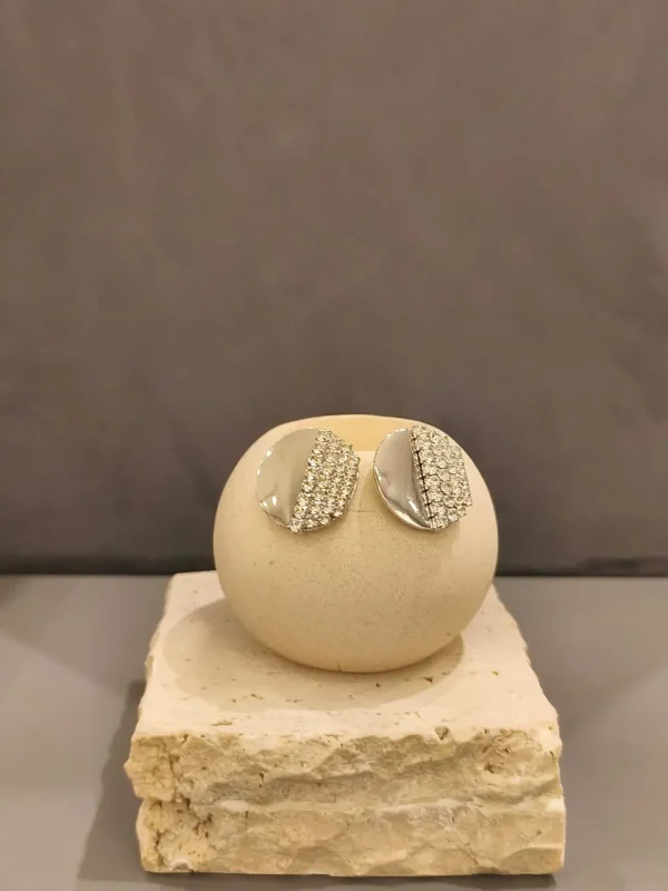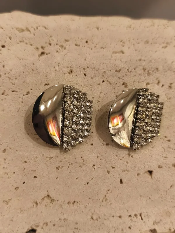 O brinco prateado com detalhe em strass é a definição de sofisticação minimalista com um toque de brilho na medida certa. Sua base arredondada em metal polido traz um ar moderno e geométrico, enquanto a aplicação delicada de fileiras de cristais adiciona luminosidade e glamour sem exageros. É uma peça versátil, que pode ser usada tanto no dia a dia, elevando produções básicas, quanto em eventos especiais, garantindo um visual refinado e elegante.