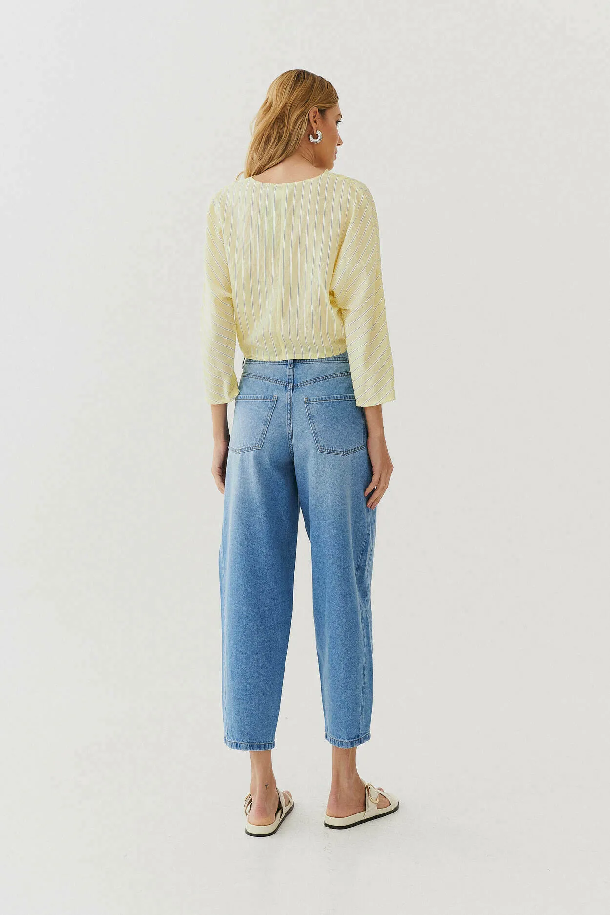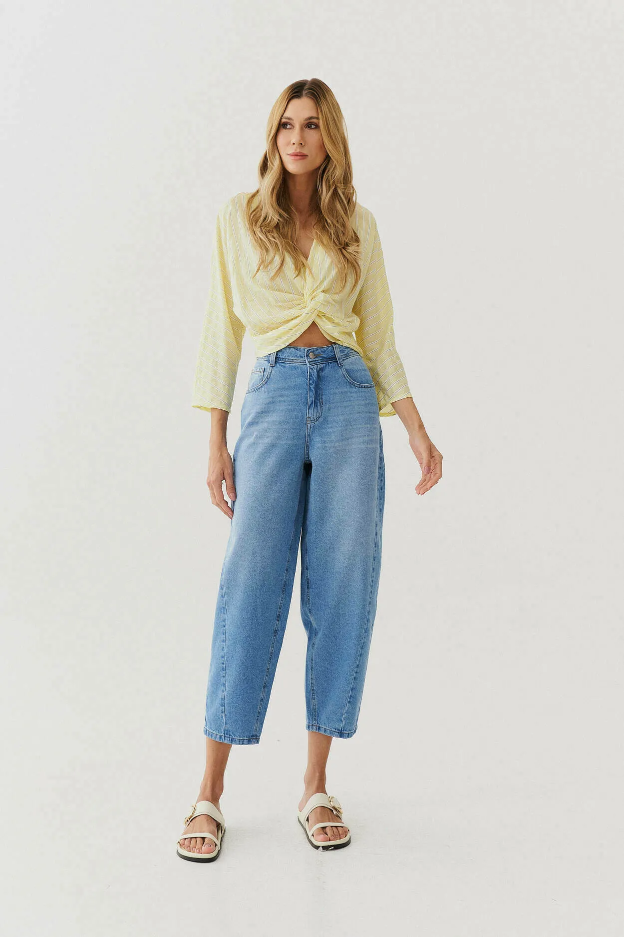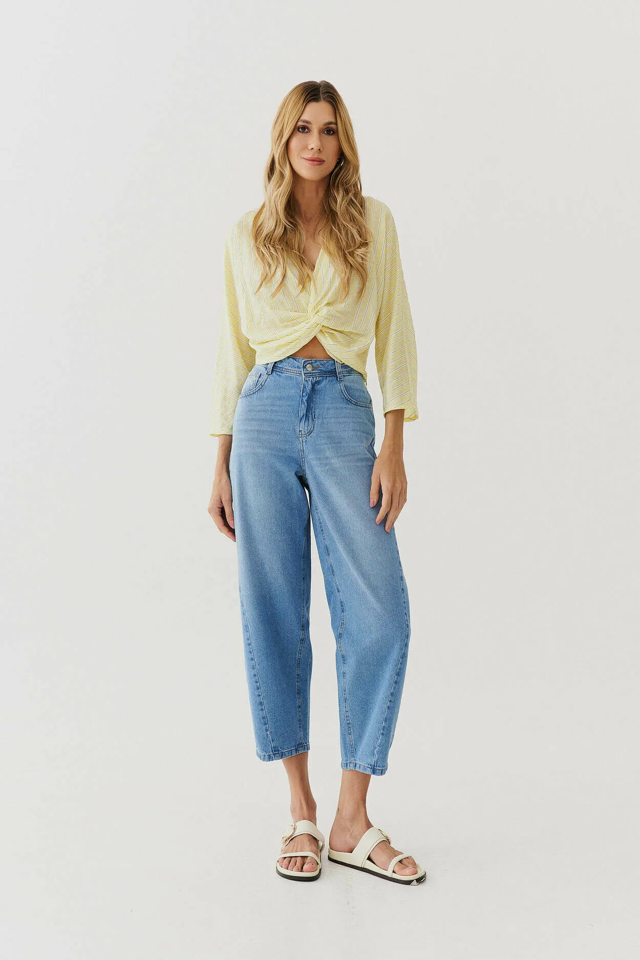 Ficha técnica: Calça confeccionada em jeans 100% algodão. Modelagem barrel com cintura alta, bolsos laterais funcionais, bolso quadrado nas costas e passantes no cós. Cor: azul médio. Origem: nacional. Cuidados: lavar separadamente, em água fria, do avesso; não usar alvejante; secar à sombra; passar em temperatura média.