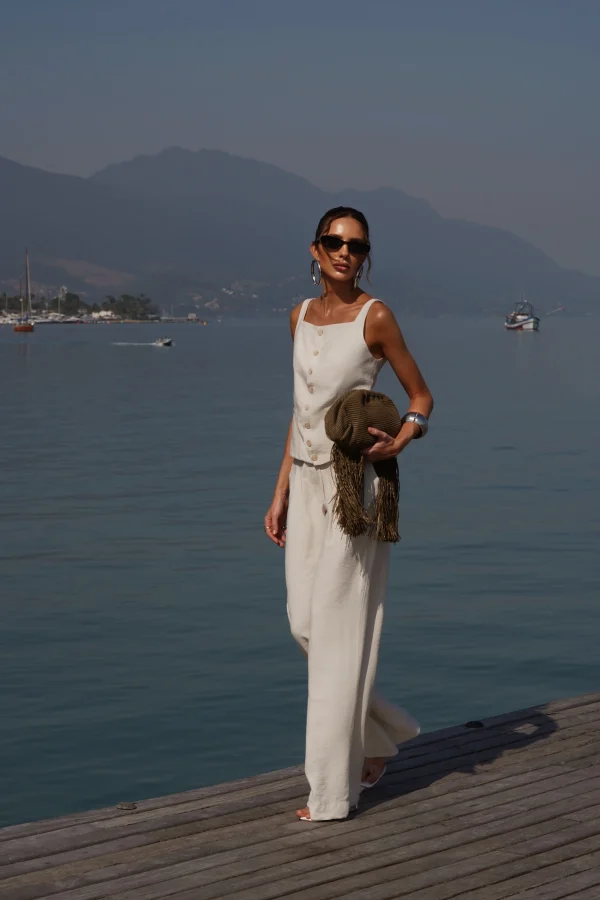 Com modelagem reta e soltinha, cintura alta e elástico no cós, valoriza a silhueta enquanto garante liberdade de movimento. É prática, versátil e atemporal — perfeita para te acompanhar do trabalho ao fim de semana com o mesmo charme.