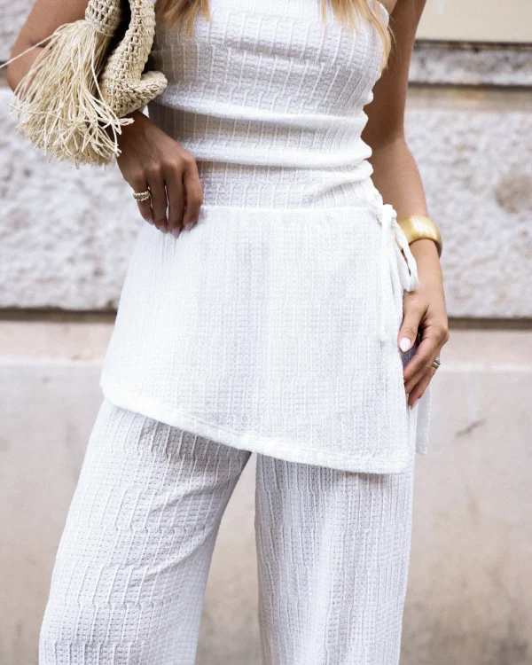 Calça Blanca Kaele é sinônimo de conforto e sofisticação fácil. Em malha canelada de toque macio, a peça tem caimento leve e elegante, perfeito para acompanhar sua rotina do trabalho ao fim de semana. O tom off-white ilumina o visual e combina com tudo, enquanto a textura canelada acrescenta informação de moda sem exageros.