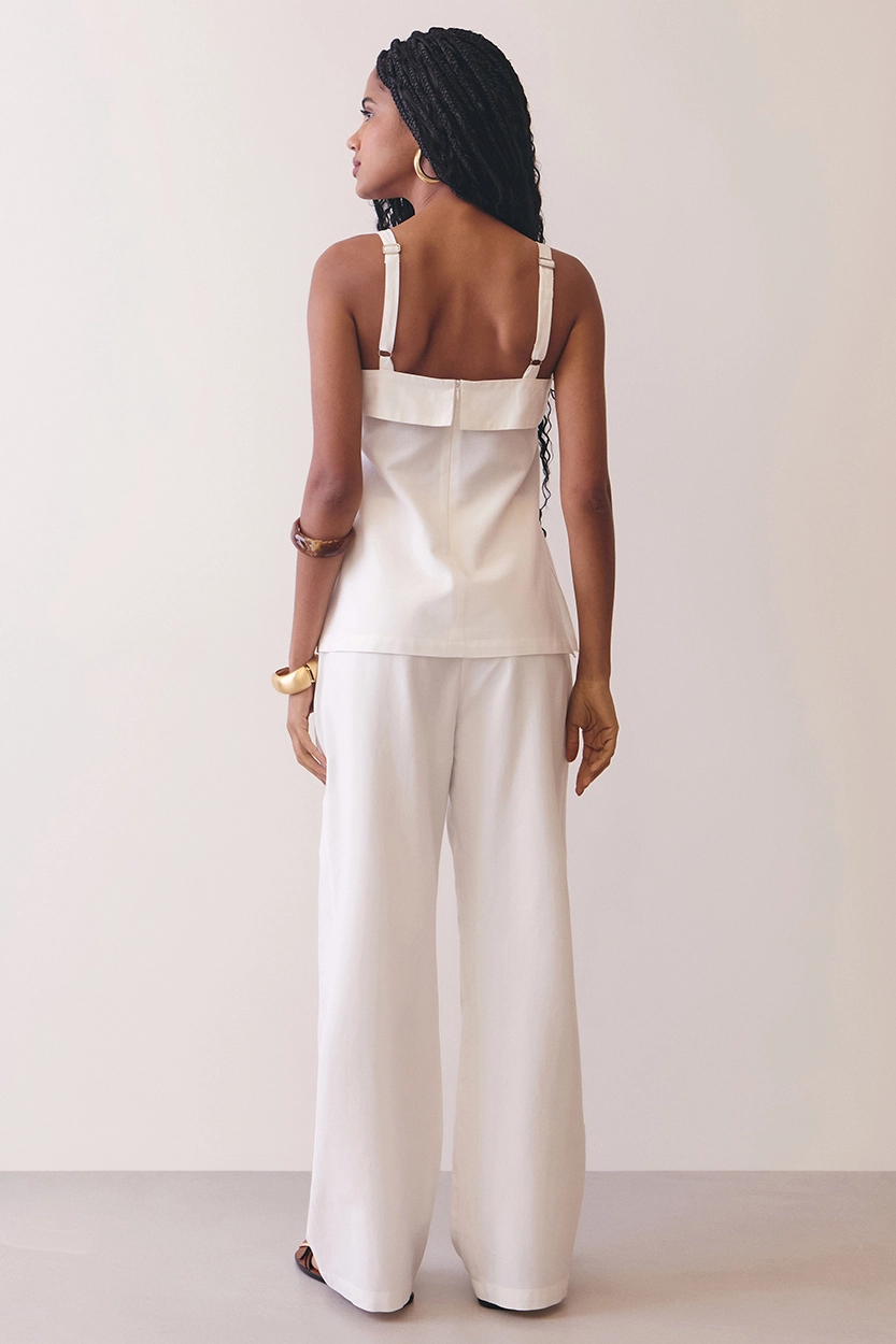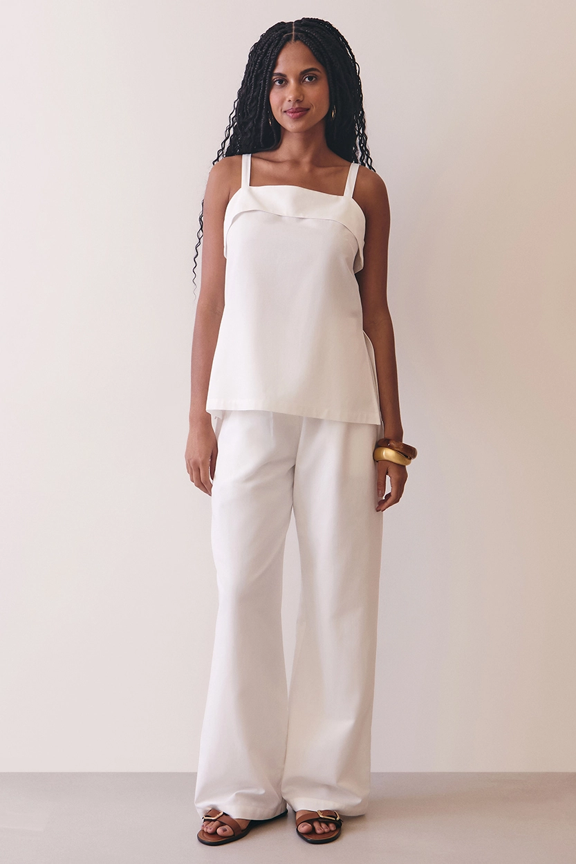 Dica de estilo: combine com uma camisa de linho levemente aberta e sandálias de salto blocado para um look de trabalho elegante, ou use com uma regata de seda e rasteiras neutras para um visual de fim de semana chique e confortável.