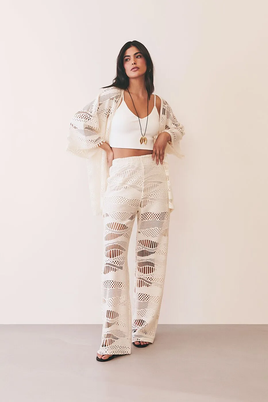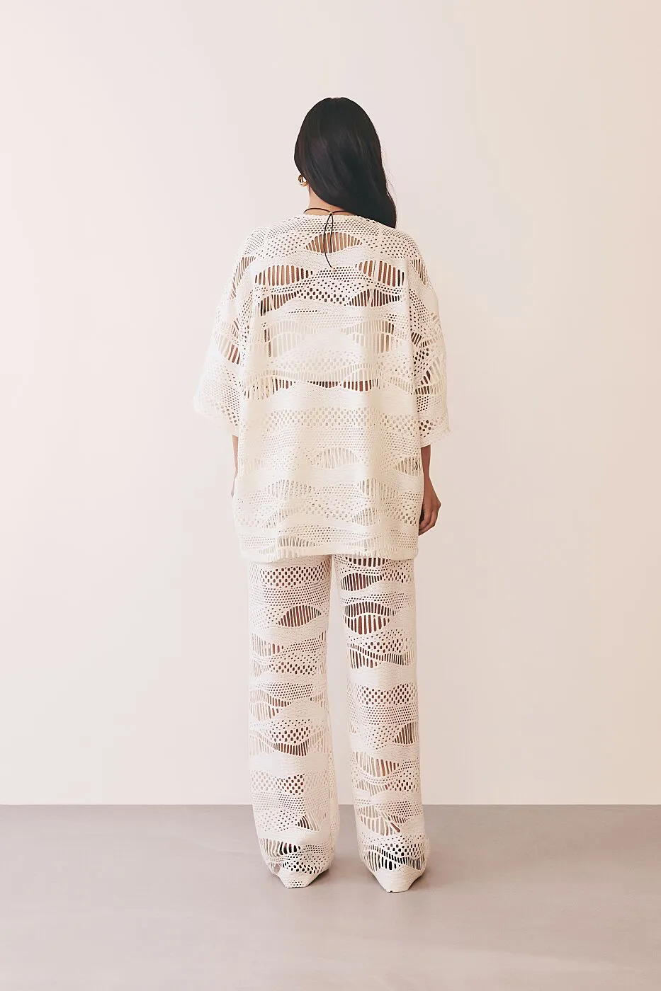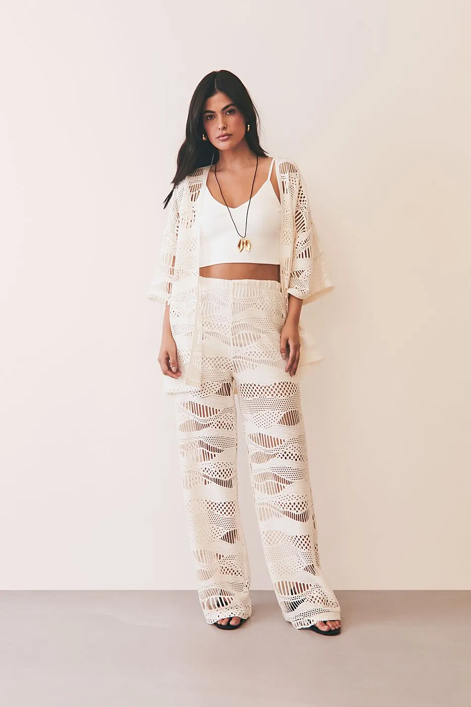 A calça crochê é a perfeita tradução da elegância artesanal com um toque moderno e leve. Feita em crochê delicado com mistura de poliéster e algodão, ela tem textura rica, toque macio e transparência sutil que revela o corpo de maneira sofisticada. A modelagem reta e fluida alonga a silhueta, enquanto o tom cru reforça o estilo natural e atemporal da peça. É uma calça versátil e elegante, ideal para produções de verão que equilibram conforto e estilo — perfeita para um look resort chic ou uma saída de praia sofisticada.