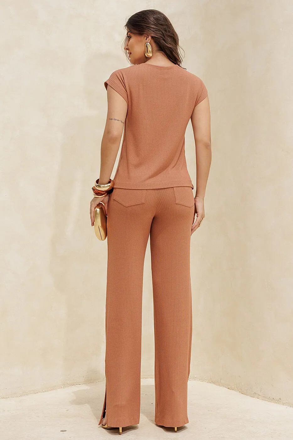 Dica de estilo: combine a calça det/lateral com a blusa manga morcego no mesmo tom para um conjunto monocromático que transmite elegância e harmonia. Complete o visual com acessórios dourados ou de resina e uma clutch metálica para um toque refinado. Ideal para ocasiões casuais elegantes, jantares ou ambientes de trabalho sofisticados.