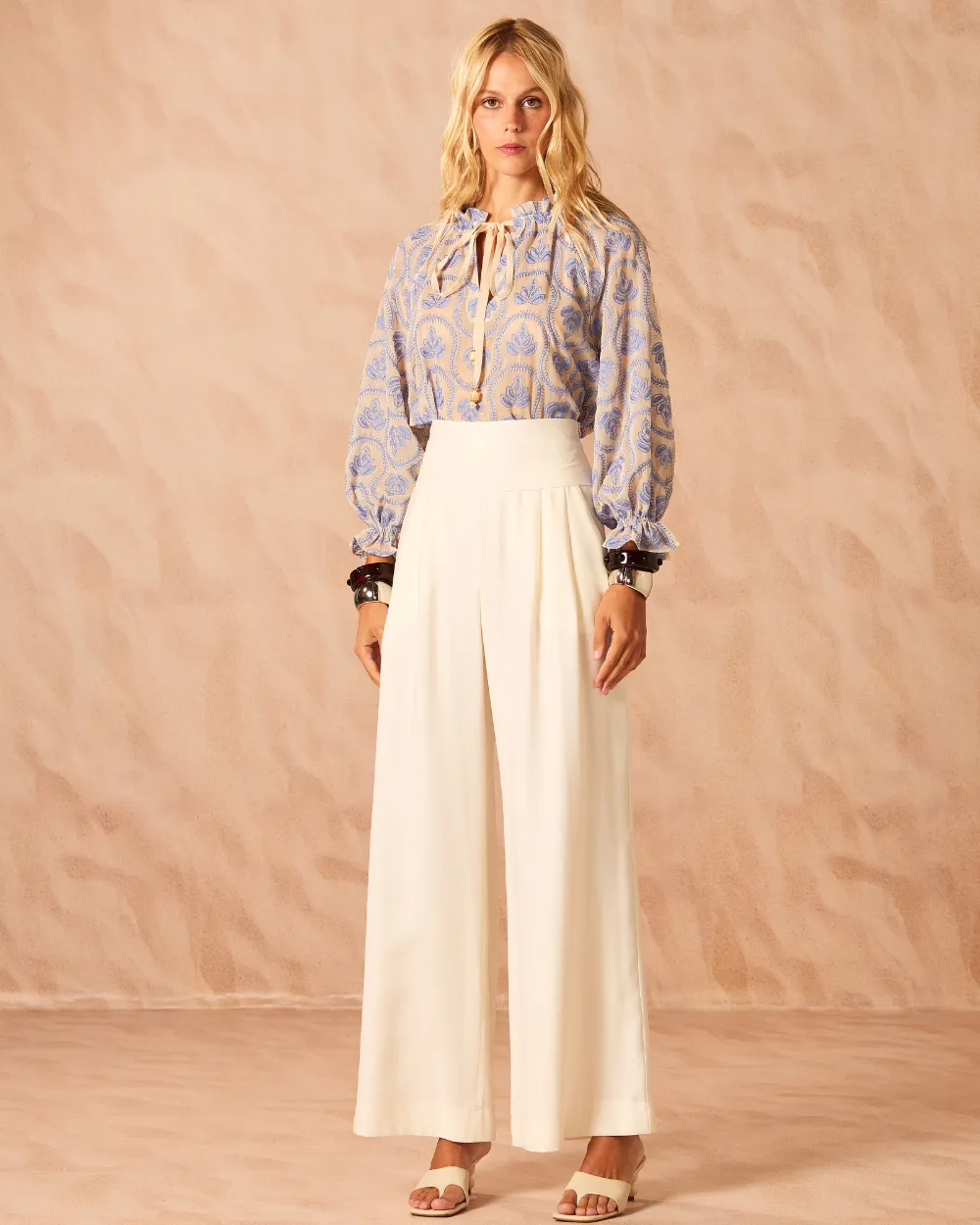 Ficha técnica: confeccionada em tecido leve de toque macio e caimento fluido, não possui forro, modelagem ampla com cintura confortável e acabamento refinado, cor off-white, peça de origem nacional, recomenda-se lavar à mão ou em ciclo delicado, não usar alvejante, não torcer e secar à sombra para preservar a durabilidade da calça feminina sofisticada.