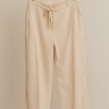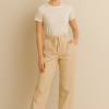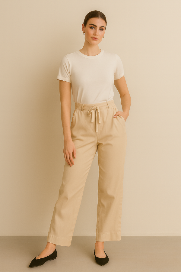 Calça em tecido leve e confortável na cor bege, perfeita para composições elegantes e práticas do dia a dia. O modelo conta com cós ajustável com amarração frontal, que garante praticidade e um toque descontraído, além de bolsos laterais funcionais.