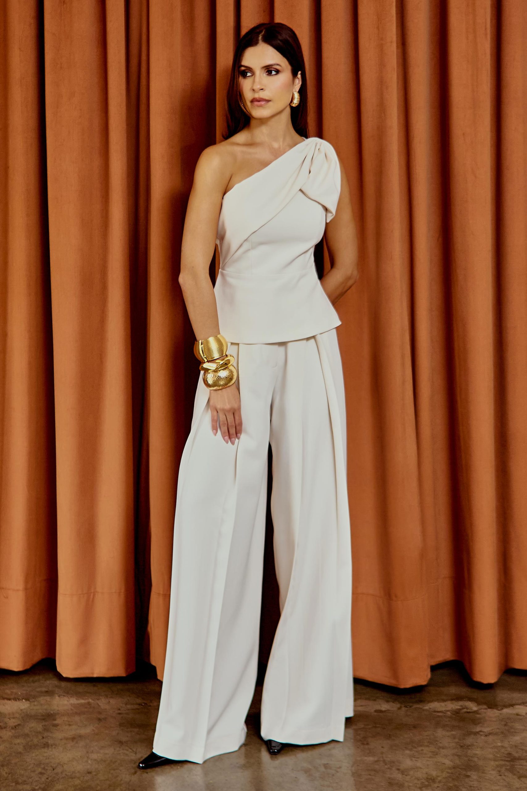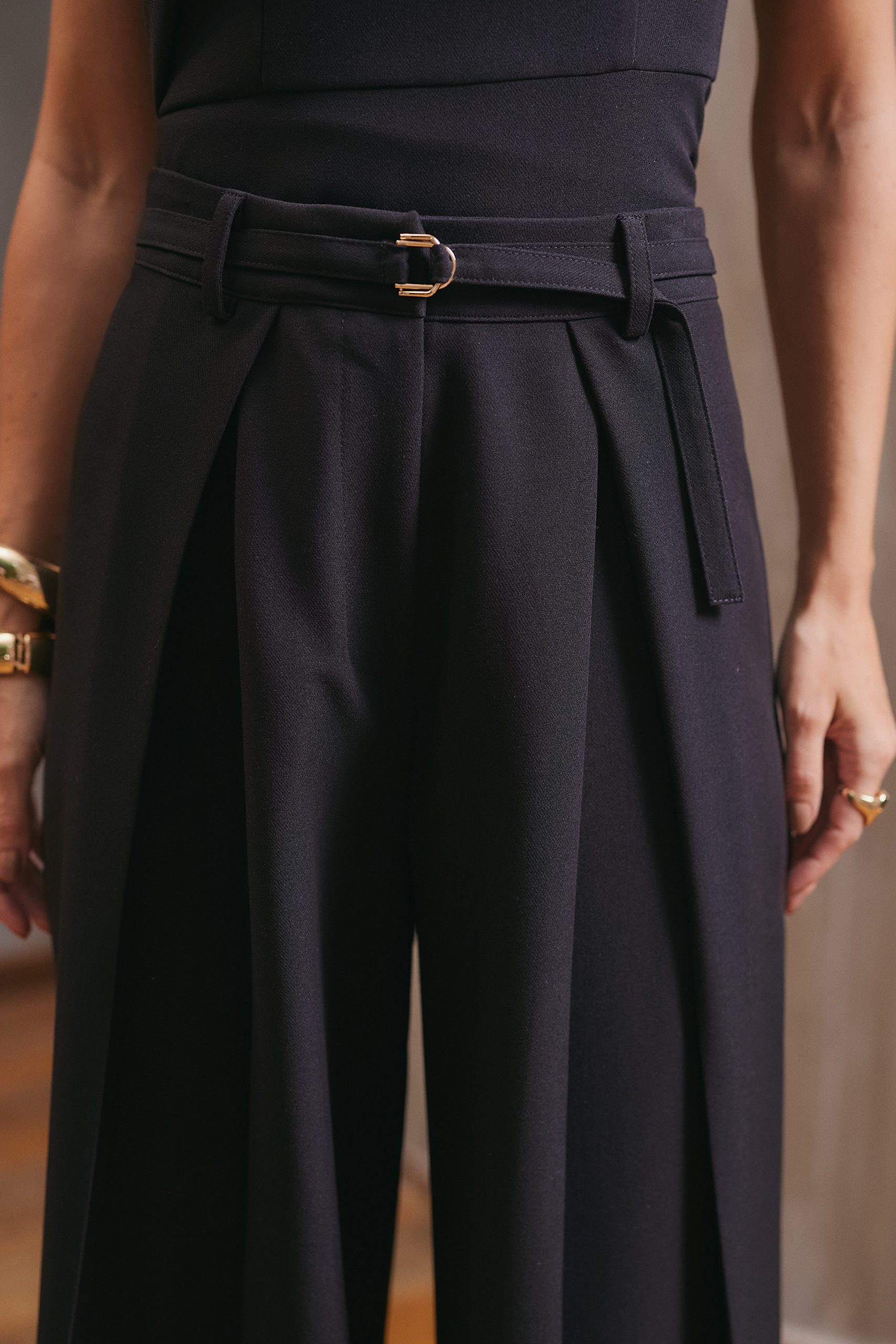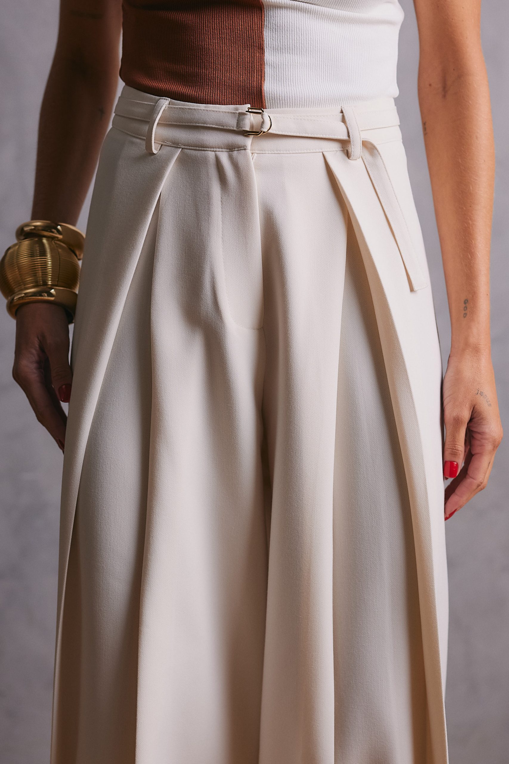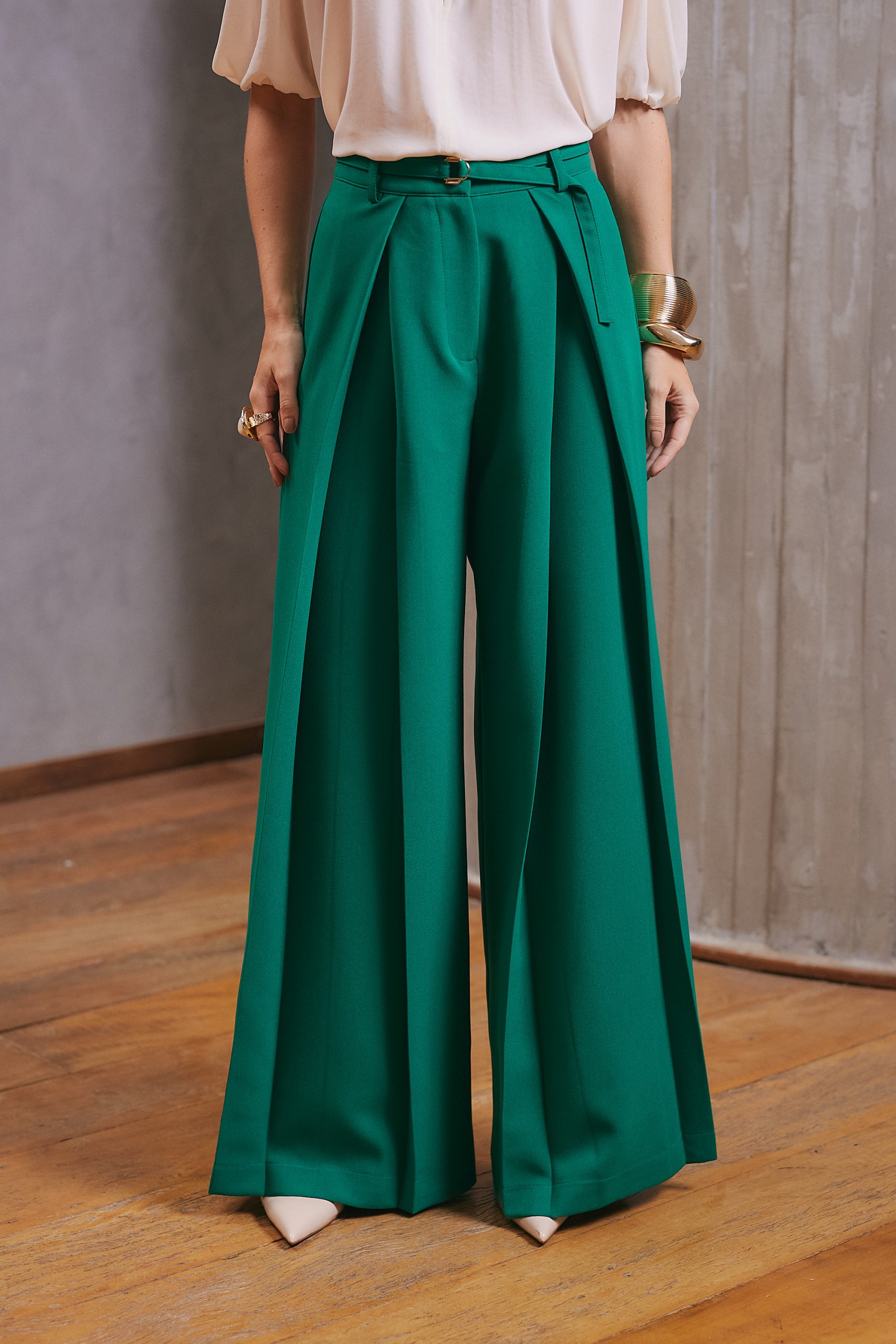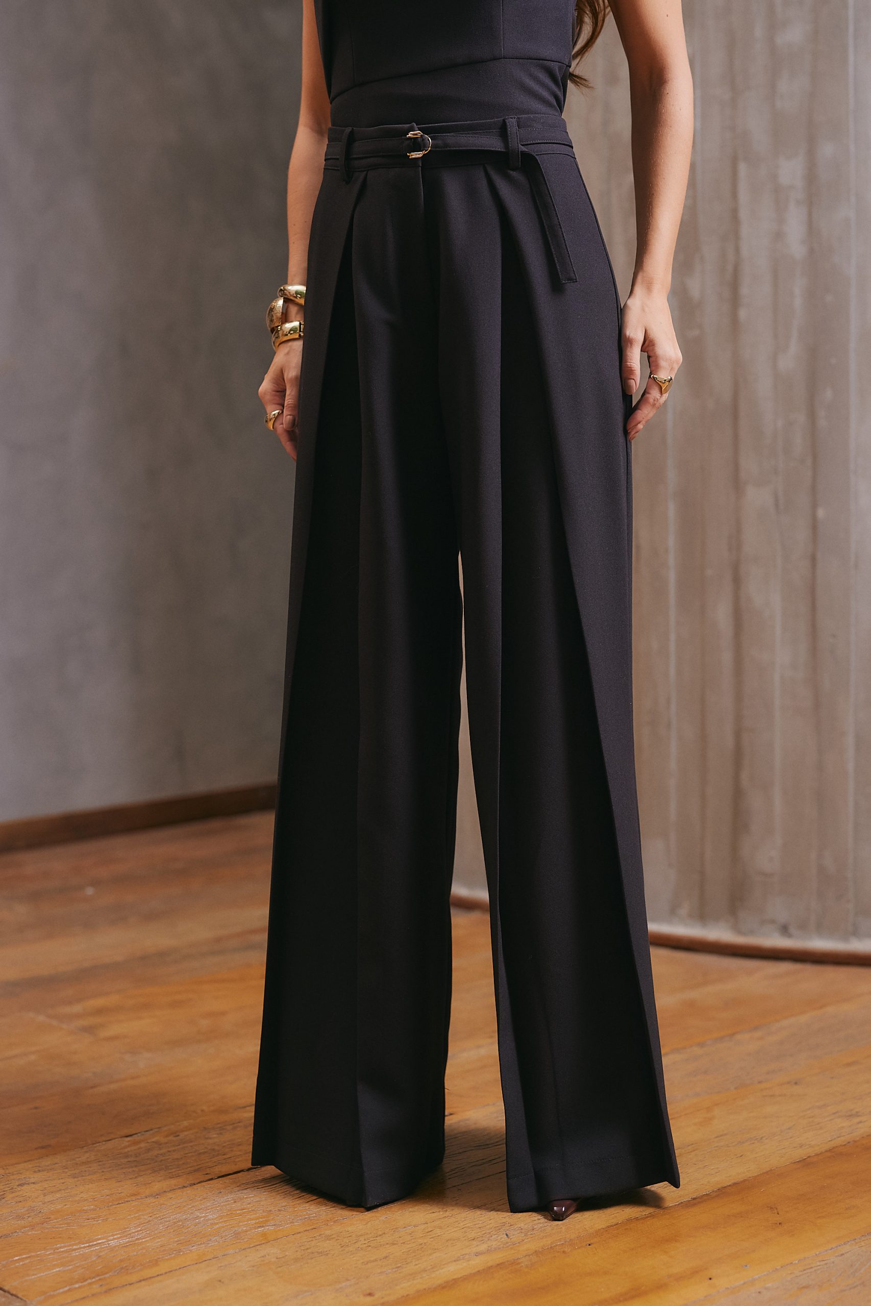 Calça confeccionada em tecido plano, com modelagem de alfaiataria que garante caimento encorpado e sofisticado. Possui pregas frontais e pence posterior, que valorizam a silhueta com elegância. O fechamento frontal é feito por zíper na vista, fecho social e botão de segurança, assegurando melhor ajuste e acabamento refinado. Acompanha cinto do próprio tecido, finalizado com fivela dupla de metal, que acrescenta um toque moderno ao design. É uma peça atemporal e casual, perfeita para compor diversos looks.